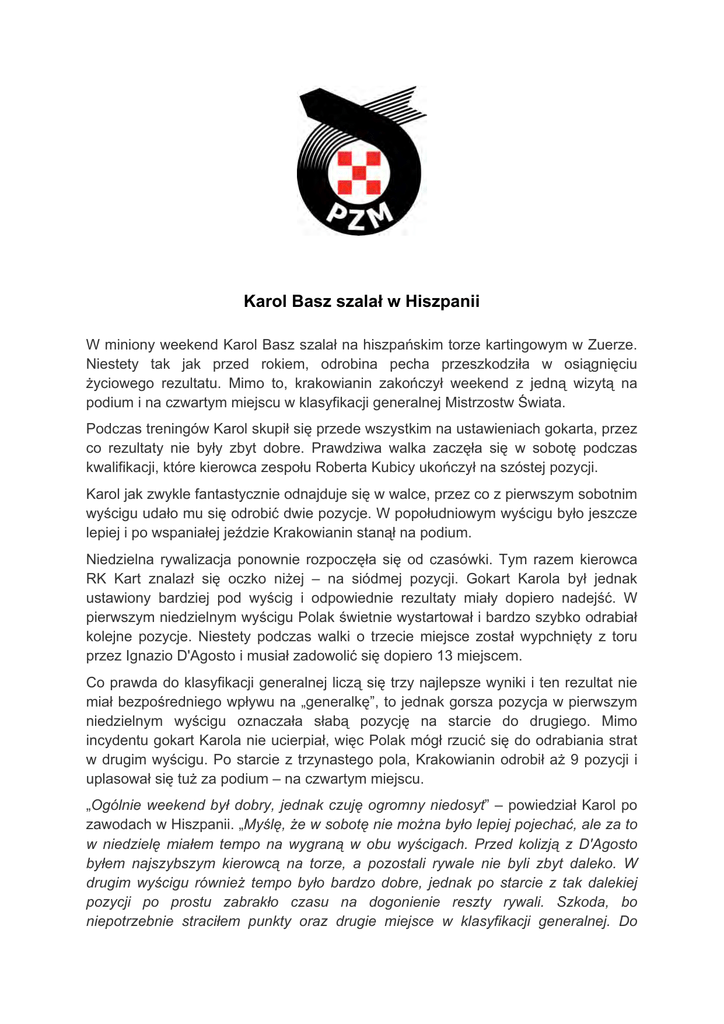 Karol Basz szalał w Hiszpanii W miniony weekend Karol Basz szalał na hiszpańskim torze kartingowym w Zuerze. Niestety tak jak przed rokiem, odrobina pecha przeszkodziła w osiągnięciu życiowego rezultatu. Mimo to, krakowianin zakończył weekend z jedną wizytą na podium i na czwartym miejscu w klasyfikacji generalnej Mistrzostw Świata. Podczas treningów Karol skupił się przede wszystkim na ustawieniach gokarta, przez co rezultaty nie były zbyt dobre. Prawdziwa walka zaczęła się w sobotę podczas kwalifikacji, które kierowca zespołu Roberta Kubicy ukończył na szóstej pozycji. Karol jak zwykle fantastycznie odnajduje się w walce, przez co z pierwszym sobotnim wyścigu udało mu się odrobić dwie pozycje. W popołudniowym wyścigu było jeszcze lepiej i po wspaniałej jeździe Krakowianin stanął na podium. Niedzielna rywalizacja ponownie rozpoczęła się od czasówki. Tym razem kierowca RK Kart znalazł się oczko niżej – na siódmej pozycji. Gokart Karola był jednak ustawiony bardziej pod wyścig i odpowiednie rezultaty miały dopiero nadejść. W pierwszym niedzielnym wyścigu Polak świetnie wystartował i bardzo szybko odrabiał kolejne pozycje. Niestety podczas walki o trzecie miejsce został wypchnięty z toru przez Ignazio D'Agosto i musiał zadowolić się dopiero 13 miejscem. Co prawda do klasyfikacji generalnej liczą się trzy najlepsze wyniki i ten rezultat nie miał bezpośredniego wpływu na „generalkę”, to jednak gorsza pozycja w pierwszym niedzielnym wyścigu oznaczała słabą pozycję na starcie do drugiego. Mimo incydentu gokart Karola nie ucierpiał, więc Polak mógł rzucić się do odrabiania strat w drugim wyścigu. Po starcie z trzynastego pola, Krakowianin odrobił aż 9 pozycji i uplasował się tuż za podium – na czwartym miejscu. „Ogólnie weekend był dobry, jednak czuję ogromny niedosyt” – powiedział Karol po zawodach w Hiszpanii. „Myślę, że w sobotę nie można było lepiej pojechać, ale za to w niedzielę miałem tempo na wygraną w obu wyścigach. Przed kolizją z D'Agosto byłem najszybszym kierowcą na torze, a pozostali rywale nie byli zbyt daleko. W drugim wyścigu również tempo było bardzo dobre, jednak po starcie z tak dalekiej pozycji po prostu zabrakło czasu na dogonienie reszty rywali. Szkoda, bo niepotrzebnie straciłem punkty oraz drugie miejsce w klasyfikacji generalnej. Do końca rywalizacji pozostały jeszcze 3 rundy, więc sytuacja nie jest najgorsza. Teraz skupiam się na walce w ostatniej rundzie WSK Euro Series, która odbędzie się już w najbliższy weekend również na torze w Zuerze”. Po zawodach w Hiszpanii Karol zajmuje czwarte miejsce w klasyfikacji generalnej i traci do lidera 27 punktów. Kolejna runda Kartingowych Mistrzostw Świata odbędzie się na początku września na torze w Genk. Nim to nastąpi, Karol pojawi się na torze już w najbliższy weekend podczas ostatniej rundy WSK Euro Series, która to również zostanie rozegrana na torze w Zuerze. Na podstawie informacji otrzymanej od Pawła Zająca Rzecznika Prasowego Karola Basza opracował Janusz S. KARTINGOWE ŚWIĘTO - ZUERA-2011 Nasi w Mistrzostwach Europy. Karol (Basz – trik notbukowy ) Basz niezawodnie w czołówce Mistrzostw Świata. W dniach 21-24 .07.2011 w odległości 30 km od przepięknej Zaragozy ( Saragosa ) –Hiszpania odbyły się Finały Mistrzostw Europy w kategoriach KF3 i KF2 oraz II Runda Mistrzostw Świata w kategorii KF1. W obu tych zawodach startowali polscy zawodnicy. W Mistrzostwach Europy w kategorii KF2 wystartowała nasza „rodzyneczka” przesympatyczna Małgorzata Rdest w towarzystwie doświadczonego w bojach kartingowych , zawsze uśmiechniętego , Jakuba Dalewskiego. Treningi przebiegały bardzo dobrze do momentu kiedy zerwał się wiatr o tak ogromnej sile , że stwarzał wiele problemów. Nanosił piach na tor i warunki zmieniały się z minuty na minutę. Nie bez znaczenia był kierunek wiatru wzdłuż prostych startowej i przeciwległej. W efekcie Trening oficjalny wypadł poniżej oczekiwań . Miejsce Małgosi 65 i 61 Jakuba nie satysfakcjonowało oboje zawodników. Startując z bardzo odległych pozycji wykazywali oboje ogromnego ducha walki. Niejednokrotnie wypychani z toru powracali na niego i odrabiali stracone pozycje. Dodatkowo Jakub Dalewski , nie bardzo lubiany przez sędziów , został obciążony karą za niebezpieczną jazdę ( ?????? ) i w efekcie nie zakwalifikował się do finału. Zajmując odpowiednio miejsca w biegach kwalifikacyjnych 9;38 ( kara);20;20 z 87 punktami zajął miejsce 58. W finale „B” nie wystartował .Małgosia z miejscami 23;13;26;24 z 76 punktami zajęła miejsce 54 i wystartowała w finale „B”. Problemy zaczęły się już na starcie z odpaleniem silnika –mocno opóźniony wyjazd na tor spowodował , że wystartowała do wyścigu z końca stawki. Po wspaniałej jeździe , gdzie brawurowo wyprzedzała zawodników wypychana z toru , odrabiała straty i ostatecznie dotarła do mety na miejscu 18 . Brawo za piękną jazdę i profesjonalnie przygotowany sprzętu pamiętajmy , że jest to jedna z niewielu osób startująca nie w profesjonalnym fabrycznym lub autoryzowanym przez producenta teamie. Tworząc swój zespół udowodniła , że można przygotować zespół w Polsce , który profesjonalnie poprowadzi zawodnika i przygotuje sprzęt. Brak im tylko dostępu do najnowszych rozwiązań , które to teamy fabryczne zachowują dla swoich zawodników . Karol (Basz – trik notbukowy ) Basz niezawodnie w czołówce Mistrzostw Świata. Dla Karola był to jeszcze jeden udany weekend , chociaż osobiście był niezadowolony z wyniku jaki osiągnął w II Rundzie Mistrzostw Świata ” ZUERA 2011”. Przebieg zawodów był dramatyczny : Nyck De Vries ( lider klasyfikacji Mistrzostw Świata ) miał problemy z odpalaniem silnika na polach startowych . W biegu drugim został nawet wykluczony za obcą pomoc. Sobota dla Karola była w miarę s