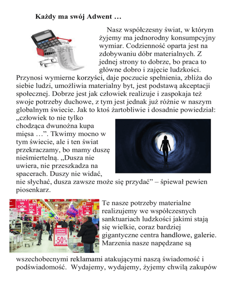 Każdy ma swój Adwent … Nasz współczesny świat, w którym żyjemy ma jednorodny konsumpcyjny wymiar. Codzienność oparta jest na zdobywaniu dóbr materialnych. Z jednej strony to dobrze, bo praca to główne dobro i zajęcie ludzkości. Przynosi wymierne korzyści, daje poczucie spełnienia, zbliża do siebie ludzi, umożliwia materialny byt, jest podstawą akceptacji społecznej. Dobrze jest jak człowiek realizuje i zaspokaja też swoje potrzeby duchowe, z tym jest jednak już różnie w naszym globalnym świecie. Jak to ktoś żartobliwie i dosadnie powiedział: „człowiek to nie tylko chodząca dwunożna kupa mięsa …”. Tkwimy mocno w tym świecie, ale i ten świat przekraczamy, bo mamy duszę nieśmiertelną. „Dusza nie uwiera, nie przeszkadza na spacerach. Duszy nie widać, nie słychać, dusza zawsze może się przydać” – śpiewał pewien piosenkarz. Te nasze potrzeby materialne realizujemy we współczesnych sanktuariach ludzkości jakimi stają się wielkie, coraz bardziej gigantyczne centra handlowe, galerie. Marzenia nasze napędzane są wszechobecnymi reklamami atakującymi naszą świadomość i podświadomość. Wydajemy, wydajemy, żyjemy chwilą zakupów i pragnienia posiadania laptopa z najszybszym procesorem Core’ i7 i kartą graficzną Geforce’a; telewizora LCD, LED a czy już OLED a w jakości „full HD”, często na kredyt. Chcemy być tacy jak bohaterowie seriali i miałkich filmików. A wszystko po aby nasz byt codzienny był w wysokiej rozdzielczości i ciągle na topie, trendy. Kiedyś ten przedświąteczny czas był oczekiwaniem na radosną chwile narodzenia Zbawiciela. Obecnie produkty masowej kultury rozmywają nam to co było wielkim przeżyciem duchowym. Zostajemy obdarci z naszej rodzimej tradycji, adwent jest czasem wydawania kasy, często w sposób bezmyślny. Z nadejściem Świąt Bożego Narodzenia (dobrze że możemy używać jeszcze tej nazwy) mamy już dość kolęd, choinek i pogoni za tym by „mieć”. Nie starcza nam już sił na to by „być” normalnym człowiekiem, który przeżywa święta w gronie najbliższych i zaciszu domowym. Człowiek konsumpcyjny nie jest zainteresowany otaczającą go rzeczywistością społeczną. Nie interesują go „oszustwa wyborcze”, ”afery gospodarcze i hazardowe”, najważniejsze jest „mieć”. Postrzegamy bezmyślnie świat według informacji płynących z telewizora ( jakości „full HD”) i przyjmujemy to za pewnik i wyznacznik naszych poglądów. Jeśli coś pokazało się w TV, to jest to dla nas jak dogmat. Wierzymy w to bez namysłu i krytycznej refleksji. Rozpoczął się Adwent, czyli czas radosnego oczekiwania na powtórne przyjście Chrystusa. Lecz jak można czekać z radością na taki czas, kiedy ludzie mdleć będą ze strachu, gdy moce niebios zostaną wstrząśnięte, a na ziemi zapanuje trwoga narodów bezradnych wobec szumu morza i jego nawałnicy? Czy można z niecierpliwością wyglądać dnia, który ludzie żyjący w średniowieczu nazywali "dies irae" - dzień sądu, pomsty i kary z grzechy? Jakże można wołać, tak jak pierwsi chrześcijanie, marana tha - przyjdź Panie Jezu? Czyżby nie zdawali sobie sprawy z tego co ich wówczas czeka, czyżby byli odważniejsi od nas? A może to właśnie oni mieli rację, może lepiej niż my potrafili zrozumieć, że od opisu katastrof i klęsk towarzyszących końcowi czasów ważniejsze są słowa Chrystusa: "A gdy to się dziać zacznie, nabierzcie ducha i podnieście głowy, ponieważ zbliża się wasze odkupienie." Czekali na Chrystusa, czekali na Tego dla którego gotowi byli poświęcić wszystko - majątek, sławę, życie nawet. Wyglądali z niecierpliwością nadejścia tego upragnionego dnia gdy Pan powróci, by odnowić wszystko, ostatecznie zniszczyć grzech, niesprawiedliwość, obłudę i fałsz, dnia w którym zapanuje królestwo wiecznego szczęścia, miłości i pokoju. My także, prawie na każdej mszy św. wypowiadamy słowa: "Głosimy śmierć twoją Panie Jezu, wyznajemy Twoje zmartwychwstanie i oczekujemy Twego przyjścia w chwale". Ale czy rzeczywiście oczekujemy? A może serca nasze są już tak ociężałe wskutek obżarstwa, pijaństwa i trosk doczesnych, że już nie oczekujemy jutra, a co dopiero powtórnego przyjścia Jezusa na końcu czasów? Kiedy zapraszam parafian na roraty, od razu słyszę, proszę księdza nie mam czasu! Jeden obraz: pewien profesor wziął słoik pełen kamieni i zapytał studentów czy ten słoik jest pełny? Odpowiedzieli: no, tak, pełen kamieni aż po brzegi, no to wziął trochę żwiru, i dosypał do tego słoika. Nawet dużo tego żwiru weszło. A teraz jest pełny – zapytał ponownie. No teraz to już jest pełny! Profesor wziął teraz piasek, dosypał, i jeszcze mu trochę weszło do tego słoika. Studenci mówią, że teraz to słoik już jest pełny na full. A profesor dolał do niego wody i jeszcze się zmieściła. Widzicie, wydaje się nam, że jest pełne, a nie było pełne. Co ja wam chce przez to powiedzieć! Jak się człowiek postara to zawsze trochę czasu znajdzie, aby wybrać się na roraty. Po drugie trzeba zaczynać od rzeczy najważniejszych. Gdyby profesor najpierw nalał wody, już nic by się nie zmieściło. Jeśli dla ciebie adwent nie ma żadnego znaczenia, to na pewno nie znajdziesz czasu na roraty, na modlitwę, lekturę Pisma Świętego, czy uczynki miłosierdzia. Dlatego mogę tylko zachęcać: „zatrzymaj się na chwilę i pomyśl po co żyjesz!?”, bo jeśli to twój ostatni adwent w życiu …