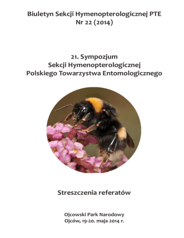 Biuletyn Sekcji Hymenopterologicznej PTE Nr 22 (2014) 21. Sympozjum Sekcji Hymenopterologicznej Polskiego Towarzystwa Entomologicznego Streszczenia referatów Ojcowski Park Narodowy Ojców, 19-20. maja 2014 r. XXI Sympozjum Sekcji Hymenopterologicznej PTE Program Poniedziałek, 19 maja 2014 r. Godz. 10.00 – 12.00 – I sesja referatowa Jolanta BĄK-BADOWSKA – Występowanie licinka małżonaczka Argyresthia conjugella Zell. (Lepidoptera: Yponomeutidae) w rezerwacie „Szczytniak” Waldemar CELARY – Potencjalne możliwości błędnego opisania nowych gatunków pszczół (Apiformes = Anthophila) w przypadku osobników z nie rozpoznanymi zmianami teratologicznymi Marzena MASIEROWSKA – Rola pszczół (Apoidea) w zapylaniu kwiatów gorczycy białej i sarepskiej Maria KELM, Tomasz STROJNY, Paweł MICHOŁAP – Z badań nad dzikimi pszczołami w uprawach rzepaku ozimego Zbigniew KOŁTOWSKI, Dariusz TEPER, Mikołaj BORAŃSKI – Badania monitoringowe trzmieli na terenie całej Polski – propozycja podjęcia projektu finansowanego z programu BioStrateg DYSKUSJA Godz. 12.00 – 12.30 – przerwa (kawa, herbata, ciastka) Godz. 12.30 – 15.00 – II sesja referatowa Tadeusz Kaźmierczak – Gąsienicznikowate (Hymenoptera, Ichneumonidae) – ich budowa i życie Marta RZAŃSKA, Hanna PIEKARSKA-BONIECKA – Pimplinae (Hymenoptera, Ichneumonidae) występujące w kolekcji bylin Katedry Roślin Ozdobnych Uniwersytetu Przyrodniczego w Poznaniu Stanisław FLAGA – Czynna ochrona kolonii porobnicy włochatki w Waganowicach Katarzyna SZCZEPKO – Czynniki wpływające na różnorodność gatunkową grzebaczy (Hymenoptera, Spheciformes) na odłogach porolnych w Kampinoskim Parku Narodowym Tadeusz PAWLIKOWSKI – Metodologiczne uwarunkowania opisu zespołu żądłówek antofilnych jako bioindykatorów środowiska Bogdan WIŚNIOWSKI – Zastosowanie anaglifów do obrazowania przestrzennego cech morfologicznych owadów DYSKUSJA Godz. 15.00–16.30 – przerwa obiadowa Godz. 17.00 – 18.00 SPOTKANIA ROBOCZE uczestników sympozjum Godz. 18.30 – spotkanie towarzyskie w „Piwnicy pod Nietoperzem” Wtorek, 20 maja 2014 r. Godz. 8.00–20.00 – wycieczka do Pienińskiego Parku Narodowego 1 Występowanie licinka małżonaczka Argyresthia conjugella Zell. (Lepidoptera: Yponomeutidae) w rezerwacie „Szczytniak” Jolanta BĄK-BADOWSKA Zakład Zoologii i Dydaktyki Biologii, Uniwersytet Jana Kochanowskiego w Kielcach Badania nad występowaniem licinka małżonaczka (Argyresthia conjugella Zell.) prowadzono w latach 2008-2009 na obszarze rezerwatu „Szczytniak”, położonego w Jeleniowskim Parku Krajobrazowym w Górach Świętokrzyskich. Jest to rezerwat częściowy, geologiczno-leśny, znajdujący się w północno-wschodniej części stoku Pasma Jeleniowskiego (UTM: EB 13]. Zajmuje on powierzchnię 6,03 ha. Na obszarze rezerwatu ochroną objęto rumowiska kamienne (gołoborza) porośnięte przez karłowate brzozy (Betula sp.) i jarzębinę zwyczajną (Sorbus aucuparia). Badany materiał w postaci owoców jarzębiny zwyczajnej (Sorbus aucuparia) zebrano pod koniec lipca i na początku sierpnia w latach 2008-2009. W każdym roku badań pobierano losowo z 10-ciu tych samych drzew (z dolnej części gałęzi) próby po 500 owoców. Łącznie zebrano 10 000 owoców jarzębiny. W laboratorium analizowano materiał pod kątem zasiedlania przez owady. Na okres zimy owoce umieszczono w hodowlach masowych i ustawiono na balkonie, a na początku lutego przeniesiono je do laboratorium. Obserwowano proces wylęgu imago, który trwał około 5-6 tygodni. W celu porównania zasiedlenia owoców przez licinka małżonaczka (A. conjugella Zell.) zastosowano wskaźnik zasiedlenia owoców (WZO), będący ilorazem liczby osobników owadów i liczby owoców w próbie. W rezultacie przeprowadzonych badań, w owocach jarzębiny zwyczajnej zebranych z obszaru rezerwatu stwierdzono obecność licinka małżonaczka – Argyresthia conjugella Zell. Natomiast w nasionach tego drzewa wykazano znamionka jarzębinowca (Megastigmus brevicaudis RATZ.) (Hymenoptera: Torymidae). Informacje na temat zasiedlenia nasion jarzębiny przez znamionka zostaną podane w osobnym artykule. Łącznie w obu latach badań uzyskano 1214 osobników Argyresthia conjugella Zell. (w 2008 r. – 552 os.; w 2009 – 622 os.). W 2008 r. wśród przeznaczonych do badań 5000 owoców – 1249 było uszkodzonych przez tego owada, co stanowi 24,98% liczby owoców. Wskaźnik zasiedlenia (WZO) w tym roku wyniósł 0,110. Natomiast owoce zebrane w 2009 r. były zasiedlone przez A. conjugella Zell. w 30,48% (1524 os.). Wskaźnik zasiedlenia owoców jarzębiny przez omawianego owada wyniósł 0,124. Potencjalne możliwości błędnego opisania nowych gatunków pszczół (Apiformes = Anthophila) w przypadku osobników z nie rozpoznanymi zmianami teratologicznymi Waldemar CELARY Zakład Ekologii i Ochrony Środowiska, Uniwersytet Jana Kochanowskiego, Kielce Zaburzenia w rozwoju ontogenetycznym prowadzą często do pojawiania się zmian morfologicznych u imagines. Zmiany teratologiczne obniżając dostosowanie przyczyniają się do większej śmiertelności osobników u których występują. Stąd też w próbach (pobranym materiale) osobniki takie występują niezwykle rzadko. U pszczół najczęściej teratologie pojawiają się u samców, prawdopodobnie dlatego, że są one organizmami haploidalnymi. Przypadki zmian teratologicznych u samic, będących diploidami, są znacznie rzadsze. W zależności od typu zmian, a więc od tego w jakim stopniu obniżają one dostosowanie osobnika – różne teratologie występują w materiale z różną częstotliwością. Najczęściej 2 spotykamy zaburzenia rozwoju użyłkowania skrzydeł (brak żyłki poprzecznej oddzielającej komórki submarginalne) lub struktury egzoszkieletu (rzeźba, mikrorzeźba, punktowanie). Najrzadziej spotykane, to deformacje tagm oraz odnóży i czułków. Nie bez znaczenia dla częstotliwości poja