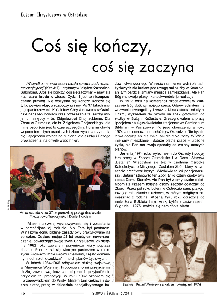 Kościół Chrystusowy w Ostródzie Coś się kończy, coś się zaczyna „Wszystko ma swój czas i każda sprawa pod niebem ma swoją porę” (Kzn 3:1) – czytamy w księdze Kaznodziei Salomona. „Coś się kończy, coś się zaczyna” – mawiają nasi starsi bracia w wierze, Żydzi. I jest to niezaprzeczalną prawdą. Nie wszystko się kończy, kończy się tylko pewien etap, a rozpoczyna inny. Po 37 latach mojego pasterzowania Kościołowi Chrystusowemu w Ostró dzie nadszedł bowiem czas przekazania tej służby mojemu następcy – br. Zbigniewowi Chojnackiemu. Dla Zboru w Ostródzie, dla br. Zbigniewa Chojnackiego i dla mnie osobiście jest to czas szczególny. Pora na chwilę wspomnień – tych osobistych i zborowych, zatrzymania się i spojrzenia wstecz na minione lata służby i Bożego prowadzenia, na chwilę wspomnień. fot. N. Hury downictwa wodnego. W swoich zamierzeniach i planach życiowych nie brałem pod uwagę ani służby w Kościele, ani tym bardziej zmiany miejsca zamieszkania. Ale Pan Bóg ma swoje plany i konsekwentnie je realizuje. W 1972 roku na konferencji młodzieżowej w War szawie Bóg dotknął mojego serca. Odpowiedziałem na wezwanie ewangelisty i wraz z kilkunastoma młodymi ludźmi, wyszedłem do przodu na znak gotowości do służby w Bożym Królestwie. Zrezygnowałem z pracy i podjąłem naukę w dwuletnim stacjonarnym Seminarium Biblijnym w Warszawie. Po jego ukończeniu w roku 1974 zaproponowano mi służbę w Ostródzie. Nie była to łatwa decyzja ani dla mnie, ani dla mojej żony. W Wiśle mieliśmy mieszkanie i dobrze płatną pracę – ułożone życie, ale Pan ma swoje sposoby do zmiany naszych planów. Jesienią 1974 roku wyjechałem do Ostródy i podjąłem pracę w Zborze Ostródzkim i w Domu Starców „Betania”. Włączyłem się też w działania Ośrodka Katechetyczno-Misyjnego. Zastałem Zbór, który w tym czasie przeżywał kryzys. Właściwie to 24 pensjonariuszy „Betanii” stanowiło ten Zbór, tylko cztery osoby były spoza Domu Starców. Ale Pan był wierny swoim obietnicom i z czasem kolejne osoby zaczęły dołączać do Zboru. Przez pół roku byłem w Ostródzie sam, przygotowując mieszkanie służbowe, w którym mógłbym zamieszkać z rodziną. Wiosną 1975 roku dołączyła do mnie żona Elżbieta i syn Arek, byliśmy znów razem. W grudniu 1975 urodziła się nam córka Marta. Miałem przywilej wychowywania się i wzrastania w chrześcijańskiej rodzinie. Mój Tato był pastorem. W naszym domu biblijne zasady były praktykowane na co dzień. Dopiero mając 21 lat przeżyłem nowonarodzenie, powierzając swoje życie Chrystusowi. 26 sierpnia 1962 roku zawarłem przymierze wiary poprzez chrzest. Pan okazał się wiernym pasterzem w moim życiu. Prowadził mnie swoimi ścieżkami, często odmien nymi od moich oczekiwań i moich planów życiowych. W latach 1964-1966 odbywałem służbę wojskową w Marynarce Wojennej. Proponowano mi przejście na służbę zawodową, lecz za radą moich przyjaciół nie przyjąłem tej propozycji. W roku 1967 ożeniłem się i przeprowadziłem do Wisły. Miałem tam ciekawą i dobrze płatną pracę w dziedzinie specjalistycznego bu16 fot. archiwum rodzinne W imieniu zboru za 37 lat pastorskiej posługi dziękowali: Mieczysława Trawczyńska i Daniel Haratym Elżbieta i Paweł Wróblowie z Arkiem i Martą, rok 1976 SŁOWO i ŻYC IE n r 2/2011 Były też trudne chwile zniechęcenia. Proponując mi pracę w Ostródzie, kierownictwo ZKE przedstawiało zatwierdzony plan rozbudowy Ośrodka Katechetyczno-Misyjnego, gdzie miał powstać Dom Opieki dla 80 osób. Zrezygnowano jednak z tego przedsięwzięcia. Latem 1985 roku w „Betanii” wybuchł pożar. Trzeba było znaleźć zastępcze lokum dla pensjonariuszy, przeprowadzić generalny remont, zdobyć fundusze. Były też trudne doświadczenia osobiste – choroba i śmierć mojej żony Elżbiety. Z końcem roku 2009 trzeba było zakończyć działalność Domu Spokojnej Starości „Betania”. Dziękuję Panu Bogu za darowany mi przywilej posługiwania w Jego Kościele. Dziękuję też Radzie Starszych Zboru i bratu Danielowi Haratymowi za przewodnictwo w niej. Dziękuję Zborowi za modlitwy i duchowe wspar- fot. N. Hury Kościół Chrystusowy w Ostródzie Życzenia dla nowego pastora składali: Grażyna Hoffman i Piotr Wiśniowski Daniel Haratym, Paweł Wróbel, Zbigniew Chojnacki Proszę, pamiętajcie nadal o mnie w swoich modlitwach. Potrzebujemy nadal Waszego duchowego zaplecza, jakie mieliśmy dotychczas, posługując Wam. Proszę też, obdarzcie Waszego nowego Pastora zaufaniem, noście go w swoich modlitwach, wspierajcie Go i zachęcajcie, aby Jego posługiwanie przynosiło Bogu chwałę, a Wam duchowe zbudowanie i posilenie. „Niech życie Wasze będzie godne Ewangelii Chrystusowej, abym czy przyjdę i ujrzę Was, czy będę nieobecny, słyszał o Was, że stoicie w jednym duchu, jednomyślnie walcząc społem za wiarę Ewangelii” (Flp 1:27-30). Raz jeszcze dziękuję i błogosławię Was. „A teraz poruczam Was Panu i słowu łaski Jego, które ma moc zbudować i dać Wam dziedzictwo między wszystkimi uświęconymi” (Dz 20:32). fot. N. Hury cie, za bycie ze mną w radosnych i trudnych chwilach. Braterstwu Ani i Adamowi Biernackim dziękuję za wkład w służbę „Betanii”, braterstwu Wiesi i Jurkowi Żeguniom za wkład w rozwój tej wspólnoty. Prezbiterowi Na czelnemu pastorowi Andrzejowi Bajeńskiemu i Radzie PAWEŁ WRÓBEL Krajowej za współpracę i duchowe wsparcie. Dziękuję mojej żonie Halinie i moim dzieciom za wspieranie mojej służby. Polskiej Chrześcijańskiej Misji, br. Pawłowi Bajko i br. Wayne’owi Murphy’emu dziękuję za okazywaną pomoc. Wdzięczny jestem włodarzom naszego miasta, Panu Burmistrzowi Olgierdowi Dąbrowskiemu i Panu Staroście Włodzimierzowi Brodiukowi, za otwartość i współdziałanie w naszej służbie wśród uzależnionych. Dziękuje również br. Zbigniewowi Chojn
