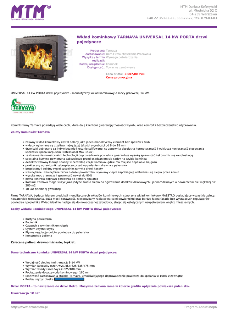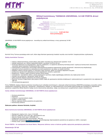 MTM Dariusz Seferyński ul. Młodnicka 52 C 04-239 Warszawa +48 22 353-11-11, 353-22-22, fax. 879-83-83 Wkład kominkowy TARNAVA UNIVERSAL 14 kW PORTA drzwi pojedyncze Producent: Zastosowanie: Wysyłka / termin realizacji: Rodzaj urządzenia: Dostępność:: Tarnava Dom,Firma,Mieszkanie,Pracownia Wymaga potwierdzenia Kominek Towar na zamówienie Cena brutto: 3 607,00 PLN Cena promocyjna UNIVERSAL 14 kW PORTA drzwi pojedyncze - monolityczny wkład kominkowy o mocy grzewczej 14 kW. Kominki firmy Tarnava posiadają wiele cech, które dają klientowi gwarancję trwałości wyrobu oraz komfort i bezpieczeństwo użytkowania. Zalety kominków Tarnava żeliwny wkład kominkowy został odlany jako jeden monolityczny element bez spawów i śrub wkłady wykonane są z żeliwa najwyższej jakości o grubości od 8 do 18 mm drzwiczki dobierane są indywidualnie i ręcznie szlifowane, co zapewnia absolutną hermetyczność i wyklucza konieczność stosowania uszczelek (poza korpusem Professional Max 15kw) zastosowanie nowatorskich technologii doprowadzania powietrza gwarantuje wysoką sprawność i ekonomiczną eksploatację specjalna kurtyna powietrzna zabezpiecza przed osadzaniem się sadzy na szybie kominka deflektor żeliwny kieruje spaliny w centralną część kominka, gdzie ma miejsce dopalanie się gazu praktyczny ogranicznik zabezpiecza przed wypadaniem drewna z paleniska bezpieczny i solidny rygiel szczelnie zamyka drzwi kasety wewnętrzne i zewnętrzne żebra o dużej powierzchni wymiany ciepła zapobiegają ulatnianiu się ciepła przez komin wysoka moc grzewcza i sprawność nawet do 80% pełna kontrola dopływu powietrza do komory spalania Kominki Tarnava mogą służyć jako jedyne źródło ciepła do ogrzewania domków działkowych i jednorodzinnych o powierzchni nie większej niż 280 m2 10 Lat pisemnej gwarancji Firma TARNAVA, będąca liderem produkcji monolitycznych wkładów kominkowych, stworzyła wkład kominkowy MAESTRO posiadający wszystkie zalety: nowatorskie rozwiązania, dużą moc i sprawność, niespotykany radiator na całej powierzchni oraz bardzo ładną fasadę bez wystających regulatorów powietrza i popielnika Wkład idealnie nadaje się do nowoczesnej zabudowy, stając się estetycznym uzupełnieniem wnętrz mieszkalnych. Cechy wkładu kominkowego UNIVERSAL 14 kW PORTA drzwi pojedyncze: Kurtyna powietrzna Popielnik Czopuch z wymiennikiem ciepła System czystej szyby Płynna regulacja dolotu powietrza do paleniska Konstrukcja żeliwna Zalecane paliwo: drewno liściaste, brykiet. Dane techniczne kominka UNIVERSAL 14 kW PORTA drzwi pojedyncze: Wydajność cieplna (min.-max.): 8-14 kW Wymiar całkowity (szer./wys./gł.): 625/535/475 mm Wymiar fasady (szer./wys.): 625/480 mm Podłączenie do przewodu kominowego: 160 mm Możliwość zastosowania stojaka Tarnava, umożliwiającego doprowadzenie powietrza do spalania w 100% z zewnątrz Rodzaj szyby: płaska Drzwi PORTA - to nawiązanie do drzwi Retro. Masywna żeliwna rama w kolorze grafitu optycznie powiększa palenisko. Gwarancja 10 lat http://www.firmamtm.pl Powered by TCPDF (www.tcpdf.org) Program AptusShop6