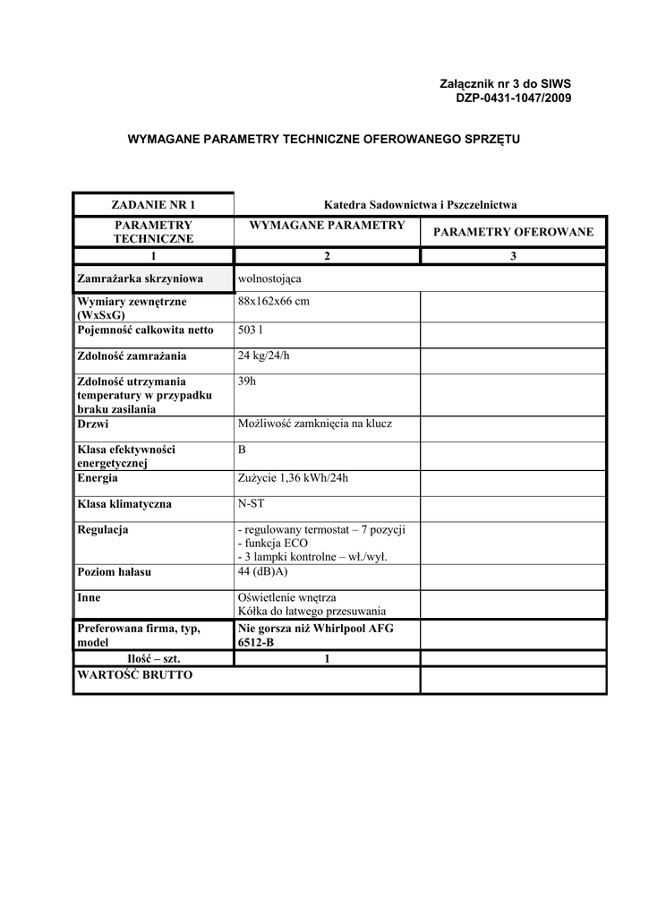 Załącznik nr 3 do SIWS DZP-0431-1047/2009 WYMAGANE PARAMETRY TECHNICZNE OFEROWANEGO SPRZĘTU ZADANIE NR 1 Katedra Sadownictwa i Pszczelnictwa PARAMETRY TECHNICZNE 1 WYMAGANE PARAMETRY 2 Zamrażarka skrzyniowa wolnostojąca Wymiary zewnętrzne (WxSxG) Pojemność całkowita netto 88x162x66 cm Zdolność zamrażania 24 kg/24/h Zdolność utrzymania temperatury w przypadku braku zasilania Drzwi 39h Klasa efektywności energetycznej Energia B Klasa klimatyczna N-ST Regulacja - regulowany termostat – 7 pozycji - funkcja ECO - 3 lampki kontrolne – wł./wył. 44 (dB)A) Poziom hałasu Inne Preferowana firma, typ, model Ilość – szt. WARTOŚĆ BRUTTO 503 l Możliwość zamknięcia na klucz Zużycie 1,36 kWh/24h Oświetlenie wnętrza Kółka do łatwego przesuwania Nie gorsza niż Whirlpool AFG 6512-B 1 PARAMETRY OFEROWANE 3 ZADANIE NR 2 PARAMETRY TECHNICZNE 1 Katedra Genetyki Hodowli i Nasiennictwa WYMAGANE PARAMETRY 2 Zamrażarka szufladowa Wolnostojąca pionowa Wymiary zewnętrzne (WxSxG) Pojemność 184x60x63 cm Zdolność zamrażania 20kg/24h Szuflady 8 szt. Szuflady przeźroczyste Z tworzywa sztucznego Czas utrzymywania temperatury w przypadku braku zasilania Klasa energetyczna 43h Klasa zamrażania **** Zużycie prądu roczne 314 kWh Funkcje dodatkowe Bezszronowa Kalendarz zamrażania żywności Sterowanie elektroniczne Wyświetlacz elektroniczny Zmiana kierunku otwierania drzwi Regulowane nóżki Kółka ułatwiające ustawienie zamrażarki Oświetlenie wnętrza Regulowany termostat Szybkie zamrażanie biały Inne Kolor Bezpieczeństwo użytkownika Preferowana firma, typ, model Ilość – szt. WARTOŚĆ BRUTTO 261 [l] A+ Alarm niedomkniętych drzwi Alarm wzrostu temperatury Blokada panelu sterowania Nie gorsza niż Liebherr GN 3056 1 PARAMETRY OFEROWANE 3 Katedra Hodowli Bydła ZADANIE NR 3 PARAMETRY TECHNICZNE 1 WYMAGANE PARAMETRY 2 Zamrażarka szufladowa Wolnostojąca pionowa Wymiary zewnętrzne (WxSxG) Pojemność netto 160x60x60 (+/- 5%) Zdolność zamrażania 20kg/24h Szuflady Szuflady przeźroczyste 4 standardowe 2 przedziały mrożenia Z tworzywa sztucznego Zdolność zamrażania 18 kg/24 h Czas utrzymywania temperatury w przypadku braku zasilania Klasa efektywności energetycznej Klasa zamrażania 24 h Zużycie energii 0.73 kWh/24h 200 l ((+/- 5%) A+ **** Bezszronowa Kalendarz zamrażania żywności Sterowanie elektroniczne Wyświetlacz elektroniczny Zmiana kierunku otwierania drzwi Inne Regulowane nużki Kółka ułatwiające ustawienie zamrażarki Oświetlenie wnętrza Regulowany termostat Szybkie zamrażanie Bezpieczeństwo użytkownika Alarm niedomkniętych drzwi Alarm wzrostu temperatury Preferowana firma, typ, Nie gorsza niż Whirlpool WV1600 model Ilość – szt. 1 WARTOŚĆ BRUTTO Funkcje dodatkowe PARAMETRY OFEROWANE 3