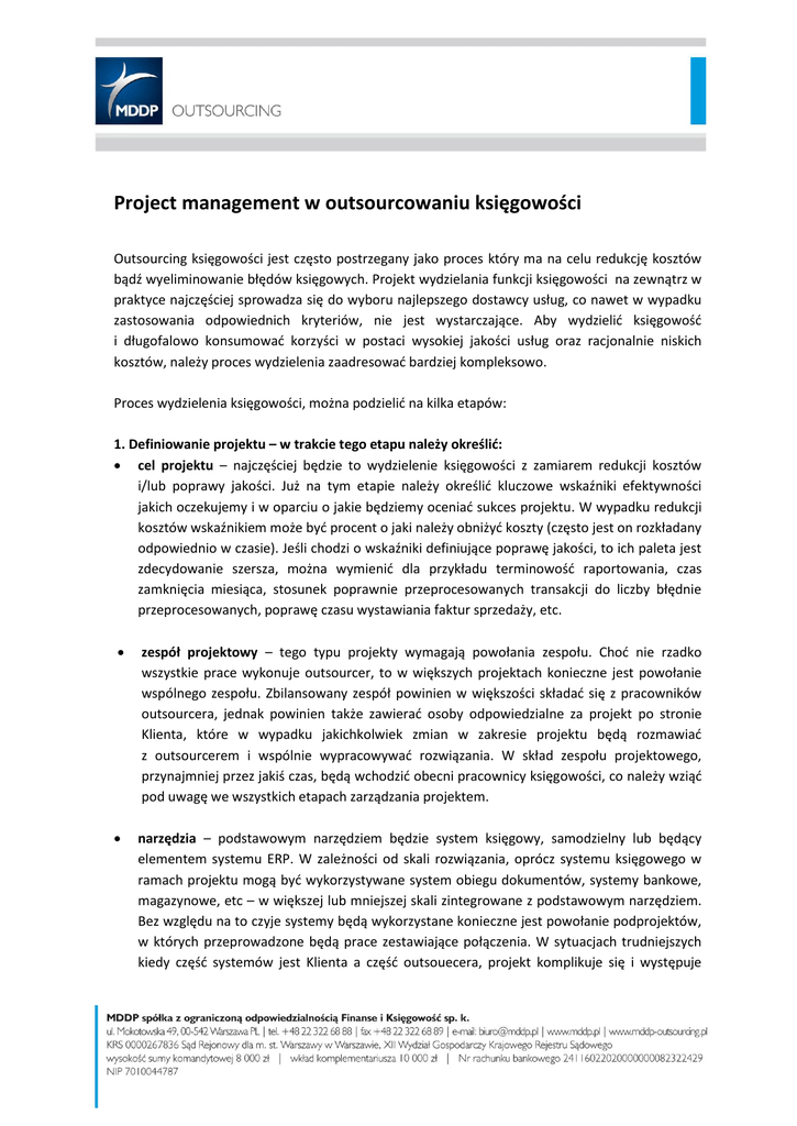 Project management w outsourcowaniu księgowości Outsourcing księgowości jest często postrzegany jako proces który ma na celu redukcję kosztów bądź wyeliminowanie błędów księgowych. Projekt wydzielania funkcji księgowości na zewnątrz w praktyce najczęściej sprowadza się do wyboru najlepszego dostawcy usług, co nawet w wypadku zastosowania odpowiednich kryteriów, nie jest wystarczające. Aby wydzielić księgowość i długofalowo konsumować korzyści w postaci wysokiej jakości usług oraz racjonalnie niskich kosztów, należy proces wydzielenia zaadresować bardziej kompleksowo. Proces wydzielenia księgowości, można podzielić na kilka etapów: 1. Definiowanie projektu – w trakcie tego etapu należy określić: cel projektu – najczęściej będzie to wydzielenie księgowości z zamiarem redukcji kosztów i/lub poprawy jakości. Już na tym etapie należy określić kluczowe wskaźniki efektywności jakich oczekujemy i w oparciu o jakie będziemy oceniać sukces projektu. W wypadku redukcji kosztów wskaźnikiem może być procent o jaki należy obniżyć koszty (często jest on rozkładany odpowiednio w czasie). Jeśli chodzi o wskaźniki definiujące poprawę jakości, to ich paleta jest zdecydowanie szersza, można wymienić dla przykładu terminowość raportowania, czas zamknięcia miesiąca, stosunek poprawnie przeprocesowanych transakcji do liczby błędnie przeprocesowanych, poprawę czasu wystawiania faktur sprzedaży, etc. zespół projektowy – tego typu projekty wymagają powołania zespołu. Choć nie rzadko wszystkie prace wykonuje outsourcer, to w większych projektach konieczne jest powołanie wspólnego zespołu. Zbilansowany zespół powinien w większości składać się z pracowników outsourcera, jednak powinien także zawierać osoby odpowiedzialne za projekt po stronie Klienta, które w wypadku jakichkolwiek zmian w zakresie projektu będą rozmawiać z outsourcerem i wspólnie wypracowywać rozwiązania. W skład zespołu projektowego, przynajmniej przez jakiś czas, będą wchodzić obecni pracownicy księgowości, co należy wziąć pod uwagę we wszystkich etapach zarządzania projektem. narzędzia – podstawowym narzędziem będzie system księgowy, samodzielny lub będący elementem systemu ERP. W zależności od skali rozwiązania, oprócz systemu księgowego w ramach projektu mogą być wykorzystywane system obiegu dokumentów, systemy bankowe, magazynowe, etc – w większej lub mniejszej skali zintegrowane z podstawowym narzędziem. Bez względu na to czyje systemy będą wykorzystane konieczne jest powołanie podprojektów, w których przeprowadzone będą prace zestawiające połączenia. W sytuacjach trudniejszych kiedy część systemów jest Klienta a część outsouecera, projekt komplikuje się i występuje konieczność zbudowania interfejsów. Dla sukcesu projektu ten nurt prac wymaga indywidualnego zarządzania i powołania osób odpowiedzialnych. W niektórych projektach pojawiają się wymagania które nie są zaadresowane przez istniejące systemy (czy po stronie Klienta czy outsourcera), i w takich wypadkach wymagane będzie ich wdrożenie. W dalszych etapach należy wtedy dodatkowo zwrócić uwagę na zakres wdrożenia, konfigurację systemów, ich testy, itd. 2. Planowanie projektu W trakcie etapu planowania należy przygotować harmonogram projektu, który można podzielić na 3 główne okresy: okres przed zmianą, kiedy organizacja przygotowuje się do zmiany. Kluczowym aspektem jest zaplanowanie możliwych scenariuszy wydarzeń z uwzględnieniem chęci (lub jej braku) obecnych księgowych do współpracy. Na tym etapie należy przewidzieć potencjalne zagrożenia kadrowe i zaplanować współpracę z outsourcerem tak, aby w razie potrzeby jego większego zaangażowania mógł elastycznie wesprzeć organizację. okres po ogłoszeniu zmian, w trakcie współpracy pomiędzy outsourcerem a ustępującymi księgowymi. W tym okresie kluczowe jest zachowanie ciągłości działania – outsourcer jest gotowy do przejęcia księgowości od daty określonej w umowie, natomiast księgowi mogą odmówić pracy już przed tą datą. Z tego powodu w szczególności należy zaplanować tryb współpracy pomiędzy obecnymi księgowymi a outsourcerem poprzez koordynatora, oraz sposób postępowania w wypadku sytuacji spornych pomiędzy outsourcerem a księgowymi. W okresie tym należy także zaplanować tzw. shadow work – kiedy poszczególni pracownicy outsourcera będą pracować z obecnymi księgowymi. okres, w trakcie którego outsourcer działa całkowicie samodzielnie – na tym etapie na podstawie zdefiniowanych wskaźników należy monitorować jakoś obsługi outsourcera. Konieczne jest również okresowa rewizja zapisów SLA i uzupełnianie jest w razie konieczności, aby osiągnąć założone cele i usunąć nieprzewidziane wcześniej trudności we współpracy. Na tym etapie warto upewnić się, że nawet po przeprowadzeniu projektu przeniesienia księgowości do outsourcera, Klient nadal będzie mógł (w razie potrzeby) dysponować wszystkimi danymi finansowymi. 3. Realizacja projektu Realizacja projektu polega na przydzieleniu zadań członkom zespołu oraz monitorowaniu postępu prac w powiązaniu z harmonogramem. Weryfikacja z harmonogramem w szczególności powinna obejmować kluczowe elementy określone na etapie planowania. 4. Zamykanie projektu i bieżąca praca W ostatnim etapie należy podsumować projekt przeniesienia księgowości do outsourcera i odpowiedzieć na pytanie czy osiągnięto sukces. Dobrą metodą jest analiza zdefiniowanych wcześniej wskaźników. Po zamknięciu projektu wdrożenia usługa będzie świadczona na bieżąco, i w taki sposób powinna być także monitorowana. Rafał Michniewicz Partner MDDP Outsourcing Specjalizuje się w usługowym prowadzeniu księgowości dla firm i optymalizacji działania procesów finansowo księgowych