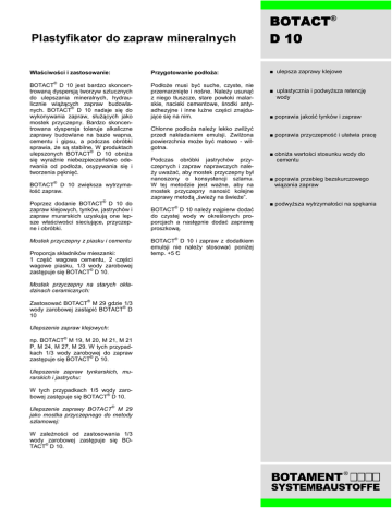 Plastyfikator do zapraw mineralnych BOTACT® D 10 Właściwości i zastosowanie: ■ ulepsza zaprawy klejowe Przygotowanie podłoŜa: ® BOTACT D 10 jest bardzo skoncentrowaną dyspersją tworzyw sztucznych do ulepszania mineralnych, hydraulicznie wiąŜących zapraw budowla® nych. BOTACT D 10 nadaje się do wykonywania zapraw, słuŜących jako mostek przyczepny. Bardzo skoncentrowana dyspersja toleruje alkaliczne zaprawy budowlane na bazie wapna, cementu i gipsu, a podczas obróbki sprawia, Ŝe są stabilne. W produktach ® ulepszonych BOTACT D 10 obniŜa się wyraźnie niebezpieczeństwo oderwania od podłoŜa, osypywania się i tworzenia pęknięć. ® BOTACT D 10 zwiększa wytrzymałość zapraw. ® Poprzez dodanie BOTACT D 10 do zapraw klejowych, tynków, jastrychów i zapraw murarskich uzyskują one lepsze właściwości sieciujące, przyczepne i obróbki. Mostek przyczepny z piasku i cementu Proporcja składników mieszanki: 1 część wagowa cementu, 2 części wagowe piasku, 1/3 wody zarobowej ® zastępuje się BOTACT D 10. PodłoŜe musi być suche, czyste, nie przemarznięte i nośne. NaleŜy usunąć z niego tłuszcze, stare powłoki malarskie, nacieki cementowe, środki antyadhezyjne i inne luźne części znajdujące się na nim. Chłonne podłoŜa naleŜy lekko zwilŜyć przed nakładaniem emulsji. ZwilŜona powierzchnia moŜe być matowo - wilgotna. Podczas obróbki jastrychów przyczepnych i zapraw naprawczych naleŜy uwaŜać, aby mostek przyczepny był nanoszony o konsystencji szlamu. W tej metodzie jest waŜne, aby na mostek przyczepny nanosić kolejne zaprawy metodą „świeŜy na świeŜe”. ® ■ uplastycznia i podwyŜsza retencję wody ■ poprawia jakość tynków i zapraw ■ poprawia przyczepność i ułatwia pracę ■ obniŜa wartości stosunku wody do cementu ■ poprawia przebieg bezskurczowego wiązania zapraw ■ podwyŜsza wytrzymałości na spękania BOTACT D 10 naleŜy najpierw dodać do czystej wody w określonych proporcjach a następnie dodać zaprawę proszkową. ® BOTACT D 10 i zapraw z dodatkiem emulsji nie naleŜy stosować poniŜej temp. +5 C ° Mostek przyczepny na starych okładzinach ceramicznych: ® Zastosować BOTACT M 29 gdzie 1/3 ® wody zarobowej zastąpić BOTACT D 10 Ulepszenie zapraw klejowych: ® np. BOTACT M 19, M 20, M 21, M 21 P, M 24, M 27, M 29. W tych przypadkach 1/3 wody zarobowej do zapraw ® zastępuje się BOTACT D 10. Ulepszenie zapraw tynkarskich, murarskich i jastrychu: W tych przypadkach 1/5 wody zaro® bowej zastępuje się BOTACT D 10. ® Ulepszenie zaprawy BOTACT M 29 jako mostka przyczepnego do metody szlamowej: W zaleŜności od zastosowania 1/3 wody zarobowej zastępuje się BO® TACT D 10. BOTAMENT ® SYSTEMBAUSTOFFE BOTACT® D 10 Plastyfikator do zapraw mineralnych Baza materiałowa: : dyspersja styrolowo – akrylowa Wskazówki: CięŜar właściwy: około 1,0 kg/l Dzięki ulepszeniu BOTACT D 10 wydłuŜa się proces hydratacji mineralnych zapraw budowlanych. Patrz zastosowanie. W przypadku połączenia z zaprawami klejowymi moŜe ulec skróceniu czas nakładania. 1 l - opakowanie z tworzywa sztucznego 5 l - opakowanie z tworzywa sztucznego 10 l - opakowanie z tworzywa sztucznego ZuŜycie: ® Temperatura obróbki: od +5 C ° do +30 C ° Środki do czyszczenia: w świeŜym stanie materiału - woda W przypadkach wykonywania mostka przyczepnego nie naleŜy uŜywać ® emulsji BOTACT D 10 w stanie nierozcieńczonym. Opakowania: Przechowywanie: NaleŜy przestrzegać wytycznych zawartych w kartach technicznych produktów, które stosowane są w połą® czeniu z BOTACT D 10. Przechowywać w nie naraŜonym na przemarzanie miejscu. Kartę bezpieczeństwa produktu otrzymają Państwo na Ŝyczenie. W oryginalnie zamkniętych opakowaniach wynosi 12 miesięcy. Termin przechowywania: Produkt ten naleŜy stosować wyłącznie z dodatkami zawartymi w karcie technicznej. W celu osiągnięcia optymalnych parametrów technicznych przed zastosowaniem naleŜy wykonać próbę w specyficznych warunkach budowy. BOTAMENT SYSTEMBAUSTOFFE 63-000 Środa Wlkp. • ul. Prądzyńskiego 20 Tel. 061/286-45-20 • Fax 061/286-45-14 www.botament.pl • [email protected] Uwaga: Dane zawarte w instrukcji technicznej powstały w najlepszej wierze na podstawie naszych doświadczeń, nie są jednak zobowiązujące. Trzeba je dostosować odpowiednio do danych obiektów budowlanych, celów zastosowania oraz szczególnych miejscowych wymagań. W krytycznych miejscach zastosowań naleŜy przeprowadzić próby. Za prawidłowość powyŜszych danych odpowiadamy w ramach naszych warunków sprzedaŜy i dostawy. Zalecenia naszych współpracowników odbiegające od danych zawartych w instrukcjach technicznych są dla nas zobowiązujące, jeśli zostaną potwierdzone pisemnie. Wydanie 02/2009-PL-002. Po ukazaniu się nowego wydania powyŜsze staje się nieaktualne.