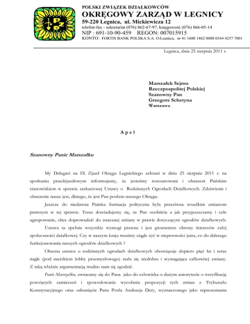 POLSKI ZWIĄZEK DZIAŁKOWCÓW OKRĘGOWY ZARZĄD W LEGNICY 59-220 Legnica, ul. Mickiewicza 12 telefon-fax - sekretariat (076) 862-67-97, księgowość (076) 866-05-14 NIP : 691-10-90-459 REGON: 007015915 DO KONTO: FORTIS BANK POLSKA S.A. O/Legnica, nr 41 1600 1462 0008 0344 4257 7001 Legnica, dnia 25 sierpnia 2011 r. Marszałek Sejmu Rzeczpospolitej Polskiej Szanowny Pan Grzegorz Schetyna Warszawa Apel Szanowny Panie Marszałku My Delegaci na IX Zjazd Okręgu Legnickiego zebrani w dniu 25 sierpnia 2011 r. na spotkaniu przedzjazdowym informujemy, że jesteśmy rozczarowani i oburzeni Pańskim stanowiskiem w sprawie zaskarżonej Ustawy o Rodzinnych Ogrodach Działkowych. Zdziwienie i oburzenie nasze jest, dlatego, że jest Pan posłem naszego Okręgu. Jeszcze do niedawna Pańska formacja polityczna była przeciwna wszelkim zmianom prawnym w tej sprawie. Teraz dowiadujemy się, że Pan osobiście a jak przypuszczamy i całe ugrupowanie, chce doprowadzić do znacznej zmiany w prawie dotyczącym ogrodów działkowych. Ustawa ta spełnia wszystkie wymogi prawne i jest gwarantem obrony interesów całej społeczności działkowej. Czy w naszym kraju musimy ciągle żyć w niepewności jutra, co do dalszego funkcjonowania naszych ogrodów działkowych ? Obecna ustawa o rodzinnych ogrodach działkowych obowiązuje dopiero pięć lat i teraz nagle (pod naciskiem lobby przemysłowego) stała się niedobra i wymagająca całkowitej zmiany. Z taką właśnie argumentacją trudno nam się zgodzić. Panie Marszałku, zwracamy się do Pana jako do człowieka o dużym autorytecie o weryfikację powziętych zamierzeń i spowodowanie wycofania propozycji tych zmian z Trybunału Konstytucyjnego oraz odsunięcie Pana Posła Andrzeja Dery, wyznaczonego jako reprezentanta 2 Sejmu przed Trybunałem Konstytucyjnym w sprawie Ustawy o Rodzinnych Ogrodach Działkowych, za co z góry dziękujemy. Panie Marszałku, zapraszamy Pana na nasz IX Okręgowy Zjazd Delegatów, który odbędzie się 14 września 2011 r. o godz. 11.00 w hotelu Qubus w Legnicy, tam będzie uczestniczyć 155 delegatów reprezentujących 168 ogrodów działkowych, zrzeszających 39 tysięcy członków Polskiego Związku Działkowców z Pańskiego okręgu wyborczego. W dowód uznania i szacunku załączamy Zaproszenie wraz ze Sprawozdaniem Okręgowego Zarządu za okres mijającej kadencji. Liczymy na obecność. Z poważaniem Delegaci zebrani na spotkaniu przedzjazdowym KRS Sąd Rejonowy dla m. st. Warszawy w Warszawie, XII Wydział Gospodarczy Krajowego Rejestru Sądowego numer KRS 0000293886