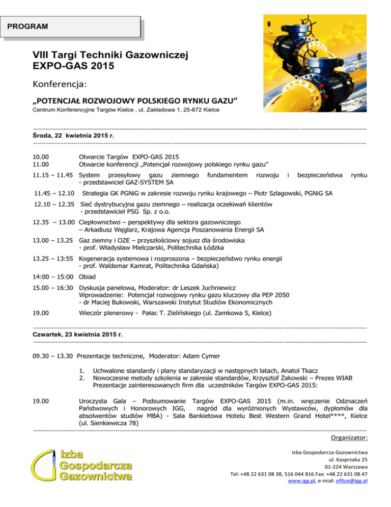 PROGRAM VIII Targi Techniki Gazowniczej EXPO-GAS 2015 Konferencja: „POTENCJAŁ ROZWOJOWY POLSKIEGO RYNKU GAZU” Centrum Konferencyjne Targów Kielce , ul. Zakładowa 1, 25-672 Kielce ---------------------------------------------------------------------------------------------------------------------------------------------------------------------Środa, 22 kwietnia 2015 r. ---------------------------------------------------------------------------------------------------------------------------------------------------------------------10.00 11.00 Otwarcie Targów EXPO-GAS 2015 Otwarcie konferencji „Potencjał rozwojowy polskiego rynku gazu” 11.15 – 11.45 System przesyłowy gazu ziemnego - przedstawiciel GAZ-SYSTEM SA 11.45 – 12.10 fundamentem rozwoju i bezpieczeństwa rynku Strategia GK PGNiG w zakresie rozwoju rynku krajowego – Piotr Szlagowski, PGNiG SA 12.10 – 12.35 Sieć dystrybucyjna gazu ziemnego – realizacja oczekiwań klientów - przedstawiciel PSG Sp. z o.o. 12.35 – 13.00 Ciepłownictwo – perspektywy dla sektora gazowniczego – Arkadiusz Węglarz, Krajowa Agencja Poszanowania Energii SA 13.00 – 13.25 Gaz ziemny i OZE – przyszłościowy sojusz dla środowiska - prof. Władysław Mielczarski, Politechnika Łódzka 13.25 – 13:55 Kogeneracja systemowa i rozproszona – bezpieczeństwo rynku energii - prof. Waldemar Kamrat, Politechnika Gdańska) 14:00 – 15:00 Obiad 15.00 – 16:30 Dyskusja panelowa, Moderator: dr Leszek Juchniewicz Wprowadzenie: Potencjał rozwojowy rynku gazu kluczowy dla PEP 2050 - dr Maciej Bukowski, Warszawski Instytut Studiów Ekonomicznych 19.00 Wieczór plenerowy - Pałac T. Zielińskiego (ul. Zamkowa 5, Kielce) ---------------------------------------------------------------------------------------------------------------------------------------------------------------------Czwartek, 23 kwietnia 2015 r. ---------------------------------------------------------------------------------------------------------------------------------------------------------------------09.30 – 13.30 Prezentacje techniczne, Moderator: Adam Cymer 1. 2. Uchwalone standardy i plany standaryzacji w następnych latach, Anatol Tkacz Nowoczesne metody szkolenia w zakresie standardów, Krzysztof Żakowski – Prezes WIAB Prezentacje zainteresowanych firm dla uczestników Targów EXPO-GAS 2015: 19.00 Uroczysta Gala – Podsumowanie Targów EXPO-GAS 2015 (m.in. wręczenie Odznaczeń Państwowych i Honorowych IGG, nagród dla wyróżnionych Wystawców, dyplomów dla absolwentów studiów MBA) - Sala Bankietowa Hotelu Best Western Grand Hotel****, Kielce (ul. Sienkiewicza 78) ------------------------------------------------------------------------------------------------------------------------------ ---------------------------------------- Organizator: Izba Gospodarcza Gazownictwa ul. Kasprzaka 25 01-224 Warszawa Tel: +48 22 631 08 38, 516 044 816 Fax: +48 22 631 08 47 www.igg.pl, e-miał: [email protected]