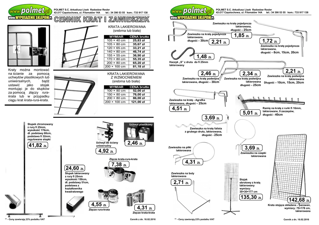 POLMET S.C. Arkadiusz Lisek Radosław Resler 42-217 Częstochowa, ul. Filomatów 14A tel.: 34 390 53 55 kom.: 733 917 138 POLMET S.C. Arkadiusz Lisek Radosław Resler 42-217 Częstochowa, ul. Filomatów 14A tel.: 34 390 53 55 kom.: 733 917 138 Zawieszka na kratę pojedyncza lakierowana, długość – 25cm KRATA LAKIEROWANA (srebrna lub biała) WYMIAR 105 × 40 cm 105 × 80 cm 120 × 65 cm 140 × 80 cm 155 × 55 cm 170 × 80 cm 200 × 80 cm 200 × 100 cm Kraty można montować na ścianie za pomocą uchwytów plastikowych lub uniwersalnych, bądź ustawić jako stojak montując je do słupków za pomocą złączy rurakrata lub w przypadku ciągu krat krata-rura-krata. CENA brutto 25,83 zł 35,67 zł 33,21 zł 46,74 zł 36,90 zł 55,35 zł 65,20 zł 81,18 zł KRATA LAKIEROWANA Z WZMOCNIENIEM (srebrna lub biała) WYMIAR 100 × 80 cm 150 × 80 cm 200 × 80 cm 200 × 100 cm CENA brutto 52,00 zł 76,00 zł 86,00 zł 121,00 zł Zawieszka na kratę pojedyncza lakierowana, długość – 30cm ZŁ 2,21 1,72 ZŁ Zawieszka na kratę pojedyncza lakierowana, długość – 8cm, 15cm, 20cm 1,48 ZŁ Haczyk „S” z drutu do fi 25mm lakierowany 2,46 ZŁ Zawieszka na kratę podwójna lakierowana, długość – 30cm 2,34 ZŁ Zawieszka na kratę podwójna lakierowana długość – 25cm 3,69 ZŁ 5,01 ZŁ Ramię na kratę z rurki fi 16mm, lakierowane, 9 zaczepów, długość - 40cm Uchwyt plastikowy Zawieszka na kratę falista z grubego drutu, lakierowana, długość - 25cm Uchwyt do ściany uniwersalny 41,82 ZŁ 2,46 ZŁ Zawieszka na piłki lakierowana 4,92 ZŁ Złącze krata-rura-krata 7,38 ZŁ 24,60 ZŁ 3,69 ZŁ Zawieszka na czapki lakierowana 4,31 ZŁ Zawieszka na buty lakierowana Słupek lakierowany z rury fi 25mm wysokość 150cm, dł. podstawy 51cm, podstawa z kształtownika kwadratowego 2,71 ZŁ Stojak obrotowy z kratą lakierowany wymiary: 30×30×177 cm 135,30 ZŁ 4,55 ZŁ Złącze rura-krata 4,31 ZŁ Cennik z dn. 16.02.2016 142,68 ZŁ Krata stojąca składana – parawan, wymiary: 75×178 cm, lakierowana Złącze krata-krata ** - Ceny zawierają 23% podatku VAT 2,21 ZŁ Zawieszka na kratę podwójna lakierowana Długość – 10cm, 15cm, 20cm Zawieszka na kratę - Agrafka lakierowana, długość – 25cm 4,51 ZŁ Słupek chromowany z rury fi 25mm, wysokość 176cm, dł. podstawy 60cm, podstawa fi 32mm, regulowane stopki 1,85 ZŁ ** - Ceny zawierają 23% podatku VAT Cennik z dn. 16.02.2016