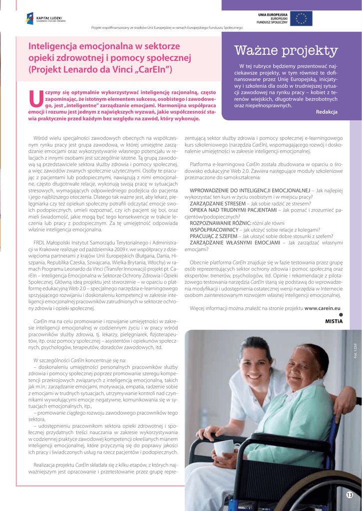 Projekt współfinansowany ze środków Unii Europejskiej w ramach Europejskiego Funduszu Społecznego Inteligencja emocjonalna w sektorze opieki zdrowotnej i pomocy społecznej (Projekt Lenardo da Vinci „CarEIn”) Wśród wielu specjalności zawodowych obecnych na współczesnym rynku pracy jest grupa zawodowa, w której umiejętne zarządzanie emocjami oraz wykorzystywanie własnego potencjału w relacjach z innymi osobami jest szczególnie istotne. Tą grupą zawodową są przedstawiciele sektora służby zdrowia i pomocy społecznej, a więc zawodów zwanych społecznie użytecznymi. Osoby te pracując z pacjentami lub podopiecznymi, nawiązują z nimi emocjonalne, często długotrwałe relacje, wykonują swoją pracę w sytuacjach stresowych, wymagających odpowiedniego podejścia do pacjenta i jego najbliższego otoczenia. Dlatego tak ważne jest, aby lekarz, pielęgniarka czy też opiekun społeczny potrafili odczytać emocje swoich podopiecznych, umieli rozpoznać, czy ich pacjent się boi, oraz mieli świadomość, jakie mogą być tego konsekwencje w trakcie leczenia lub pracy z podopiecznym. Za tę umiejętność odpowiada właśnie inteligencja emocjonalna. FRDL Małopolski Instytut Samorządu Terytorialnego i Administracji w Krakowie realizuje od października 2009 r. we współpracy z dziewięcioma partnerami z krajów Unii Europejskich (Bułgaria, Dania, Hiszpania, Republika Czeska, Szwajcaria, Wielka Brytania, Włochy) w ramach Programu Leonardo da Vinci (Transfer Innowacji) projekt pt. CarEIn – Inteligencja Emocjonalna w Sektorze Ochrony Zdrowia i Opieki Społecznej. Główną ideą projektu jest stworzenie – w oparciu o platformę edukacyjną Web 2.0 – specjalnego narzędzia e-learningowego sprzyjającego rozwijaniu i doskonaleniu kompetencji w zakresie inteligencji emocjonalnej pracowników zatrudnionych w sektorze ochrony zdrowia i opieki społecznej. CarEIn ma na celu promowanie i rozwijanie umiejętności w zakresie inteligencji emocjonalnej w codziennym życiu i w pracy wśród pracowników służby zdrowia, tj. lekarzy, pielęgniarek, fizjoterapeutów, itp. oraz pomocy społecznej – asystentów i opiekunów społecznych, psychologów, terapeutów, doradców zawodowych, itd. zentującą sektor służby zdrowia i pomocy społecznej e-learningowego kurs szkoleniowego (narzędzia CarEIn), wspomagającego rozwój i doskonalenie umiejętności w zakresie inteligencji emocjonalnej. Platforma e-learningowa CarEIn została zbudowana w oparciu o środowisko edukacyjne Web 2.0. Zawiera następujące moduły szkoleniowe przeznaczone do samokształcenia: WPROWADZENIE DO INTELIGENCJI EMOCJONALNEJ – Jak najlepiej wykorzystać ten kurs w życiu osobistym i w miejscu pracy? ZARZĄDZANIE STRESEM – Jak sobie radzić ze stresem? OPIEKA NAD TRUDNYMI PACJENTAMI – Jak poznać i zrozumieć pacjentów/podopiecznych? ROZPOZNAWANIE RÓŻNIC: różni ale równi WSPÓŁPRACOWNICY – jak ułożyć sobie relacje z kolegami? PRACUJĄC Z SZEFEM – Jak ułożyć sobie dobre stosunki z szefem? ZARZĄDZANIE WŁASNYMI EMOCJAMI – Jak zarządzać własnymi emocjami? Obecnie platforma CarEIn znajduje się w fazie testowania przez grupę osób reprezentujących sektor ochrony zdrowia i pomoc społeczną oraz ekspertów: trenerów, psychologów, itd. Opinie i rekomendacje z pilotażowego testowania narzędzia CarEIn staną się podstawą do wprowadzenia modyfikacji i udostępnienia ostatecznej wersji narzędzia w Internecie osobom zainteresowanym rozwojem własnej inteligencji emocjonalnej. Więcej informacji można znaleźć na stronie projektu www.carein.eu MISTiA Fot. 123rf U czymy się optymalnie wykorzystywać inteligencję racjonalną, często zapominając, że istotnym elementem sukcesu, osobistego i zawodowego, jest „inteligentne” zarządzanie emocjami. Harmonijna współpraca emocji i rozumu jest jednym z największych wyzwań, jakie współczesność stawia praktycznie przed każdym bez względu na zawód, który wykonuje. W tej rubryce będziemy prezentować najciekawsze projekty, w tym również te dofinansowane przez Unię Europejską, inicjatywy i szkolenia dla osób w trudniejszej sytuacji zawodowej na rynku pracy – kobiet z terenów wiejskich, długotrwale bezrobotnych oraz niepełnosprawnych. Redakcja W szczególności CarEIn koncentruje się na: – doskonaleniu umiejętności personalnych pracowników służby zdrowia i pomocy społecznej poprzez promowanie szeregu kompetencji przekrojowych związanych z inteligencją emocjonalną, takich jak m.in.: zarządzanie emocjami, motywacja, empatia, radzenie sobie z emocjami w trudnych sytuacjach, utrzymywanie kontroli nad czynnikami wywołującymi emocje negatywne, komunikowania się w sytuacjach emocjonalnych, itp., – promowanie ciągłego rozwoju zawodowego pracowników tego sektora, – udostępnieniu pracownikom sektora opieki zdrowotnej i społecznej przydatnych treści nauczania w zakresie wykorzystywania w codziennej praktyce zawodowej kompetencji określanych mianem inteligencji emocjonalnej, które przyczynią się do poprawy jakości ich pracy i świadczonych usług na rzecz pacjentów i podopiecznych. Realizacja projektu CarEIn składała się z kilku etapów, z których najważniejszym jest opracowanie i przetestowanie przez grupę repre- 13