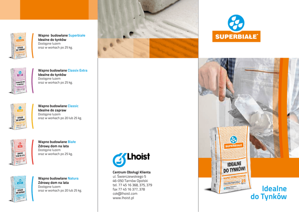 Wapno budowlane Superbiałe Idealne do tynków Dostępne luzem oraz w workach po 25 kg. Wapno budowlane Classix Extra Idealne do tynków Dostępne luzem oraz w workach po 25 kg. Wapno budowlane Classic Idealne do zapraw Dostępne luzem oraz w workach po 20 lub 25 kg. Wapno budowlane Białe Zdrowy dom na lata Dostępne luzem oraz w workach po 25 kg. Wapno budowlane Natura Zdrowy dom na lata Dostępne luzem oraz w workach po 20 lub 25 kg. Centrum Obsługi Klienta ul. Świerczewskiego 5 46-050 Tarnów Opolski tel. 77 45 16 368, 375, 379 fax 77 45 16 377, 378 [email protected] www.lhoist.pl Idealne do Tynków zdrowe i śnieżnobiałe tynki na lata Trwałe i zdrowe tynki Super-białe tynki Dobrze się kładzie Trwalszy i bardziej odporny na uszkodzenia tynk dzięki zastosowaniu wapna hydratyzowanego. Utwardzona powierzchnia zapewnia większą odporność na uszkodzenia. Tynki wapienne wyprodukowano w 100% z naturalnych złóż i są odporne na korozję biologiczną Zapobiegają powstawaniu grzybów i wykwitów „Superbiałe” charakteryzuje się najwyższym stopniem białości. Odpowiednio przygotowana zaprawa, zminimalizuje koszty malowania w celu uzyskania śnieżnobiałego efektu Wysoka plastyczności urabialność pozwoli Ci łatwo przygotować zaprawę. Znakomity współczynnik powierzchni właściwej BET pozwala na skrócenie czasu mieszania w celu uzyskania jednolitej konsystencji zaprawy tynkarskiej. Stosowanie wapna „Superbiałego” znacznie obniża koszty przygotowania tynku. Szczególnie rekomendowane dla osób z alergiami 100% naturalne składniki Bez dodatków syntetycznych i sztucznych barwników Brak konieczności podwójnego malowania Mniejsze koszty gotowego tynków niż przy stosowaniu zapraw gotowych Mniejsze zużycie farb Śnieżnobiałe ściany Szybkie i wygodne przygotowanie zaprawy Odpowiednia plastyczność i łatwość aplikacji Tynki twarde i bardziej odporne na uszkodzenia Zwiększona wydajność zaprawy Obniżenie kosztu tynku