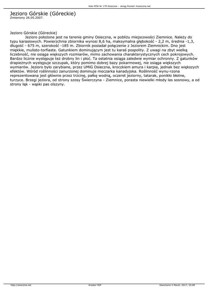Koło PZW Nr 179 Osieczna - okręg Poznań #osieczna.net Jezioro Górskie (Góreckie) Zmieniony 26.05.2007. Jezioro Górskie (Góreckie) Jezioro położone jest na terenie gminy Osieczna, w pobliżu miejscowości Ziemnice. Należy do typu karasiowych. Powierzchnia zbiornika wynosi 8,6 ha, maksymalna głębokość - 2,2 m, średnia -1,3, długość - 675 m, szerokość -185 m. Zbiornik posiadał połączenie z Jeziorem Ziemnickim. Dno jest miękkie, mulisto-torfiaste. Gatunkiem dominującym jest tu karaś pospolity. Z uwagi na zbyt wielką liczebność, nie osiąga większych rozmiarów, mimo zachowania charakterystycznych cech pokrojowych. Bardzo licznie występuje też drobny lin i płoć. Ta ostatnia osiąga zaledwie wymiar ochronny. Z gatunków drapieżnych występuje szczupak, który pomimo dobrej bazy pokarmowej, nie osiąga większych wymiarów. Jezioro było zarybiane, przez UMiG Osieczna, kroczkiem amura i karpia, jednak bez większych efektów. Wśród roślinności zanurzonej dominuje moczarka kanadyjska. Roślinność wynu-rzona reprezentowana jest głównie przez trzcinę, pałkę wodną, oczeret jeziorny, tatarak, ponikło błotne, turzyce. Brzegi jeziora, od strony szosy Świerczyna - Ziemnice, porasta niewielki młody las sosnowy, a od strony łąk - wąski pas olszyny. http://osieczna.net Kreator PDF Utworzono 4 March, 2017, 10:08