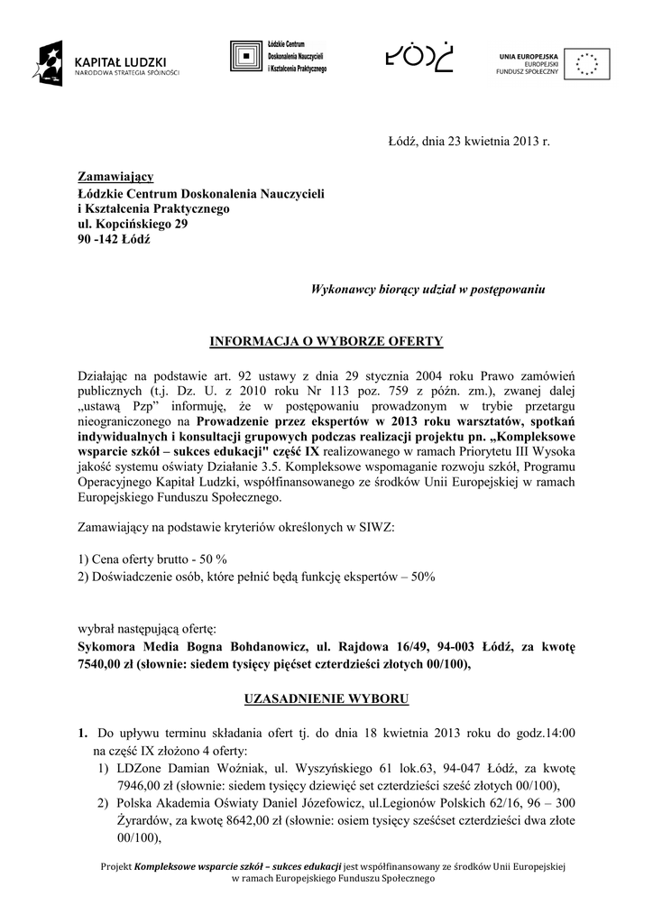 Łódź, dnia 23 kwietnia 2013 r. Zamawiający Łódzkie Centrum Doskonalenia Nauczycieli i Kształcenia Praktycznego ul. Kopcińskiego 29 90 -142 Łódź Wykonawcy biorący udział w postępowaniu INFORMACJA O WYBORZE OFERTY Działając na podstawie art. 92 ustawy z dnia 29 stycznia 2004 roku Prawo zamówień publicznych (t.j. Dz. U. z 2010 roku Nr 113 poz. 759 z późn. zm.), zwanej dalej „ustawą Pzp” informuję, Ŝe w postępowaniu prowadzonym w trybie przetargu nieograniczonego na Prowadzenie przez ekspertów w 2013 roku warsztatów, spotkań indywidualnych i konsultacji grupowych podczas realizacji projektu pn. „Kompleksowe wsparcie szkół – sukces edukacji" część IX realizowanego w ramach Priorytetu III Wysoka jakość systemu oświaty Działanie 3.5. Kompleksowe wspomaganie rozwoju szkół, Programu Operacyjnego Kapitał Ludzki, współfinansowanego ze środków Unii Europejskiej w ramach Europejskiego Funduszu Społecznego. Zamawiający na podstawie kryteriów określonych w SIWZ: 1) Cena oferty brutto - 50 % 2) Doświadczenie osób, które pełnić będą funkcję ekspertów – 50% wybrał następującą ofertę: Sykomora Media Bogna Bohdanowicz, ul. Rajdowa 16/49, 94-003 Łódź, za kwotę 7540,00 zł (słownie: siedem tysięcy pięćset czterdzieści złotych 00/100), UZASADNIENIE WYBORU 1. Do upływu terminu składania ofert tj. do dnia 18 kwietnia 2013 roku do godz.14:00 na część IX złoŜono 4 oferty: 1) LDZone Damian Woźniak, ul. Wyszyńskiego 61 lok.63, 94-047 Łódź, za kwotę 7946,00 zł (słownie: siedem tysięcy dziewięć set czterdzieści sześć złotych 00/100), 2) Polska Akademia Oświaty Daniel Józefowicz, ul.Legionów Polskich 62/16, 96 – 300 śyrardów, za kwotę 8642,00 zł (słownie: osiem tysięcy sześćset czterdzieści dwa złote 00/100), Projekt Kompleksowe wsparcie szkół – sukces edukacji jest współfinansowany ze środków Unii Europejskiej w ramach Europejskiego Funduszu Społecznego 3) Sykomora Media Bogna Bohdanowicz, ul. Rajdowa 16/49, 94-003 Łódź, za kwotę 7540,00 zł (słownie: siedem tysięcy pięćset czterdzieści złotych 00/100), 4) PCG Polska Sp. z o.o. ul. Fabryczna 17, 90 – 344 Łódź, za kwotę 9 084,00 zł (słownie: dziewięć tysięcy osiemdziesiąt cztery złote 00/100) 2. Wybór najkorzystniejszej oferty: Nazwa wykonawcy (imię i nazwisko Wykonawcy) LDZone Damian Woźniak, ul. Wyszyńskiego 61 lok.63, 94-047 Łódź, Polska Akademia Oświaty Daniel Józefowicz, ul.Legionów Polskich 62/16, 96 – 300 śyrardów Sykomora Media Bogna Bohdanowicz, ul. Rajdowa 16/49, 94003 Łódź PCG Polska Sp. z o.o. ul. Fabryczna 17, 90 – 344 Łódź Cena Kryterium: Cena oferty brutto Kryterium: Doświadczenie osób, które pełnić będą funkcję ekspertów Razem liczba punktów Miejsce 5,00 pkt. 52,48 pkt IV 43,62 pkt 21,66 pkt 65,28 pkt III 7 540,00 50,00 pkt 30,00 pkt 80,00 pkt I 9 084,00 41,50 pkt 30,00 pkt 71,50 pkt II 7 940,00 zł 47,48 pkt. 8 642,00 zł Oferta złoŜona przez Sykomora Media Bogna Bohdanowicz, ul. Rajdowa 16/49, 94-003 Łódź, za kwotę 7540,00 zł (słownie: siedem tysięcy pięćset czterdzieści złotych 00/100),spełnia warunki SIWZ i jest zgodna z ustawą Pzp. W ocenie dokonanej na podstawie kryterium określonego w SIWZ oferta uzyskała 80,00 punktów. Zaoferowana cena nie przekracza kwoty, którą Zamawiający moŜe przeznaczyć na sfinansowanie zamówienia. 3. Zgodnie z art. 94 ust. 2 pkt. 1a) ustawy Pzp zawarcie umowy na realizację zamówienia moŜe nastąpić przed upływem terminu określonego w art. 94 ust. 1 pkt. 2 ustawy Pzp. Prosimy o potwierdzenie otrzymania niniejszego pisma. Jan Moos Dyrektor Łódzkiego Centrum Doskonalenia Nauczycieli i Kształcenia Praktycznego Projekt Kompleksowe wsparcie szkół – sukces edukacji jest współfinansowany ze środków Unii Europejskiej w ramach Europejskiego Funduszu Społecznego