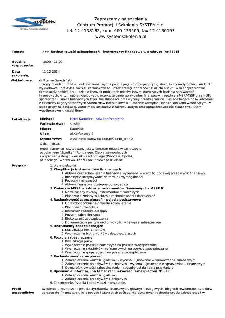 Zapraszamy na szkolenia Centrum Promocji i Szkolenia SYSTEM s.c. tel. 12 4138182, kom. 660 433566, fax 12 4136197 www.systemszkolenia.pl Temat: >>> Rachunkowość zabezpieczeń - instrumenty finansowe w praktyce [nr 4175] Godzina rozpoczęcia: 10:00 - 15:00 Data szkolenia: 11-12-2014 Wykładowcy: Lokalizacja: dr drRoman RomanSeredyński Seredyński - -biegły biegłyrewident, rewident,doktor doktornauk naukekonomicznych ekonomicznychi iprezes prezesprężnie prężnierozwijającej rozwijającejsię, się,dużej dużejfirmy firmyaudytorskiej; audytorskiej;wieloletni wieloletni wykładowca wykładowcai ipraktyk praktykzzzakresu zakresurachunkowości. rachunkowości.Przez Przezszereg szereglat latpracownik pracownikdziału działuaudytu audytuwwmiędzynarodowej międzynarodowej firmie firmieaudytorskiej. audytorskiej.Brał Brałudział udziałwwlicznych licznychprojektach projektachmiędzy międzyinnymi innymidotyczących dotyczącychbadania badaniasprawozdań sprawozdań finansowych, finansowych,wwtym tymspółek spółekgiełdowych, giełdowych,przekształcania przekształcaniasprawozdań sprawozdańfinansowych finansowychzgodnie zgodniezzMSR/MSSF MSR/MSSForaz orazHGB, HGB, sporządzaniu sporządzaniuanaliz analizfinansowych finansowychtypu typuDue DueDilligence Dilligenceoraz orazwyceny wycenyprzedsiębiorstw. przedsiębiorstw.Posiada Posiadabogate bogatedoświadczenie doświadczenie zzdziedziny dziedzinyMiędzynarodowych MiędzynarodowychStandardów StandardówRachunkowości. Rachunkowości.Obecnie Obecniezarządza zarządzai ikieruje kierujespółkami spółkamiwchodzącymi wchodzącymiww skład składgrupy grupyholdingowej. holdingowej.Autor Autorwielu wieluartykułów artykułówzzzakresu zakresuaudytu audytuoraz orazsprawozdawczości sprawozdawczościfinansowej. finansowej.Stały Stały współpracownik współpracowniknaszej naszejfirmy. firmy. Miejsce: Hotel Katowice - sala konferencyjna Miejsce: Hotel Katowice - sala konferencyjna Województwo: śląskie Województwo: śląskie Miasto: Katowice Miasto: Katowice Ulica: Ulica: Strona www: Strona www: al.Korfantego 99 al.Korfantego www.hotel-katowice.com.pl/?page_id=49 www.hotel-katowice.com.pl/?page_id=49 Opis miejsca: Opis miejsca: Hotel "Katowice" usytuowany jest ww centrum miasta ww sąsiedztwie Hotel "Katowice" usytuowany jest centrum miasta sąsiedztwie popularnego "Spodka" i Ronda gen. Ziętka, stanowiących popularnego "Spodka" i Ronda gen. Ziętka, stanowiących skrzyżowanie dróg z kierunku zachodniego (Wrocław, Opole), skrzyżowanie dróg z kierunku zachodniego (Wrocław, Opole), północnego (Warszawa, Łódź) i południowego (Bielsko). północnego (Warszawa, Łódź) i południowego (Bielsko). Program: Profil uczestników: 1. Wprowadzenie 2. Klasyfikacja instrumentów finansowych 1. Aktywa oraz zobowiązania finansowe wyceniana w wartości godziwej przez wynik finansowy 2. Inwestycje utrzymywane do terminu wymagalności 3. Pożyczki i należności 4. Aktywa finansowe dostępne do sprzedaży 3. Zmiany w MSSF w zakresie instrumentów finansowych – MSSF 9 1. Nowe zasady wyceny instrumentów finansowych 2. Planowane zmiany w zakresie rachunkowości zabezpieczeń 4. Rachunkowość zabezpieczeń – pojęcia podstawowe 1. Uprawdopodobnione przyszłe zobowiązanie 2. Planowana transakcja 3. Instrument zabezpieczający 4. Pozycja zabezpieczana 5. Efektywność zabezpieczenia 6. Dokumentacja polityki rachunkowości w zakresie zabezpieczeń 5. Instrumenty zabezpieczające 1. Klasyfikacja instrumentów 2. Wyznaczanie instrumentów zabezpieczających 6. Pozycje zabezpieczane 1. Kwalifikacja pozycji 2. Wyznaczanie pozycji finansowych na pozycje zabezpieczane 3. Wyznaczanie składników niefinansowych na pozycje zabezpieczane 4. Wyznaczanie grupy pozycji na pozycje zabezpieczane 7. Rachunkowość zabezpieczeń 1. Zabezpieczenie wartości godziwej – wycena i ujmowanie w sprawozdaniu finansowym 2. Zabezpieczenie przepływów pieniężnych – wycena i ujmowanie w sprawozdaniu finansowym 3. Ocena efektywności zabezpieczenia – sposoby ustalania na przykładzie 8. Ujawnianie informacji na temat rachunkowości zabezpieczeń MSSF7 1. Zabezpieczenie wartości godziwej 2. Zabezpieczenie przepływów pieniężnych 9. Zakończenie. Pytania i odpowiedzi, konsultacje. Szkolenie przeznaczone jest dla dyrektorów finansowych, głównych księgowych, biegłych rewidentów, członków zarządu d/s finansowych, księgowych i wszystkich osób zainteresowanych rachunkowością zabezpieczeń w przedsiębiorstwie. Cel szkolenia: Zzapoznanie uczestników z rachunkowością zabezpieczeń w praktyce przedsiębiorstw. W trakcie zajęć przedstawione zostaną m.in.: instrumenty zabezpieczające, efektywność zabezpieczenia, dokumentacja polityki rachunkowości w zakresie zabezpieczeń oraz wycena i ujęcie zabezpieczeń w sprawozdaniu finansowym. Przedstawione zostaną standardy rachunkowości dotyczące instrumentów finansowych (MSSF 9 - nowy standard) oraz instrumenty finansowe: ujawnianie informacji (MSSF 7). Forma szkolenia: Szkolenie o powyższej tematyce możemy zrealizować na Państwa potrzeby w formie szkolenia zamkniętego. Zainteresowane osoby prosimy o kontakt z naszym biurem tel. 12 413-81-82 Certyfikaty: Uczestnik otrzymuje certyfikat ukończenia szkolenia Cena: Liczba osób z jednej firmy Cena jedna osoba z firmy 490.00 netto zł./osobę (602.70 zł. brutto) dwie i więcej 460.00 netto zł./osobę (565.80 zł. brutto) UWAGA: opłata za szkolenie zwolniona z VAT dla jednostek finansujących udział w szkoleniu w co najmniej 70% lub w całości ze środków publicznych. Uczestników, których dotyczy zwolnienie z VAT prosimy o wypełnienie i przesłanie podpisanego oświadczenia. POBIERZ OŚWIADCZENIE < Cena zawiera: Warunki uczestnictwa: udział w zajęciach, konsultacje autorskie materiały szkoleniowe, poczęstunek w przerwie kawowej, lunch, imienne zaświadczenie uczestnictwa Zgłoszenia uczestnictwa można dokonać przez: - formu