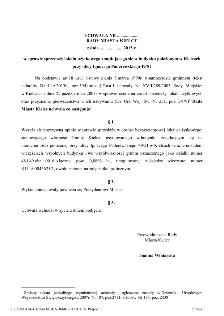 UCHWAŁA NR .................... RADY MIASTA KIELCE z dnia .................... 2015 r. w sprawie sprzedaży lokalu użytkowego znajdującego się w budynku położonym w Kielcach przy ulicy Ignacego Paderewskiego 49/51 Na podstawie art.18 ust.1 ustawy z dnia 8 marca 1990r. o samorządzie gminnym (tekst jednolity Dz. U. z 2013r., poz.594) oraz § 7 ust.1 uchwały Nr XVII/289/2003 Rady Miejskiej w Kielcach z dnia 22 października 2003r w sprawie ustalenia zasad sprzedaży lokali użytkowych oraz przyznania pierwszeństwa w ich nabywaniu (Dz. Urz. Woj. Św. Nr 251, poz. 2479)1) Rada Miasta Kielce uchwala co następuje: § 1. Wyraża się pozytywną opinię w sprawie sprzedaży w drodze bezprzetargowej lokalu użytkowego, stanowiącego własność Gminy Kielce, usytuowanego w budynku znajdującym się na nieruchomości położonej przy ulicy Ignacego Paderewskiego 49/51 w Kielcach wraz z udziałem w częściach wspólnych budynku i we współwłasności gruntu oznaczonego jako działki numer 48 i 49 obr 0016 o łącznej pow. 0,0893 ha, uregulowanej w księdze wieczystej numer KI1L/00045625/1, uwidocznionej na załączniku graficznym. § 2. Wykonanie uchwały powierza się Prezydentowi Miasta. § 3. Uchwała wchodzi w życie z dniem podjęcia. Przewodnicząca Rady Miasta Kielce Joanna Winiarska Zmiany tekstu jednolitego wymienionej uchwały ogłoszone zostały w Dzienniku Urzędowym Województwa Świętokrzyskiego z 2007r, Nr 187, poz.2711, z 2008r. Nr 184, poz. 2438 1) Id: 02B6FA34-4B20-4C0B-BA18-60129425C4C5. Projekt Strona 1 Uzasadnienie Lokal użytkowy znajduje się w budynku położonym w Kielcach przy ul. Ignacego Paderewskiego 49/51.Jest w nim prowadzona działalność handlowa - księgarnia. Przedmiotowy lokal jest użytkowany przez obecnego najemcę na podstawie umowy najmu zawartej 18.11.2005 r. Powierzchnia użytkowa lokalu, ustalona zgodnie z ustawą z dnia 21 czerwca 2001 roku o ochronie praw lokatorów, mieszkaniowym zasobie gminy i o zmianie Kodeksu cywilnego (Dz.U. z 2014 roku, poz.150 ze zm.) wynosi 214 m2. Zgodnie z §5 uchwały Nr XVII/289/2003 Rady Miejskiej w Kielcach z dnia 22 października 2003r (Dz.Urz. Woj. Św. Nr 251, poz.2479 ze zm.) w sprawie ustalenia zasad sprzedaży lokali użytkowych oraz przyznania pierwszeństwa w ich nabywaniu, osobom korzystającym z lokali użytkowych na podstawie umowy najmu lub dzierżawy przez okres co najmniej trzech lat licząc do dnia złożenia wniosku o nabycie lokalu i nie zalegającym z opłatą czynszu i innych opłat na rzecz Miasta Kielce, służy prawo pierwszeństwa w jego nabyciu. Ponieważ najemca przedmiotowego lokalu wystąpił z wnioskiem o nabycie lokalu i spełnia wszystkie przesłanki określone ww. przepisem proponuje się zbycie lokalu i podjęcie przedmiotowej uchwały. Id: 02B6FA34-4B20-4C0B-BA18-60129425C4C5. Projekt Strona 2 Id: 02B6FA34-4B20-4C0B-BA18-60129425C4C5. Projekt Strona 3