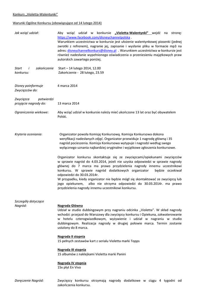 Konkurs „Violetta-Walentynki” Warunki Ogólne Konkursu (obowiązujące od 14 lutego 2014) Jak wziąć udział: Aby wziąć udział w konkursie „Violetta-Walentynki” wejdź na stronę: https://www.facebook.com/disneychannelpolska . Warunkiem uczestnictwa w konkursie jest ułożenie walentynkowej piosenki (jednej zwrotki z refrenem), nagranie jej, zapisanie i wysłanie pliku w formacie mp3 na adres: [email protected] . Warunkiem uczestnictwa w konkursie jest również nadesłanie wypełnionego oświadczenia o przeniesieniu majątkowych praw autorskich zawartego poniżej. Start i konkursu: Start – 14 lutego 2014, 12.00 Zakończenie - 28 lutego, 23.59 zakończenie Disney poinformuje Zwycięzców do: Zwycięzca potwierdzi przyjęcie nagrody do: Ograniczenia wiekowe: Kryteria oceniania: 4 marca 2014 13 marca 2014 Aby wziąć udział w konkursie należy mieć ukończone 13 lat oraz być obywatelem Polski. Organizator powoła Komisję Konkursową. Komisja Konkursowa dokona weryfikacji nadesłanych zdjęć. Organizator przewiduje 1 nagrodę główną i 35 nagród pocieszenia. Komisja Konkursowa wytypuje i nagrodzi według swego wyłącznego uznania najbardziej oryginalne i wyjątkowe zgłoszenia konkursowe. Organizator konkursu skontaktuje się ze zwycięzcami/opiekunami zwycięzców w sprawie nagród do 4.03.2014, jeżeli nie uzyska odpowiedzi w sprawie nagrody głównej do 7 marca ma prawo przydzielenia nagrody innemu uczestnikowi konkursu. W sprawie nagród dodatkowych organizator będzie oczekiwał odpowiedzi do 30.03.2014r. W przypadku, kiedy organizator nie będzie mógł się skontaktować ze zwycięzcą lub jego opiekunem, albo nie otrzyma odpowiedzi do 30.03.2014r. ma prawo przydzielenia nagrody innemu uczestnikowi konkursu. Szczegóły dotyczące Nagród: Nagroda Główna Udział w studio dubbingowym przy nagraniu odcinka „Violetta”. W skład nagrody wchodzi: przejazd do Warszawy dla zwycięzcy konkursu i Opiekuna, zakwaterowanie w hotelu czterogwiazdkowym, wyżywienie i udział w nagraniu w studio dubbingowym. Realizacja nagrody w drugiej połowie marca. Termin zostanie ustalony do 8 marca. Nagroda II stopnia 15 pełnych zestawów kart z serialu Violetta marki Topps Nagroda III stopnia 15 albumów z naklejkami Violetta marki Panini Nagroda IV stopnia 15x płyt En Vivo Doręczenie Nagród: Zwycięzcy konkursu otrzymają nagrody dodatkowe w ciągu 4 tygodni od zakończenia konkursu. Warunki Ogólne Organizatorem niniejszego konkursu jest The Walt Disney Company Limited. Building 12, 566 Chiswick High Road, London W4 5AN („Disney”). W przypadku jakichkolwiek pytań, proszę kontaktować się z Biurem Obsługi Klienta poprzez adres e-mail [email protected] . Biorąc udział w konkursie, wy („Wy”, „Uczestnik/Uczestnicy”) oraz gdy ma to zastosowanie – Wasi rodzice/przedstawiciele ustawowi (zwani łącznie „Rodzicem”), przyjmujecie i zgadzacie się na warunki określone w poniższych Warunkach Ogólnych. 1. 2. 3. Kwalifikacja. a. Konkurs nie jest dostępny dla pracowników (i ich najbliższych rodzin) Disney’a, jego oddziałów lub jakiejkolwiek innej osoby związanej zawodowo z tym konkursem. b. Jeżeli nie zostało to inaczej uregulowane, maksymalnie jedno (1) zgłoszenie konkursowe przypada na osobę. Niedopuszczalne są zgłoszenia dokonywane za pośrednictwem przedstawicieli lub osób trzecich, a także wykorzystywanie wielu tożsamości lub adresów e-mail. Niedozwolone jest wykorzystywanie narzędzi lub programów automatycznych, a wszystkie takie zgłoszenia konkursowe zostaną zdyskwalifikowane. c. Akceptowane będą wyłącznie zgłoszenia internetowe dokonane z komputerów osobistych (takich jak PC) za pośrednictwem aplikacji danego konkursu. Zgłoszenie konkursowe należy dokonać przez Internet przed datą zakończenia. Dane osobowe. Dokonując zgłoszenia konkursowego udostępniasz swoje dane spółce Disney (lub jej przedstawicielom), a nie portalowi Facebook. W celu przystąpienia do zgłoszenia konkursowego prosimy o podanie swojej nazwy użytkownika i adresu e-mail. Disney (i/lub jej przedstawiciele) zachowa twój adres e-mail/nr telefonu z portalu Facebook (jako daną użytkownika), w celu zarządzania twoim dostępem do konkursu. Twoje dane osobowe (tj. Twoje imię i nazwisko, imię i nazwisko rodzica lub przedstawiciela ustawowego, adres e-mail, adres zamieszkania, data urodzenia, wizerunek, pseudonim, numer telefonu) będą wykorzystywane zgodnie z obowiązującą opublikowaną Polityką zachowania prywatności Disneya i mogą być przekazywane do naszych przedstawicieli w celu administrowania konkursem, wysyłania nagród i umożliwienia spółce Disney promowania konkursu oraz produktów i usług Disney’a (w tym produktów i usług jakiegokolwiek partnera, będącego sponsorem konkursu) we wszystkich mediach, w tym między innymi Disney TV, w Internecie, innych kanałach publikacji i serwisach społecznościowych. Dane osobowe będą wykorzystywane w celach marketingowych wyłącznie wtedy, gdy zgodziłeś się na otrzymywanie informacji marketingowych od Disney’a w przyszłości (mogłeś to zrobić, jeżeli wcześniej zarejestrowałeś swoje dane w Disney). Wyłonienie Zwycięzców. a. W przypadku konkursów opartych na umiejętnościach, zwycięzcy będą wyłonieni przez zespół sędziów według kryteriów oceny określonych powyżej. Sędziowie będą decydowali o przyznaniu każdej z nagród według swojego absolutnego i wyłącznego uznania (w przypadku, gdy zwycięzcy są wybierani spośród uzyskujących najlepsze wyniki, wybierzemy zwycięzców według najlepszych wyników, jeśli nie wskazano inaczej). b. W przypadku konkursów, w których przesyłane są treści o charakterze twórczym: i. Disney będzie moderować wszystkie zgłoszenia i zastrzega sobie prawo do nieakceptowania zgłoszeń, które są nieakceptowane pod względem technicznym, zawierają nieodpowiednie materiały lub naruszają którekolwiek z niniejs