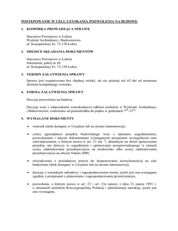 POSTĘPOWANIE W CELU UZYSKANIA POZWOLENIA NA BUDOWĘ 1. KOMÓRKA PROWADZĄCA SPRAWĘ Starostwo Powiatowe w Łobzie Wydział Architektury i Budownictwa ul. Konopnickiej 41; 73-150 Łobez 2. MIEJSCE SKŁADANIA DOKUMENTÓW Starostwo Powiatowe w Łobzie Sekretariat, pokój nr 20 ul. Konopnickiej 41; 73-150 Łobez 3. TERMIN ZAŁATWIENIA SPRAWY Sprawa jest rozpatrywana bez zbędnej zwłoki, ale nie później niż 65 dni od momentu złożenia kompletnego wniosku. 4. FORMA ZAŁATWIENIA SPRAWY Decyzja pozwolenia na budowę. Decyzję wraz z załącznikami wnioskodawca odbiera osobiście w Wydziale Architektury i Budownictwa, codziennie od poniedziałku do piątku w godzinach 730-1530. 5. WYMAGANE DOKUMENTY  wniosek (druk dostępny w Urzędzie lub na stronie internetowej),  cztery egzemplarze projektu budowlanego wraz z opiniami, uzgodnieniami, pozwoleniami i innymi dokumentami wymaganymi przepisami szczególnymi oraz zaświadczeniem, o którym mowa w art. 12 ust. 7, aktualnym na dzień opracowania projektu; nie dotyczy to uzgodnienia i opiniowania przeprowadzanego w ramach oceny oddziaływania przedsięwzięcia na środowisko albo oceny oddziaływania przedsięwzięcia na obszar Natura 2000,  oświadczenie o posiadanym prawie do dysponowania nieruchomością na cele budowlane (druk dostępny w Urzędzie lub na stronie internetowej),  decyzję o warunkach zabudowy i zagospodarowania terenu, jeżeli jest ona wymagana zgodnie z przepisami o planowaniu i zagospodarowaniu przestrzennym,  pozwolenie, o którym mowa w art. 23 i art. 23a ustawy z dnia 21 marca 1991 r. o obszarach morskich Rzeczypospolitej Polskiej i administracji morskiej, jeżeli jest ono wymagane,  w przypadku obiektów zakładów górniczych oraz obiektów usytuowanych na terenach zamkniętych i terenach, o których mowa w art. 82 ust. 3 pkt 1, postanowienie o uzgodnieniu z organem administracji architektoniczno-budowlanej, o którym mowa w art. 82 ust. 2, projektowanych rozwiązań w zakresie:  linii zabudowy oraz elewacji obiektów budowlanych projektowanych od strony dróg, ulic, placów i innych miejsc publicznych,  przebiegu i charakterystyki technicznej dróg, linii komunikacyjnych oraz sieci uzbrojenia terenu, wyprowadzonych poza granice terenu zamkniętego, portów morskich i przystani morskich, a także podłączeń tych obiektów do sieci użytku publicznego,  w przypadku drogi w transeuropejskiej sieci drogowej:  wynik audytu bezpieczeństwa ruchu drogowego, o którym mowa w art. 24l ust. 1 ustawy z dnia 21 marca 1985 r. o drogach publicznych,  uzasadnienie zarządcy drogi, o którym mowa w art. 24l ust. 4 ustawy z dnia 21 marca 1985 r. o drogach publicznych,  do wniosku o pozwolenie na budowę obiektów budowlanych:  których wykonanie lub użytkowanie może stwarzać poważne zagrożenie dla użytkowników, takich jak: obiekty energetyki jądrowej, rafinerie, zakłady chemiczne, zapory wodne lub których projekty budowlane zawierają nowe, niesprawdzone w krajowej praktyce, rozwiązania techniczne, nieznajdujące podstaw w przepisach i Polskich Normach, należy dołączyć specjalistyczną opinię wydaną przez osobę fizyczną lub jednostkę organizacyjną wskazaną przez właściwego ministra,  upoważnienie udzielone osobie działającej w imieniu inwestora. 6. OPŁATY Opłata skarbowa uiszczana jest z chwilą złożenia wniosku o dokonanie czynności urzędowej i wynosi: 1) na budowę obiektu budowlanego oraz urządzeń budowlanych związanych z obiektem budowlanym:  budynku przeznaczonego na prowadzenie działalności gospodarczej innej niż rolnicza i leśna:  za każdy m2 powierzchni użytkowej - 1 zł  nie więcej niż - 539 zł  budynku służącego celom gospodarczym w gospodarstwie rolnym - 14 zł  innego budynku - 48 zł  studni oraz urządzeń do usuwania nieczystości stałych i ścieków - 20 zł  budowli związanych z produkcją rolną - 112 zł  sieci wodociągowych, kanalizacyjnych, elektroenergetycznych, telekomunikacyjnych, gazowych, cieplnych oraz dróg, z wyjątkiem dróg dojazdowych, dojść do budynków i zjazdów z drogi o długości powyżej 1 kilometra - 2143 zł  sieci wodociągowych, kanalizacyjnych, elektroenergetycznych, telekomunikacyjnych, gazowych, cieplnych oraz dróg o długości do 1 kilometra - 105 zł  innych budowli - 155 zł  urządzeń budowlanych związanych z obiektem budowlanym - 91 zł W przypadku wydawania pozwolenia na budowę budynku o funkcji mieszanej, przy obliczaniu opłaty skarbowej nie uwzględnia się powierzchni mieszkalnej tego budynku. W przypadku wydawania pozwolenia na budowę obejmującego więcej niż jeden obiekt budowlany wymieniony w niniejszym ustępie, opłatę skarbową pobiera się od każdego obiektu odrębnie. 2) na przebudowę lub remont obiektu budowlanego oraz na wznowienie robót budowlanych - 50% stawek określonych w pkt 1 3) zatwierdzenie projektu budowlanego - 47 zł 4) złożenie dokumentu stwierdzającego udzielenie pełnomocnictwa lub prokury oraz jego odpis, wypis lub kopia - od każdego stosunku pełnomocnictwa (prokury) - 17 zł Zwolnione z opłaty skarbowej są:  sprawy budownictwa mieszkaniowego,  budowa lub remont obiektów budowlanych zniszczonych lub uszkodzonych wskutek działalności spowodowanej ruchem zakładu górniczego lub klęsk żywiołowych,  budynki przeznaczone na cele naukowe, socjalne i kulturalne,  remont obiektów budowlanych wpisanych do rejestru zabytków,  państwa obce pod warunkiem wzajemności,  jednostki budżetowe,  jednostki samorządu terytorialnego,  organizacje pożytku publicznego. Opłatę skarbową, z wyszczególnieniem czego dotyczy wpłata, można uiścić w formie gotówkowej w:   kasie Urzędu Miejskiego w Łobzie, sekretariacie Starostwa Powiatowego w Łobzie (bez prowizji); lub w formie bezgotówkowej na konto organu podatkowego:  Urząd Miejski w Łobzie BS Goleniów O/Łobez nr konta: 89 9375 1038 2600 4835 2000 0010 7. TRYB ODWOŁAWCZY Odwołanie wnosi się do Wojewody Zachodniopomorskiego w Sz