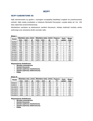 SEJFY SEJFY GABINETOWE SG Sejfy skonstruowane są zgodnie z wymogami europejskiej klasyfikacji urządzeń do przechowywania wartości. Sejfy zostały przebadane w Instytucie Mechaniki Precyzyjnej i uzyskał atesty od I do VIII klasy odporności przeciwwłamaniowej. Standardowo zamykane są atestowanym zamkiem kluczowym. Istnieje możliwość montażu zamka szyfrowego oraz zamykanej skrytki wewnątrz sejfu. Klasa I Model SG40/I SG50/I SG60/I SG70/I SG80/I SG100/I SG120/I SG140/I SG160/I SG180/I Wymiary zew. (mm) wys. szer. gł. 400 510 360 500 510 450 600 510 520 700 510 520 800 510 520 1000 510 520 1200 510 520 1400 510 520 1600 510 520 1800 510 520 Wymiary wew. (mm) Pojemn. Ilość (L) wys. szer. gł. półek 275 385 175 19 375 385 265 38 475 385 335 61 1 575 385 335 74 1 675 385 335 87 1 875 385 335 112 2 1075 385 335 138 2 1275 385 335 164 3 1475 385 335 190 3 1675 385 335 216 3 Waga (kg) 62 71 80 91 101 122 143 163 184 205 Wyposażenie dodatkowe: Skrytka wewnętrzna Zamek kluczowy Zamek szyfrowy mechaniczny Zamek szyfrowy elektroniczny Półka Klasa II Model SG60/II SG80/II SG100/II SG120/II SG140/II SG160/II SG180/II Wymiary zew. wys. szer. 600 510 800 510 1000 510 1200 510 1400 510 1600 510 1800 510 (mm) Wymiary wew. (mm) Pojemn. Ilość (L) gł. wys. szer. gł. półek 520 475 385 335 61 1 520 675 385 335 87 1 520 875 385 335 112 2 520 1075 385 335 138 2 520 1275 385 335 164 3 520 1475 385 335 190 3 520 1675 385 335 216 3 Wyposażenie dodatkowe: Skrytka wewnętrzna Zamek kluczowy Zamek szyfrowy mechaniczny Zamek szyfrowy elektroniczny Półka Waga (kg) 110 138 167 195 224 252 279 SEJFY OGNIOODPORNE na dokumenty papierowe Sejfy ognioodporne SDE i RPC. Przeznaczone do zabezpieczenia dokumentów papierowych przed pożarem. Sejfy zamykane zamkiem kluczowym. Sejf posiada certyfikat ognioodporności na 60 minut (ochrona przed pożarem i wilgocią). Model SDE-36K SDE-52K SDE-76K RPC 18-1 RPC 27-1 RPC 37-1 RPC 46-1 Wymiary zew. wys. szer. 360 424 520 410 756 555 880 780 1230 780 1580 780 1930 780 (mm) gł. 458 445 508 620 620 620 620 Wymiary wew. (mm) Pojemn. Ilość (L) wys. szer. gł. półek 245 325 320 25 1 415 305 320 41 2 515 385 335 67 1+S 700 600 440 185 1 1050 600 440 277 2 1400 600 440 370 2 1750 600 440 462 3 Waga (kg) 34 56 130 235 310 380 455 Istnieje możliwość zamiana zamka kluczowego na zamek szyfrowy elektroniczny SEJFY OGNIOODPORNE na magnetyczne i optyczne nośniki informacji Sejfy ognioodporne MICRO i DATAPLUS+. Przeznaczone do przechowywania magnetycznych i optycznych nośników informacji. Sejfy zamykane zamkiem kluczowym. Sejf posiada certyfikat ognioodporności na 60 i 120 minut (ochrona przed pożarem i wilgocią). Model MICRO 40 MICRO 80 DATA+1 DATA+2 DATA+3 DATA+4 DATA+5 Wymiary zew. wys. szer. 644 544 723 644 920 750 1200 750 1480 750 1950 750 1950 1040 (mm) gł. 566 666 720 720 720 720 770 Wymiary wew. (mm) Pojemn. Ilość (L) wys. szer. gł. półek 370 320 320 37 1 450 420 430 81 1 570 490 400 115 1 850 490 400 171 2 1130 490 400 227 2 1580 490 400 316 2 1580 780 460 577 2 Istnieje możliwość zamiana zamka kluczowego na zamek szyfrowy elektroniczny Waga (kg) 135 195 318 395 495 645 865 SEJFY ŚCIENNE Posiadają certyfikat Instytutu Mechaniki Precyzyjnej w Warszawie, klasyfikowane są jako urządzenia do przechowywania wartości oraz broni i amunicji. Konstrukcja umożliwia wmurowanie w ścianę. Zamykane atestowanym zamkiem kluczowym. Wyposażone w półkę z możliwością regulacji pionowej. Klasa 0 Model TG-1SC TG-2SC TG-3SC TG-4SC TG-5SC TG-6SC Wymiary zew. wys. x szer. x gł. 170 x 260 x 120 200 x 320 x 160 260 x 330 x 210 260 x 440 x 230 420 x 440 x 270 630 x 450 x 320 Klasa I Model TG-3SC/I TG-4SC/I TG-5SC/I TG-6SC/I Wymiary zew. wys. x szer. x gł. 260 x 330 x 210 260 x 440 x 230 420 x 440 x 270 630 x 450 x 320 Wymiary wew. wys. x szer. x gł. 110 x 210 x 70 140 x 270 x 110 180 x 270 x 150 180 x 380 x 180 340 x 380 x 210 550 x 390 x 260 Wymiary wew. wys. x szer. x gł. 180 x 270 x 150 180 x 380 x 180 340 x 380 x 210 550 x 390 x 260 Waga kg 5 8 11 14 20 29 Pojemn. (L) 2 4 7 12 27 56 Pojemn. (L) 7 12 27 56 Ilość półek 1 1 1 1 Ilość półek 1 1 1 1 SZAFY NA BROŃ Szafy do przechowywania broni długiej. Posiadają certyfikat Instytutu Mechaniki Precyzyjnej. Model TG-SB3 TG-SB3S TG-SB6S TG-SB9S TG-SB11S Wymiary zew. wys. x szer. x gł. 1250 x 270 x 280 1500 x 270 x 280 1500 x 385 x 280 1500 x 560 x 320 1500 x 700 x 320 Ilość broni szt. 3 3 6 9 11 Wyposażenie Brak skrytki Zamykana skrytka Zamykana skrytka Zamykana skrytka Zamykana skrytka