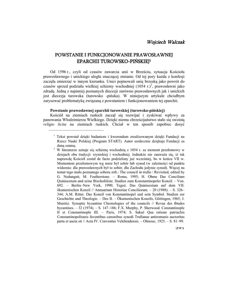 Wojciech Walczak POWSTANIE I FUNKCJONOWANIE FUNKCJONOWANIE PRAWOSŁAWNEJ EPARCHII TUROWSKOTUROWSKO-PIŃSKIEJ1 Od 1596 r., czyli od czasów zawarcia unii w Brześciu, sytuacja Kościoła prawosławnego i unickiego uległa znaczącej zmianie. Od tej pory każda z konfesji zaczęła zmierzać w innym kierunku. Unici pojmowali unię brzeską jako powrót do czasów sprzed podziału wielkiej schizmy wschodniej (1054 r.)2, prawosławni jako zdradę. Jedną z najmniej poznanych diecezji zarówno prawosławnych jak i unickich jest diecezja turowska (turowsko -pińska). W niniejszym artykule chciałbym zarysować problematykę związaną z powstaniem i funkcjonowaniem tej eparchii. Powstanie prawosławnej eparchii turowskiej (turowsko-pińskiej) Kościół na ziemiach ruskich zaczął się rozwijać i zyskiwać wpływy za panowania Włodzimierza Wielkiego. Dzięki niemu chrześcijaństwo stało się swoistą religio licita na ziemiach ruskich. Chciał w ten sposób zapobiec dosyć 1 2 Tekst powstał dzięki badaniom i kwerendom zrealizowanym dzięki Fundacji na Rzecz Nauki Polskiej (Program START). Autor serdecznie dziękuje Fundacji za daną szansę. W literaturze uznaje się schizmę wschodnią z 1054 r. za moment przełomowy w dziejach obu tradycji: rzymskiej i wschodniej. Jednakże nie zauważa się, iż tak naprawdę Kościół został de facto podzielony już wcześniej, bo w końcu VII w. Momentem przełomowym wg mnie był sobór lub synod (w zależności od punktu widzenia: dla prawosławnych był to sobór, dla Zachodu jedynie synod). Więcej na temat tego mało poznanego soboru zob.: The council in trullo / Revisited, edited by G. Nedungatt, M. Featherstone. – Roma, 1995; H. Ohme Das Concilium Quinisextum und seine Bischofsliste. Studien zum Konstantinopeler Konzil. – Von. 692. – Berlin–New York, 1990; Тegoż. Das Quinisextum auf dem VII. ökumenischen Konzil // Annuarium Historiae Conciliorum. – 20 (1988). – S. 326– 344; A.M. Ritter. Das Konzil von Konstantinopel und sein Symbol. Studien zur Geschichte und Theologie. – Des II. – Ökumenischen Konzils, Göttingen, 1965; J. Munitiz. Synoptic byzantine Chronologies of the councils // Revue des études byzantines. – 32 (1974). – S. 147–186; F.X. Murphy, P. Sherwood. Constantinople II et Constantinople III. – Paris, 1974; S. Sakač Qua ratione patriachis Constantinopolitanis faventibus canonibus synodi Trullanae antiromanis auctoritas parta et aucta sit // Acta IV. Conventus Velehradensis. – Olmouc, 1925. – S. 81–99. 291 Wojcsech Walczak niebezpiecznej dla struktur państwowych rozbudowie kultu pogańskiego. Religia chrześcijańska stwarzała pozory silnego oddziaływania, toteż Włodzimierz wolał unowocześniać swoje państwo i społeczeństwo przez ideową konsolidację jego warstwy panującej i pozyskane ideologicznych instrumentów oddziaływania na całe społeczeństwo1. Przyjęcie chrześcijaństwa i chrzest Rusi w 988 r. stanowiło ważny asumpt do powstania organizacji kościelnej. Za Włodzimierza daje się potwierdzić istnienie 9 eparchii: w Kojowie, Nowogrodzie, Czernihowie, Rostowie, Włodzimierzu Wołyńskim, Biełogrodzie, Tmutarakaniu, Połocku i Turowie. Diecezje w Perejesławiu i Juriewie powstały za rządów Jarosława Mądrego, następne zaś dopiero w XII i XIII w.2 Najstarsze dzieje eparchii turowsko-pińskiej łączą się z legendą, wedle której biskupstwo z siedzibą w Turowie miał powołać do życia Włodzimierz I. Legenda ta była utrwalana i przekazywana w nawet w epoce XVII i XVIII w. w różnego rodzajach dokumentach3. W wieku XIV został nawet sfałszowany przywilej fundacyjny, który miał świadczyć o powstaniu tej eparchii w 1005 r. Takiemu stanowisku sprzyjał zapis pod rokiem 988 w Powieści minionych lat, w którym to przekazie czytamy, że Turów przypadł Światopełkowi, tuż za Nowogrodem i Połockiem, a więc może to świadczyć o pewnej precedencji, która miała miejsce dopiero za panowania Światopełka II4. Stanowisko, jakoby eparchia turowska 1 2 3 4 292 A. Poppe. Państwo i Kościół na Rusi w XI w. – Warszawa, 1968. – S. 15–16. Próbę rekonstrukcji najstarszej sieci eparchialnej na Rusi podjął się m. in. E. Golubinskij. Istoria ruskoj cerkwi. – T. 1. – Cz. 1. – Moskwa, 1901. – S. 333– 344, 664–703, dla XI w. polska praca A. Poppe, Państwo i Kościół // Passim. Ciekawe jest, że w środowisku unickiej diecezji turowskiej XVII–XVIII wieku istniało przeświadczenie o Włodzimierzowych początkach tej eparchii. Władyctwo Turowskie y Pinskie jest fundowane od Włodzimierza Wielkiego jako jest dawna traditia o tym i niepodejrzana y trwało tak in sua firmate przez czas niemały. Puncta albo instrukcya y Informacya o władyctwie Turowskim y Pińskim: Archiv SanktPetersburskogo Instytuta Istorii Rosijskoj Akademii Nauk (dalej – APIH RAN). – Kol. 52 (Pawła Dobrochotowa). – Op. 1. – Nr. 19 (11.4.19). – K. 1. Tradycja taka zapisana jest również w innym dokumencie z 1776 r.: Instrukcja sprawy Turowskiej i Jego Mści Pana Wojewody wileńskiego. – APIH RAN. – Kol. 52 (Pawła Dobrochotowa). – Op. 1. – Nr. 35 (11.4.35). – K. 1. «Miał [Włodzimierz – przyp. W.W.] bowiem synów dwunastu (...) I posadził Wyszesława w Nowogrodzie, a Iziasława w Połocku, a Światopełka w Turowie, a Jarosława w Rostowie. Powieść minionych lat, przekład i opracowanie F. Sielicki. – Wrocława, 1999. – S. 95. Źródło to powstało prawdopodobnie pod koniec XI lub na początku XII w. i według niektórych badaczy jest uznawane za podstawowy tekst do badań nad wczesnym chrześcijańsktwem na Rusi (taki pogląd podziela m. in. D. Obolensky The Bzantine Commonwealth. Eastern Europe 500–1453. – London, 1971. – S. 193). Zob.: A. Szachmatow Razyskanija o drewnejših russkih lietopisych swodah // Lietopis Zanjatij imperatorskoj Archeograficzeskoj Komissii za 1907 r. – Wypis. 20; A. Poppe Państwo i Kościół. – S. 1