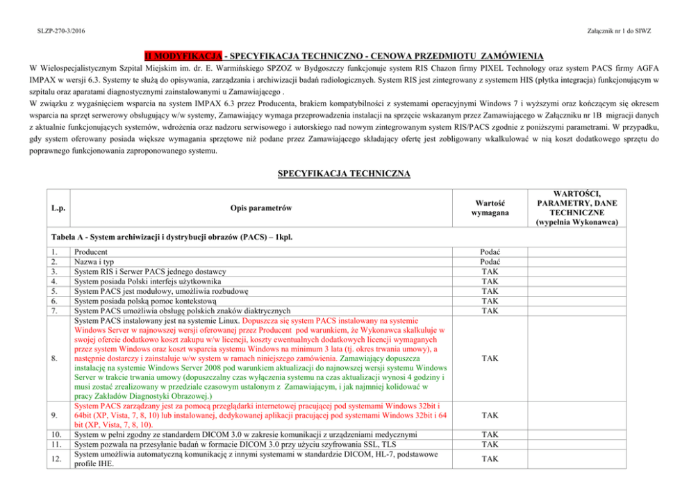 SLZP-270-3/2016 Załącznik nr 1 do SIWZ II MODYFIKACJA - SPECYFIKACJA TECHNICZNO - CENOWA PRZEDMIOTU ZAMÓWIENIA W Wielospecjalistycznym Szpital Miejskim im. dr. E. Warmińskiego SPZOZ w Bydgoszczy funkcjonuje system RIS Chazon firmy PIXEL Technology oraz system PACS firmy AGFA IMPAX w wersji 6.3. Systemy te służą do opisywania, zarządzania i archiwizacji badań radiologicznych. System RIS jest zintegrowany z systemem HIS (płytka integracja) funkcjonującym w szpitalu oraz aparatami diagnostycznymi zainstalowanymi u Zamawiającego . W związku z wygaśnięciem wsparcia na system IMPAX 6.3 przez Producenta, brakiem kompatybilności z systemami operacyjnymi Windows 7 i wyższymi oraz kończącym się okresem wsparcia na sprzęt serwerowy obsługujący w/w systemy, Zamawiający wymaga przeprowadzenia instalacji na sprzęcie wskazanym przez Zamawiającego w Załączniku nr 1B migracji danych z aktualnie funkcjonujących systemów, wdrożenia oraz nadzoru serwisowego i autorskiego nad nowym zintegrowanym system RIS/PACS zgodnie z poniższymi parametrami. W przypadku, gdy system oferowany posiada większe wymagania sprzętowe niż podane przez Zamawiającego składający ofertę jest zobligowany wkalkulować w nią koszt dodatkowego sprzętu do poprawnego funkcjonowania zaproponowanego systemu. SPECYFIKACJA TECHNICZNA L.p. Opis parametrów Wartość wymagana Tabela A - System archiwizacji i dystrybucji obrazów (PACS) – 1kpl. 1. 2. 3. 4. 5. 6. 7. 8. 9. 10. 11. 12. Producent Nazwa i typ System RIS i Serwer PACS jednego dostawcy System posiada Polski interfejs użytkownika System PACS jest modułowy, umożliwia rozbudowę System posiada polską pomoc kontekstową System PACS umożliwia obsługę polskich znaków diaktrycznych System PACS instalowany jest na systemie Linux. Dopuszcza się system PACS instalowany na systemie Windows Server w najnowszej wersji oferowanej przez Producent pod warunkiem, że Wykonawca skalkuluje w swojej ofercie dodatkowo koszt zakupu w/w licencji, koszty ewentualnych dodatkowych licencji wymaganych przez system Windows oraz koszt wsparcia systemu Windows na minimum 3 lata (tj. okres trwania umowy), a następnie dostarczy i zainstaluje w/w system w ramach niniejszego zamówienia. Zamawiający dopuszcza instalację na systemie Windows Server 2008 pod warunkiem aktualizacji do najnowszej wersji systemu Windows Server w trakcie trwania umowy (dopuszczalny czas wyłączenia systemu na czas aktualizacji wynosi 4 godziny i musi zostać zrealizowany w przedziale czasowym ustalonym z Zamawiającym, i jak najmniej kolidować w pracy Zakładów Diagnostyki Obrazowej.) System PACS zarządzany jest za pomocą przeglądarki internetowej pracującej pod systemami Windows 32bit i 64bit (XP, Vista, 7, 8, 10) lub instalowanej, dedykowanej aplikacji pracującej pod systemami Windows 32bit i 64 bit (XP, Vista, 7, 8, 10). System w pełni zgodny ze standardem DICOM 3.0 w zakresie komunikacji z urządzeniami medycznymi System pozwala na przesyłanie badań w formacie DICOM 3.0 przy użyciu szyfrowania SSL, TLS System umożliwia automatyczną komunikację z innymi systemami w standardzie DICOM, HL-7, podstawowe profile IHE. Podać Podać TAK TAK TAK TAK TAK TAK TAK TAK TAK TAK WARTOŚCI, PARAMETRY, DANE TECHNICZNE (wypełnia Wykonawca) 13. 14. 15. 16. 17. 18. 19. 20. 21. 22. 23. 24. 25. 26. 27. 28. 29. 30. 31. Obsługa protokołów DICOM C-Move, C-Find, C-Store SCU i SCP, DICOM Storage Commitment oraz DICOM MPPS jako SCP i SCU. System Dystrybucji Obrazu działa na systemach w wersji 32 oraz 64 bitowych oraz działa pod systemami Windows (XP, Vista, 7, 8, 10) oraz Linux System PACS potrafi wykorzystywać więcej niż 8 GB pamięci RAM Konfiguracja oferowanego systemu PACS w zakresie generowania listy roboczej (DICOM Worklist) dla przyłączanych urządzeń diagnostycznych na podstawie danych pochodzących z systemu RIS. Program pracuje w systemie jako użytkownik ograniczony, nie wymagane są uprawnienia administracyjne do funkcjonowania programu. System działający w architekturze klient-serwer, kompletne dane obrazowe badań przechowywane są na serwerze. Baza danych wszystkich przesłanych do stacji pacjentów oraz obsługa procesu starzenia się badań i przenoszenia najstarszych badań na nośniki off-line Przyjmowanie obrazów z urządzeń diagnostycznych na serwer PACS pełniący funkcję archiwum Udostępnianie i przesyłanie obrazów na stacje diagnostyczne i przeglądowe w formacie DICOM Możliwość podglądu pełnych danych o pacjencie i badaniu zawartych w pliku obrazu Walidacja zgodności przychodzących danych obrazowych z danymi z systemu RIS. W przypadku niepomyślnej walidacji integracja systemu PACS z systemem dystrybucji obrazów oraz stacjami diagnostycznymi ma wyświetlać przy otwieraniu obrazu informację o nieudanej walidacji badania. Program współpracuje z archiwum krótkoterminowym i długoterminowym (off-line) - zarządzanie automatycznym przenoszeniem badań pomiędzy archiwami: • najdawniej wykonanych najrzadziej przeglądanych • • najdawniej przeglądanych • uwzględnienie (przez zaznaczenie) np. przewlekłych chorób i konieczności powtarzania badań w dłuższym okresie czasu (pozostawienie w archiwum on-line) Program pozwala na konfigurację archiwizacji danych na zewnętrzne nośniki z możliwością ustawienia minimum: po określonej godzinie, w określone dni, zaraz po spłynięciu badania. Program pozwala na konfigurację usuwania z dysku danych znajdujących się na zewnętrznych nośnikach i w miarę potrzeby ich przywracanie z zewnętrznych nośników. Program pozwala na wykonywanie kopii bezpieczeństwa na napędzie LTO / CD / DVD /NAS Program pozwala na niezależne przechowywanie miniatur, nawet po przeniesieniu badań DICOM na napęd LTO / CD / DVD / NAS. Dopuszcza się zaoferowanie programu nieposiadającego tej funkcjonalności. W przypadku zapełnienia licencjonowanej przestrzeni dyskowej lub w przypadku zapełnienia posiadan