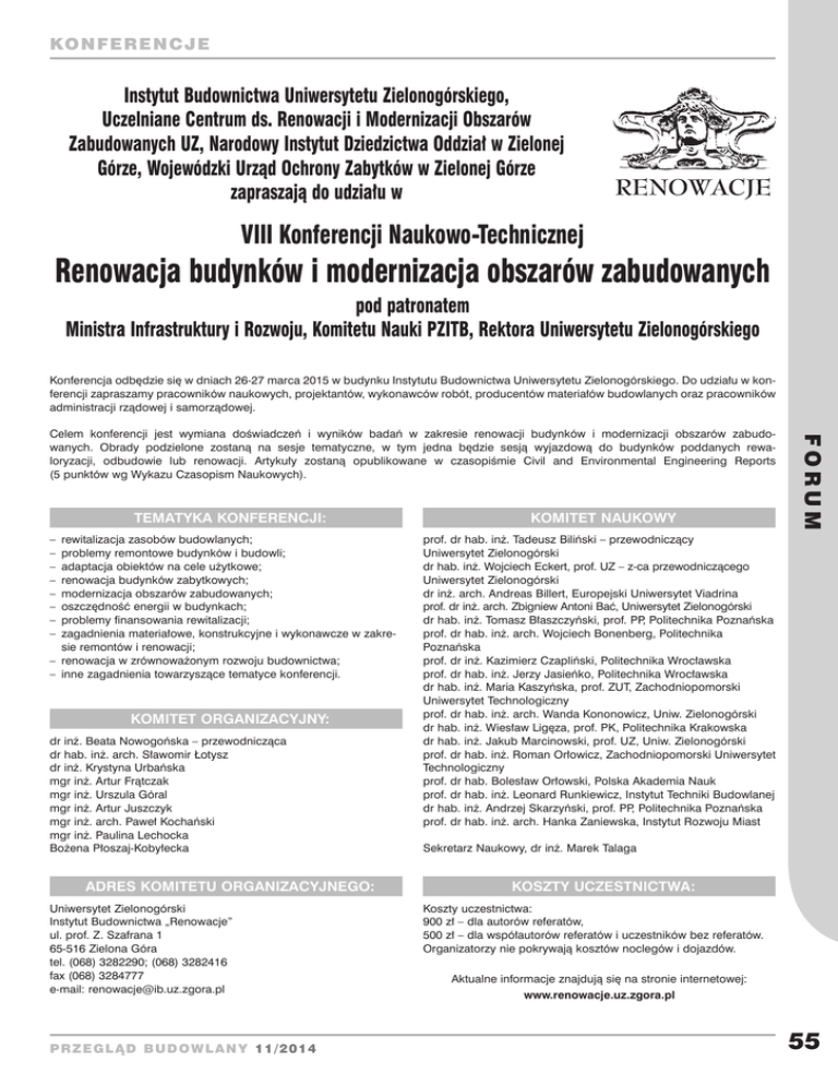 KO N FEREN C J E Instytut Budownictwa Uniwersytetu Zielonogórskiego, Uczelniane Centrum ds. Renowacji i Modernizacji Obszarów Zabudowanych UZ, Narodowy Instytut Dziedzictwa Oddział w Zielonej Górze, Wojewódzki Urząd Ochrony Zabytków w Zielonej Górze zapraszają do udziału w VIII Konferencji Naukowo-Technicznej Renowacja budynków i modernizacja obszarów zabudowanych pod patronatem Ministra Infrastruktury i Rozwoju, Komitetu Nauki PZITB, Rektora Uniwersytetu Zielonogórskiego Konferencja odbędzie się w dniach 26-27 marca 2015 w budynku Instytutu Budownictwa Uniwersytetu Zielonogórskiego. Do udziału w konferencji zapraszamy pracowników naukowych, projektantów, wykonawców robót, producentów materiałów budowlanych oraz pracowników administracji rządowej i samorządowej. TEMATYKA KONFERENCJI: – rewitalizacja zasobów budowlanych; – problemy remontowe budynków i budowli; – adaptacja obiektów na cele użytkowe; – renowacja budynków zabytkowych; – modernizacja obszarów zabudowanych; – oszczędność energii w budynkach; – problemy finansowania rewitalizacji; – zagadnienia materiałowe, konstrukcyjne i wykonawcze w zakresie remontów i renowacji; – renowacja w zrównoważonym rozwoju budownictwa; – inne zagadnienia towarzyszące tematyce konferencji. KOMITET ORGANIZACYJNY: dr inż. Beata Nowogońska – przewodnicząca dr hab. inż. arch. Sławomir Łotysz dr inż. Krystyna Urbańska mgr inż. Artur Frątczak mgr inż. Urszula Góral mgr inż. Artur Juszczyk mgr inż. arch. Paweł Kochański mgr inż. Paulina Lechocka Bożena Płoszaj-Kobyłecka ADRES KOMITETU ORGANIZACYJNEGO: Uniwersytet Zielonogórski Instytut Budownictwa „Renowacje” ul. prof. Z. Szafrana 1 65-516 Zielona Góra tel. (068) 3282290; (068) 3282416 fax (068) 3284777 e-mail: [email protected] PR zeglĄ d bu d ow l an y 11/2014 KOMITET NAUKOWY FORUM Celem konferencji jest wymiana doświadczeń i wyników badań w zakresie renowacji budynków i modernizacji obszarów zabudowanych. Obrady podzielone zostaną na sesje tematyczne, w tym jedna będzie sesją wyjazdową do budynków poddanych rewaloryzacji, odbudowie lub renowacji. Artykuły zostaną opublikowane w czasopiśmie Civil and Environmental Engineering Reports (5 punktów wg Wykazu Czasopism Naukowych). prof. dr hab. inż. Tadeusz Biliński – przewodniczący Uniwersytet Zielonogórski dr hab. inż. Wojciech Eckert, prof. UZ – z-ca przewodniczącego Uniwersytet Zielonogórski dr inż. arch. Andreas Billert, Europejski Uniwersytet Viadrina prof. dr inż. arch. Zbigniew Antoni Bać, Uniwersytet Zielonogórski dr hab. inż. Tomasz Błaszczyński, prof. PP, Politechnika Poznańska prof. dr hab. inż. arch. Wojciech Bonenberg, Politechnika Poznańska prof. dr inż. Kazimierz Czapliński, Politechnika Wrocławska prof. dr hab. inż. Jerzy Jasieńko, Politechnika Wrocławska dr hab. inż. Maria Kaszyńska, prof. ZUT, Zachodniopomorski Uniwersytet Technologiczny prof. dr hab. inż. arch. Wanda Kononowicz, Uniw. Zielonogórski dr hab. inż. Wiesław Ligęza, prof. PK, Politechnika Krakowska dr hab. inż. Jakub Marcinowski, prof. UZ, Uniw. Zielonogórski prof. dr hab. inż. Roman Orłowicz, Zachodniopomorski Uniwersytet Technologiczny prof. dr hab. Bolesław Orłowski, Polska Akademia Nauk prof. dr hab. inż. Leonard Runkiewicz, Instytut Techniki Budowlanej dr hab. inż. Andrzej Skarzyński, prof. PP, Politechnika Poznańska prof. dr hab. inż. arch. Hanka Zaniewska, Instytut Rozwoju Miast Sekretarz Naukowy, dr inż. Marek Talaga KOSZTY UCZESTNICTWA: Koszty uczestnictwa: 900 zł – dla autorów referatów, 500 zł – dla współautorów referatów i uczestników bez referatów. Organizatorzy nie pokrywają kosztów noclegów i dojazdów. Aktualne informacje znajdują się na stronie internetowej: www.renowacje.uz.zgora.pl 55