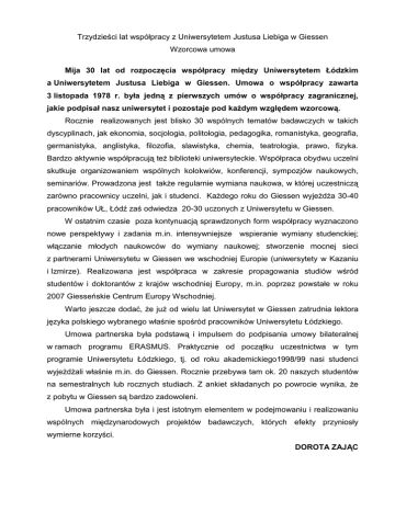 Trzydzieści lat współpracy z Uniwersytetem Justusa Liebiga w Giessen Wzorcowa umowa Mija 30 lat od rozpoczęcia współpracy między Uniwersytetem Łódzkim a Uniwersytetem Justusa Liebiga w Giessen. Umowa o współpracy zawarta 3 listopada 1978 r. była jedną z pierwszych umów o współpracy zagranicznej, jakie podpisał nasz uniwersytet i pozostaje pod kaŜdym względem wzorcową. Rocznie realizowanych jest blisko 30 wspólnych tematów badawczych w takich dyscyplinach, jak ekonomia, socjologia, politologia, pedagogika, romanistyka, geografia, germanistyka, anglistyka, filozofia, slawistyka, chemia, teatrologia, prawo, fizyka. Bardzo aktywnie współpracują teŜ biblioteki uniwersyteckie. Współpraca obydwu uczelni skutkuje organizowaniem wspólnych kolokwiów, konferencji, sympozjów naukowych, seminariów. Prowadzona jest takŜe regularnie wymiana naukowa, w której uczestniczą zarówno pracownicy uczelni, jak i studenci. KaŜdego roku do Giessen wyjeŜdŜa 30-40 pracowników UŁ, Łódź zaś odwiedza 20-30 uczonych z Uniwersytetu w Giessen. W ostatnim czasie poza kontynuacją sprawdzonych form współpracy wyznaczono nowe perspektywy i zadania m.in. intensywniejsze wspieranie wymiany studenckiej; włączanie młodych naukowców do wymiany naukowej; stworzenie mocnej sieci z partnerami Uniwersytetu w Giessen we wschodniej Europie (uniwersytety w Kazaniu i Izmirze). Realizowana jest współpraca w zakresie propagowania studiów wśród studentów i doktorantów z krajów wschodniej Europy, m.in. poprzez powstałe w roku 2007 Giesseńskie Centrum Europy Wschodniej. Warto jeszcze dodać, Ŝe juŜ od wielu lat Uniwersytet w Giessen zatrudnia lektora języka polskiego wybranego właśnie spośród pracowników Uniwersytetu Łódzkiego. Umowa partnerska była podstawą i impulsem do podpisania umowy bilateralnej w ramach programu ERASMUS. Praktycznie od początku uczestnictwa w tym programie Uniwersytetu Łódzkiego, tj. od roku akademickiego1998/99 nasi studenci wyjeŜdŜali właśnie m.in. do Giessen. Rocznie przebywa tam ok. 20 naszych studentów na semestralnych lub rocznych studiach. Z ankiet składanych po powrocie wynika, Ŝe z pobytu w Giessen są bardzo zadowoleni. Umowa partnerska była i jest istotnym elementem w podejmowaniu i realizowaniu wspólnych międzynarodowych projektów badawczych, których efekty przyniosły wymierne korzyści. DOROTA ZAJĄC
