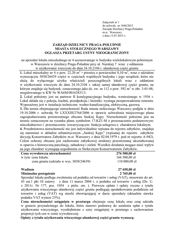 Załącznik nr 1 do uchwały nr 1048/2015 Zarządu Dzielnicy Praga-Południe m.st. Warszawy z dnia 13.07.2015 r. ZARZĄD DZIELNICY PRAGA-POŁUDNIE MIASTA STOŁECZNEGO WARSZAWY OGŁASZA PRZETARG USTNY NIEOGRANICZONY na sprzedaż lokalu mieszkalnego nr 4 usytuowanego w budynku wielolokalowym położonym w Warszawie w dzielnicy Praga-Południe przy ul. Nurskiej 7 wraz z oddaniem w użytkowanie wieczyste do dnia 24.10.2104 r. ułamkowej części gruntu 1. Lokal mieszkalny nr 4 o pow. 22,20 m2 + piwnica o powierzchni 8,10 m2, wraz z udziałem wynoszącym 3030/26439 części w częściach wspólnych budynku i jego urządzeń, które nie służą do wyłącznego użytku właścicieli poszczególnych lokali wraz z oddaniem w użytkowanie wieczyste do dnia 24.10.2104 r. takiej samej ułamkowej części gruntu, na którym znajduje się budynek, oznaczonego jako dz. ew. nr 112 o pow. 592 m2 w obr. 3-01-08, uregulowanego w KW Nr WA6M/00163831/3. 2. Lokal położony jest na parterze II kondygnacyjnego budynku, wzniesionego w 1936 r. Lokal składa się z pokoju, kuchni, przedpokoju i łazienki; wymaga przeprowadzenia remontu. Wyposażony jest w instalacje techniczne: wodno-kanalizacyjną, elektryczną, gazową. 3. Dla terenu obejmującego nieruchomość Rada miasta stołecznego Warszawy podjęła w dniu 19.10.2006 r. uchwałę Nr LXXXIII/2764/2006 w sprawie uchwalenia miejscowego planu zagospodarowania przestrzennego obszaru Saskiej Kępy. Nieruchomość położona jest na terenie oznaczonym na rysunku planu symbolem 17-KZ1-M o przeznaczeniu podstawowym: mieszkalnictwo i przeznaczeniu towarzyszącym: funkcja usługowa o charakterze lokalnym. 4. Przedmiotowa nieruchomość nie jest indywidualnie wpisana do rejestru zabytków, znajduje się natomiast w układzie urbanistycznym „Saskiej Kępy” (wpisanej do rejestru zabytków decyzją Konserwatora Zabytków m.st. Warszawy z dnia 02.04.1979 r. pod nr rejestru A-942). Celem ochrony obszaru jest zachowanie zabytkowej struktury przestrzennej ukształtowanej w oparciu o historyczną parcelację, zabudowę i zieleń. Wszelkie działania mogące mieć wpływ na jego charakter wymagają uzgodnienia ze Stołecznym Konserwatorem Zabytków. Cena wywoławcza nieruchomości 276 500,00 zł w tym: cena lokalu: 166 500,00 zł cena gruntu (udziału w wys. 3030/24639) 110 000,00 zł Wadium 27 650,00 zł Minimalne postąpienie 2 765,00 zł Sprzedaż lokalu podlega zwolnieniu od podatku od towarów i usług (VAT), stosownie do art. 43 ust.1 pkt 10 ustawy z dnia 11 marca 2004 r. o podatku od towarów i usług (Dz. U. z 2011r. Nr 177, poz. 1054 z późn. zm. ). Pierwsza opłata i opłaty roczne z tytułu użytkowania wieczystego ułamkowej części gruntu podlegają opodatkowaniu podatkiem od towarów i usług (VAT) wg stawki obowiązującej w dacie sprzedaży (aktualnie stawka podatku VAT wynosi 23%). Cena nieruchomości osiągnięta w przetargu obejmuje cenę lokalu oraz cenę udziału w gruncie przynależnego do lokalu, która stanowi podstawę do ustalenia opłat z tytułu użytkowania wieczystego, wyodrębnione z ceny osiągniętej w przetargu z zachowaniem proporcji tych cen w cenie wywoławczej. Opłaty z tytułu użytkowania wieczystego ułamkowej części gruntu wynoszą: - pierwsza opłata - 25% ceny ułamkowej części gruntu osiągniętej w przetargu, podlegająca opodatkowaniu podatkiem od towarów i usług (VAT) wg obowiązującej stawki (aktualnie stawka podatku VAT wynosi 23%), - opłaty roczne – 1% ceny ułamkowej części gruntu osiągniętej w przetargu podlegające opodatkowaniu podatkiem od towarów i usług (VAT) wg obowiązującej stawki (aktualnie stawka podatku VAT wynosi 23%). Opłaty roczne należy wnosić do dnia 31 marca każdego roku. Opłaty te podlegają aktualizacji raz na trzy lata, jeżeli wartość gruntu ulegnie zmianie. Opłaty z tytułu użytkowania wieczystego gruntu ustalane są zgodnie z przepisami ustawy z dnia 21 sierpnia 1997 r. o gospodarce nieruchomościami (Dz. U. z 2015 r. poz. 782 ze zm). W zakresie obowiązku zapłaty opłat rocznych z tytułu użytkowania wieczystego ułamkowej części gruntu w terminie do dnia 31 marca każdego roku, nabywca nieruchomości zobowiązany będzie poddać się wprost z aktu notarialnego egzekucji w trybie art. 777 § 1 pkt 4 i 5 kodeksu postępowania cywilnego. Termin do złożenia wniosku przez osoby, którym przysługiwało pierwszeństwo w nabyciu nieruchomości na podstawie art. 34 ust. 1 pkt 1 i 2 ustawy o gospodarce nieruchomościami upłynął w dniu 15 czerwca 2015 r. Nieruchomość nie jest obciążona żadnymi prawami i nie jest przedmiotem zobowiązań wobec osób trzecich. W przetargu mogą brać udział osoby fizyczne, prawne i jednostki organizacyjne z przyznaną zdolnością prawną, które zapoznają się z informatorem przetargowym, wniosą wadium i złożą zgłoszenie udziału w przetargu (zgłoszenie stanowi załącznik do informatora przetargowego). Wadium w pieniądzu, winno być wniesione na rachunek bankowy dzielnicy Praga-Południe m. st. Warszawy w Banku Citi Handlowy w Warszawie nr 51 1030 1508 0000 0005 5000 7096, do dnia 27 sierpnia 2015 r. Za datę wpłaty w razie wątpliwości poczytuje się datę zaksięgowania wyżej wymienionych należności na rachunek bankowy dzielnicy Praga-Południe miasta stołecznego Warszawy. Zgłoszenie udziału w przetargu wraz z wymaganymi załącznikami winno być złożone do dnia 27 sierpnia 2015 r. do godz. 15.00 bezpośrednio w Wydziale Gospodarki Nieruchomościami i Nadzoru Właścicielskiego dla Dzielnicy Praga-Południe przy ul. Grochowskiej 274, pok. nr 229 II piętro lub 321, III piętro. Przystępujący do przetargu zobowiązani są do zapoznania się z informatorem przetargowym w Wydziale Gospodarki Nieruchomościami i Nadzoru Właścicielskiego dla Dzielnicy Praga-Południe przy ul. Grochowskiej 274, pok. nr 321, III piętro lub w Wydziale Obsługi Mieszkańców dla Dzielnicy Praga-Południe przy ul. Grochowskiej 27