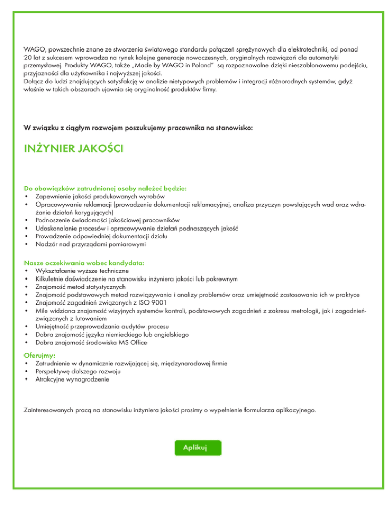 WAGO, powszechnie znane ze stworzenia światowego standardu połączeń sprężynowych dla elektrotechniki, od ponad 20 lat z sukcesem wprowadza na rynek kolejne generacje nowoczesnych, oryginalnych rozwiązań dla automatyki przemysłowej. Produkty WAGO, także „Made by WAGO in Poland” są rozpoznawalne dzięki nieszablonowemu podejściu, przyjazności dla użytkownika i najwyższej jakości. Dołącz do ludzi znajdujących satysfakcję w analizie nietypowych problemów i integracji różnorodnych systemów, gdyż właśnie w takich obszarach ujawnia się oryginalność produktów firmy. W związku z ciągłym rozwojem poszukujemy pracownika na stanowisko: INŻYNIER JAKOŚCI Do obowiązków zatrudnionej osoby należeć będzie: • Zapewnienie jakości produkowanych wyrobów • Opracowywanie reklamacji (prowadzenie dokumentacji reklamacyjnej, analiza przyczyn powstających wad oraz wdrażanie działań korygujących) • Podnoszenie świadomości jakościowej pracowników • Udoskonalanie procesów i opracowywanie działań podnoszących jakość • Prowadzenie odpowiedniej dokumentacji działu • Nadzór nad przyrządami pomiarowymi Nasze oczekiwania wobec kandydata: • Wykształcenie wyższe techniczne • Kilkuletnie doświadczenie na stanowisku inżyniera jakości lub pokrewnym • Znajomość metod statystycznych • Znajomość podstawowych metod rozwiązywania i analizy problemów oraz umiejętność zastosowania ich w praktyce • Znajomość zagadnień związanych z ISO 9001 • Mile widziana znajomość wizyjnych systemów kontroli, podstawowych zagadnień z zakresu metrologii, jak i zagadnieńzwiązanych z lutowaniem • Umiejętność przeprowadzania audytów procesu • Dobra znajomość języka niemieckiego lub angielskiego • Dobra znajomość środowiska MS Office Oferujmy: • Zatrudnienie w dynamicznie rozwijającej się, międzynarodowej firmie • Perspektywę dalszego rozwoju • Atrakcyjne wynagrodzenie Zainteresowanych pracą na stanowisku inżyniera jakości prosimy o wypełnienie formularza aplikacyjnego.
