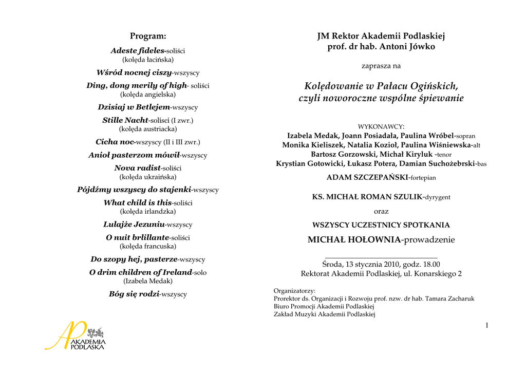 Program: Adeste fideles-soliści (kolęda łacińska) Wśród nocnej ciszy-wszyscy Ding, dong merily of high- soliści (kolęda angielska) JM Rektor Akademii Podlaskiej prof. dr hab. Antoni Jówko zaprasza na Kolędowanie w Pałacu Ogińskich, czyli noworoczne wspólne śpiewanie Dzisiaj w Betlejem-wszyscy Stille Nacht-solisci (I zwr.) (kolęda austriacka) Cicha noc-wszyscy (II i III zwr.) Anioł pasterzom mówił-wszyscy Nova radist-soliści (kolęda ukraińska) Pójdźmy wszyscy do stajenki-wszyscy What child is this-soliści WYKONAWCY: Izabela Medak, Joann Posiadała, Paulina Wróbel-sopran Monika Kieliszek, Natalia Kozioł, Paulina Wiśniewska-alt Bartosz Gorzowski, Michał Kiryluk -tenor Krystian Gotowicki, Łukasz Potera, Damian Suchożebrski-bas ADAM SZCZEPAŃSKI-fortepian KS. MICHAŁ ROMAN SZULIK-dyrygent (kolęda irlandzka) oraz Lulajże Jezuniu-wszyscy WSZYSCY UCZESTNICY SPOTKANIA O nuit brlillante-soliści MICHAŁ HOŁOWNIA-prowadzenie (kolęda francuska) Do szopy hej, pasterze-wszyscy O drim children of Ireland-solo (Izabela Medak) Bóg się rodzi-wszyscy ______________________________ Środa, 13 stycznia 2010, godz. 18.00 Rektorat Akademii Podlaskiej, ul. Konarskiego 2 Organizatorzy: Prorektor ds. Organizacji i Rozwoju prof. nzw. dr hab. Tamara Zacharuk Biuro Promocji Akademii Podlaskiej Zakład Muzyki Akademii Podlaskiej 1 Wśród nocnej ciszy głos się rozchodzi: Dzisiaj w Betlejem, dzisiaj w Betlejem wesoła nowina, Wstańcie pasterze, Bóg się wam rodzi; Czym prędzej się wybierajcie, do Betlejem pospieszajcie przywitać Pana. że Panna czysta, że Panna czysta porodziła Syna. Chrystus się rodzi, nas oswobodzi, Anieli grają, króle witają, pasterze śpiewają, bydlęta klękają, cuda, cuda ogłaszają. 2.Poszli znaleźli Dzieciątko w żłobie Z wszystkimi znaki danymi sobie, Jako Bogu cześć Mu dali, A witając zawołali z wielkiej radości: 3.Ach, witaj Zbawco, z dawna żądany, Cztery tysiące lat wyglądany! Na Ciebie króle, prorocy Czekali, a Tyś tej nocy nam się objawił. 4.I my czekamy na Ciecie Pana, A skoro przyjdziesz na głos kapłana Padniemy na twarz przed Tobą Wierząc żeś jest pod osłoną chleba i wina. 2.Maryja Panna, Maryja Panna Dzieciątko piastuje, i Józef święty, i Józef święty Ono pielęgnuje. Chrystus się rodzi... 3.Choć w stajeneczce, choć w stajeneczce Panna syna rodzi Przecież On wkrótce, przecież On wkrótce ludzi oswobodzi Chrystus się rodzi... 4.I Trzej Królowie, i Trzej Królowie od wschodu przybyli I dary Panu, i dary Panu kosztowne złożyli Chrystus się rodzi... 5.Pójdźmy też i my, pójdźmy też i my przywitać Jezusa Króla na królmi, Króla nad królmi uwielbić Chrystusa Chrystus się rodzi... 6.Bądźże pochwalon, bądźże pochwalon dziś, nasz wieczny Panie Któryś złożony, któryś złożony na zielonym sianie Chrystus się rodzi... 7.Bądź pozdrowiony, bądź pozdrowiony Boże nieskończony Wsławimy Ciebie, wsławimy Ciebie, Boże niezmierzony Chrystus się rodzi... 2 Cicha noc, święta noc! Pastuszkowie od swych trzód biegną wielce zadziwieni za anielskich głosem pieni, gdzie się spełnił cud. Cicha noc, święta noc! Narodzony Boży Syn, Pan wielkiego majestatu niesie dziś całemu światu odkupienie win. Anioł pasterzom mówił: Chrystus się wam narodził w Betlejem, nie bardzo podłym mieście. Narodził się w ubóstwie Pan waszego stworzenia. 2.Chcąc się dowiedzieć tego poselstwa wesołego, bieżeli do Betlejem skwapliwie. Znaleźli dziecię w żłobie, Maryję z Józefem. i owoc rodząca. 6.Słuchajcież Boga Ojca, jako wam Go zaleca: Ten ci jest Syn najmilszy, jedyny, w raju wam obiecany, Tego wy słuchajcie Bogu bądź cześć i chwała, która byś nie ustała, jako Ojcu, tak i Jego Synowi i Świętemu Duchowi, w Trójcy jedynemu 3.Taki Pan chwały wielkiej, uniżył się Wysoki, pałacu kosztownego żadnego nie miał zbudowanego Pan waszego stworzenia. 4.O dziwne narodzenie, nigdy niewysławione! Poczęła Panna Syna w czystości, porodziła w całości Panieństwa swojego. 5.Już się ono spełniło, co pod figurą było: Arona różdżka ona zielona stała się nam kwitnąca 3 Pójdźmy wszyscy do stajenki, do Jezusa i Panienki, Lulajże Jezuniu, moja perełko, Powitajmy Maleńkiego i Maryję Matkę Jego. Lulaj, ulubione me pieścidełko. Lulajże Jezuniu, lulajże, lulaj, A Ty Go, Matulu, w płaczu utulaj. 2.Witaj, Jezu ukochany, od Patriarchów czekany Od Proroków ogłoszony, od narodów upragniony. 3.Witaj, Dzieciąteczko w żłobie. Wyznajemy Boga w Tobie. Coś się narodził tej nocy. Byś nas wyrwał z czarta mocy. 4.Witaj Jezu nam zjawiony, Witaj dwakroć narodzony, Raz z ojca przed wieków wiekiem, A teraz z matki człowiekiem 2.Zamknijże znużone płaczem powieczki, Utulże zemdlone łkaniem usteczki. Lulajże Jezuniu... 3.Lulajże piękniuchny mój aniołeczku, Lulajże wdzięczniuchny świata kwiateczku. Lulajże Jezuniu… 5.Któż to słyszał takie dziwy? Tyś człowiek i Bóg prawdziwy, Ty łączysz w boskiej osobie Dwie natury różne sobie 6.O Jezu nasze kochanie, Czemu nad niebios mieszkanie Przekładasz nędzę, ubóstwo, I wyniszczasz swoje Bóstwo? 7.O szczęśliwi pastuszkowie, któż radość Waszą wypowie Czego ojcowie żądali, Wyście pierwsi oglądali. 4 Do szopy, hej pasterze, Bóg się rodzi, moc truchleje, do szopy, bo tam cud: Syn Boży w żłobie leży, by zbawić ludzki ród. Śpiewajcie Aniołowie, Pasterze grajcież Mu, Kłaniajcie się królowie, nie budźcie go ze snu Pan niebiosów obnażony; ogień krzepnie, blask ciemnieje, ma granice Nieskończony. Wzgardzony, okryty chwałą; śmiertelny, Król nad wiekami! A Słowo Ciałem się stało i mieszkało między nami. 2. Padnijmy na kolana, to Dziecię to nasz Bóg, Uczcijmy niebios Pana, miłości złóżmy dług! Śpiewajcie Aniołowie...... 3. O Boże niepojęty, któż pojmie miłość Twą? Na sianie wśród bydlęty masz tron i służbę swą. Śpiewajcie Aniołowie 2.Có