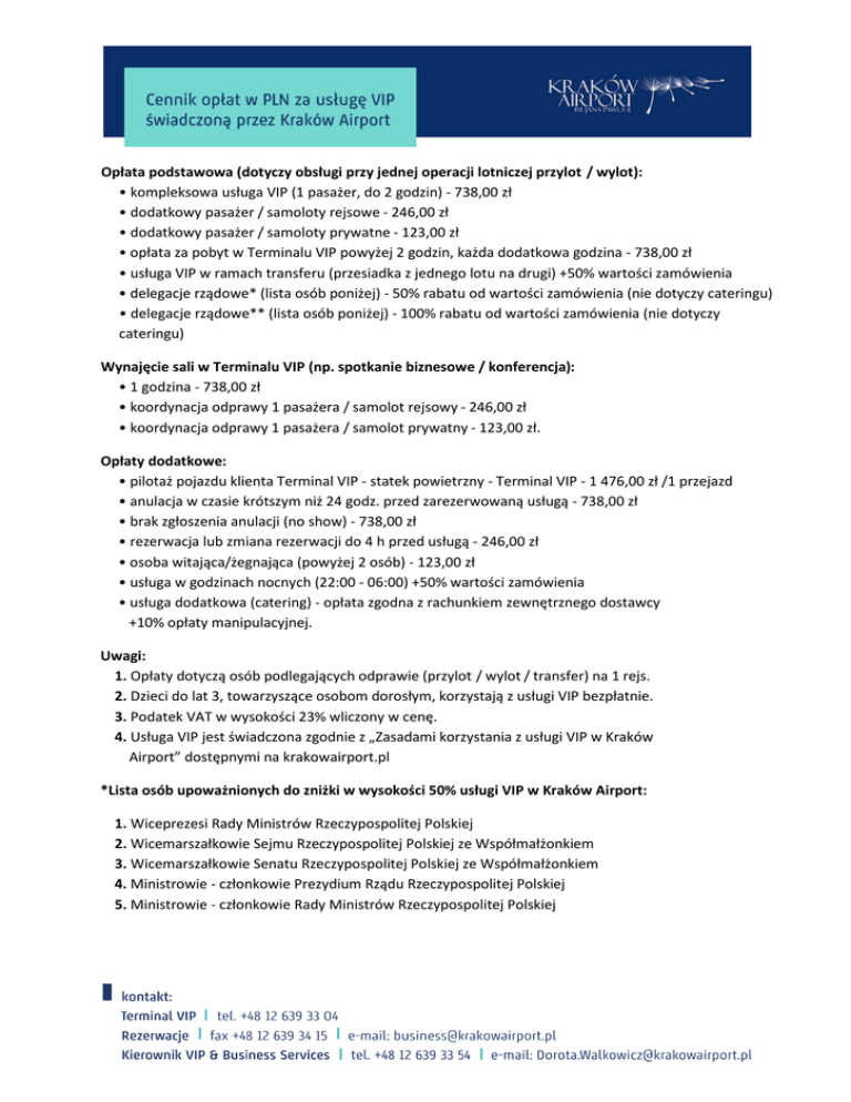 Opłata podstawowa (dotyczy obsługi przy jednej operacji lotniczej przylot / wylot): • kompleksowa usługa VIP (1 pasażer, do 2 godzin) - 738,00 zł • dodatkowy pasażer / samoloty rejsowe - 246,00 zł • dodatkowy pasażer / samoloty prywatne - 123,00 zł • opłata za pobyt w Terminalu VIP powyżej 2 godzin, każda dodatkowa godzina - 738,00 zł • usługa VIP w ramach transferu (przesiadka z jednego lotu na drugi) +50% wartości zamówienia • delegacje rządowe* (lista osób poniżej) - 50% rabatu od wartości zamówienia (nie dotyczy cateringu) • delegacje rządowe** (lista osób poniżej) - 100% rabatu od wartości zamówienia (nie dotyczy cateringu) Wynajęcie sali w Terminalu VIP (np. spotkanie biznesowe / konferencja): • 1 godzina - 738,00 zł • koordynacja odprawy 1 pasażera / samolot rejsowy - 246,00 zł • koordynacja odprawy 1 pasażera / samolot prywatny - 123,00 zł. Opłaty dodatkowe: • pilotaż pojazdu klienta Terminal VIP - statek powietrzny - Terminal VIP - 1 476,00 zł /1 przejazd • anulacja w czasie krótszym niż 24 godz. przed zarezerwowaną usługą - 738,00 zł • brak zgłoszenia anulacji (no show) - 738,00 zł • rezerwacja lub zmiana rezerwacji do 4 h przed usługą - 246,00 zł • osoba witająca/żegnająca (powyżej 2 osób) - 123,00 zł • usługa w godzinach nocnych (22:00 - 06:00) +50% wartości zamówienia • usługa dodatkowa (catering) - opłata zgodna z rachunkiem zewnętrznego dostawcy +10% opłaty manipulacyjnej. Uwagi: 1. Opłaty dotyczą osób podlegających odprawie (przylot / wylot / transfer) na 1 rejs. 2. Dzieci do lat 3, towarzyszące osobom dorosłym, korzystają z usługi VIP bezpłatnie. 3. Podatek VAT w wysokości 23% wliczony w cenę. 4. Usługa VIP jest świadczona zgodnie z „Zasadami korzystania z usługi VIP w Kraków Airport” dostępnymi na krakowairport.pl *Lista osób upoważnionych do zniżki w wysokości 50% usługi VIP w Kraków Airport: 1. Wiceprezesi Rady Ministrów Rzeczypospolitej Polskiej 2. Wicemarszałkowie Sejmu Rzeczypospolitej Polskiej ze Współmałżonkiem 3. Wicemarszałkowie Senatu Rzeczypospolitej Polskiej ze Współmałżonkiem 4. Ministrowie - członkowie Prezydium Rządu Rzeczypospolitej Polskiej 5. Ministrowie - członkowie Rady Ministrów Rzeczypospolitej Polskiej **Lista osób upoważnionych do zniżki w wysokości 100% usługi VIP w Kraków Airport: 1. Prezydent Rzeczypospolitej Polskiej ze Współmałżonkiem 2. Marszałek Sejmu Rzeczypospolitej Polskiej ze Współmałżonkiem 3. Marszałek Senatu Rzeczypospolitej Polskiej ze Współmałżonkiem 4. Prezes Rady Ministrów Rzeczypospolitej Polskiej ze Współmałżonkiem 5. Byli Prezydenci Rzeczypospolitej Polskiej ze Współmałżonkiem.