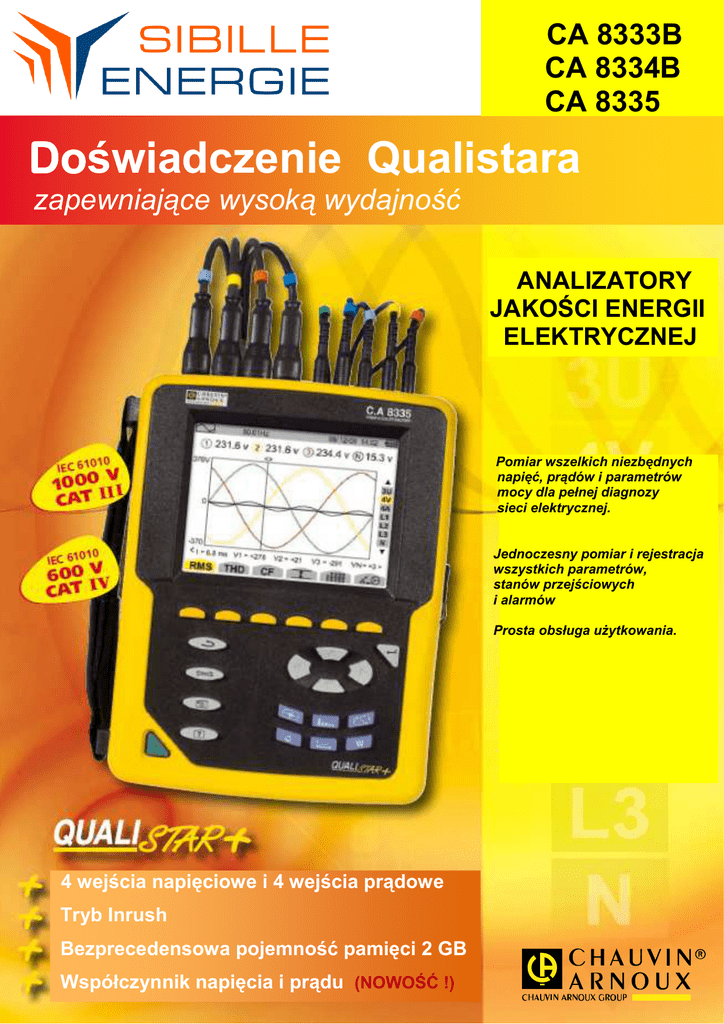 CA 8333B CA 8334B CA 8335 Doświadczenie Qualistara Do zapewniające wysoką wydajność ANALIZATORY JAKOŚCI ENERGII ELEKTRYCZNEJ Pomiar wszelkich niezbędnych napięć, prądów i parametrów mocy dla pełnej diagnozy sieci elektrycznej. Jednoczesny pomiar i rejestracja wszystkich parametrów, stanów przejściowych i alarmów Prosta obsługa użytkowania. 4 wejścia napięciowe i 4 wejścia prądowe Tryb Inrush Bezprecedensowa pojemność pamięci 2 GB Współczynnik napięcia i prądu (NOWOŚĆ !) Analizatory jakości energii elektrycznej CA 8332B – CA 8334B – CA 8335 Analizatory przeznaczone są dla techników i zespołów utrzymania ruchu pracujących w przemyśle oraz osób dokonujących kontroli w budynkach użyteczności publicznej. Qualistar’y umożliwiają przeprowadzenie badań i diagnostyki sieci 1, 2 i 3 fazowych. Ergonomiczna konstrukcja oraz przejrzysty interfejs użytkownika czynią obsługę łatwą i intuicyjną. Dzięki wielozadaniowemu systemowi „multi-task” możliwa jest jednoczesna obsługa wszystkich funkcji pomiarowych różnych wielkości, detekcji oraz ciągłej rejestracji. Wyświetlanie mierzonych przebiegów w czasie rzeczywistym Wejścia napięć/prądów oznaczone kolorowymi pierścieniami Podłączenie USB do PC Szeroki kolorowy ekran o łatwym odczycie ¼ VGA Składana podstawka zapewniająca stabilną pozycję pracy Bezpośredni dostęp do głównych funkcji Bezpośredni dostęp do głównych pomiarów (np.harm.) FUNKCJE FUNKCJE Flicker Harmoniczne i potrójne harmoniczne Moc czynna i cos φ Moc bierna AlarmyZdarzenia Wyświetlanie przebiegów w czasie rzeczywistym (4 napięcia i 4 prądy) Pomiary napięć i prądów RMS pół-okresowe Intuicyjna obsługa Automatyczne rozpoznawanie typu podłączonych cęgów Uwzględnianie wszystkich składowych stałych Pomiar, obliczanie i wyświetlanie harmonicznych do 50-ej, z uwzględnieniem przesunięcia fazowego Obliczanie współczynnika odkształceń harmonicznych (THD) Wychwytywanie stanów przejściowych dla I próbki (1/256 na okres) Wykres wektorowy Pomiar mocy czynnej, biernej i pozornej w I i 3 fazach Pomiar energii czynnej, biernej i pozornej w I i 3 fazach Obliczanie współczynnika K Obliczanie przesunięcia fazowego cos φ (DPF) i PF Wychwytywanie do 210 stanów przejściowych Obliczanie Pst Obliczanie asymetrii (prądów i napięć) Monitoring sieci elektrycznej w oparciu o alarmy Zrzuty ekranu (obraz i data) Przesyłanie danych do PC Oprogramowanie do zgrywania danych i komunikacji w trybie rzeczywistym Analizatory jakości energii elektrycznej CA 8332B – CA 8334B – CA 8335 USTAWIENIA USTAWIENIA Użytkownicy bezpośrednio wprowadzają w analizatorze podstawowe parametry (takie jak: data, czas, kontrast wyświetlania, itp.). Następnie wybierają rodzaj sieci, do której będzie podłączony Qualistar. Cęgi prądowe wykrywane są automatycznie. Weryfikacja jest możliwa na odpowiednim ekranie. ! USTAWIENIE NOWOŚĆ w CA 8335 Menu dostępne W 21 językach POŁĄCZENIA PODŁĄCZONE CĘGI CZUJNIKI i WSKAŹNIKI NOWOŚĆ w CA 8335 STANY PRZEJŚCIOWE REJESTRACJA ALARMY OBSERWACJA CHARAKTERYSTYK SIECI W CZASIE RZECZYWISTYM OBSERWACJA OBSERWACJE DIAGNOZA WYKRES NOWE FUNKCJE CA 8335 Podgląd 4 sygnałów równocześnie ! Tryb harmoniczne Tryb Moc/Energia Wspł.THD (całkowity oraz w jednej fazie) dla U, I, V, VA wartości mogą Tryb ten wyświetla wszystkie wartości dotyczące mocy i energii. być wyrażone w %. Modele CA 8334 i CA 8335 posiadają funkcję dla harmonicznych w VA i „tryb eksperta”. Tryb ten pozwala na analizę wpływu harmonicznych na grzanie przewodu neutralnego lub maszyn wirujących Do aktywacji i anulowania sumowania energii można użyć przycisków „start” i „stop” Pomiary : W, Var, VA Wh,. Warh, VAh Pf, PDF lub cosφ i tg φ THD POMIAR MOCY TABELE MOC / ENERGIA W OKREŚLONYM PRZEDZIALE CZASU WYKRES WEKTOROWY THD W JEDNEJ FAZIE Uwagi praktyczne Pomoc Jeżeli są jakiekolwiek wątpliwości, klucz Help dokładnie wyjaśnia funkcje dostępne dla wyświetlacza. Wykonywanie zrzutów ekranu przez naciśnięcie jednego klawisza. Pomoc dostępna w każdym momencie podczas używania analizatora. Zrzut ekranu Naciśnięcie tego klucza spowoduje, że przyrząd wykona zrzut ekranu. Obraz zostanie zapisany automatycznie z aktualną datą i czasem. Kasowanie W celu uniknięcia przeładowania pamięci, użytkownik może wybrać rodzaj pliku do skasowania i trzymać tylko te pliki, które są potrzebne. Analizatory jakości mocy i energii CA 8332B – CA 8334B – CA 8335 MONITOROWANIE Charakterystyki wszystkich monitorowanych wielkości są wyświetlane jednocześnie ! Tryb alarmów Alarmy są zdefiniowane w momencie ustawienia przyrządu. Użytkownicy określają bezpośrednio wszystkie progi, które mają być monitorowane w czasie pomiarów. Każde przekroczenie progu alarmu powoduje zapisanie daty i czasu wydarzenia, czasu jego trwania, oraz jego minimalne i maksymalne wartości. Tryb rejestracji (Min/Max tylko CA 8335) W trybie rejestracji, możliwy jest zapis wszystkich żądanych parametrów wraz z ich odwzorowaniem graficznym. Dodatkowo, pasek postępu w górnej części okna pokazuje całkowity czas rejestracji. Okres rejestracji i wskaźnik przechowywania są programowalne. Stany przejściowe Tryb ten może być użyty do wychwytywania zdarzeń napięć i prądów, wyzwolonych zgodnie z ustawionym progiem. Wyświetlane są 4 okresy zdarzenia w ilości 256 próbek/okres. Możliwe jest przybliżanie i oddalanie zarejestrowanych zdarzeń. PRĄD ROZRUCHU OPROGRAMOWANIE OPROGRAMOWANIE NOWA FUNKCJA CA 8335 Prąd rozruchowy (Inrush) jest maksymalnym prądem na wejściu pobieranym przez urządzenie po włączeniu do zasilania Pomiary wykonywane przez Qualistar’a mogą być przetwarzane w 2 dostępnych oprogramowaniach : służy do podstawowego przetwarzania oraz DataView do szczegółowej analizy danych. Pomiar ten pomaga prawidłowo określić instalację elektryczną.