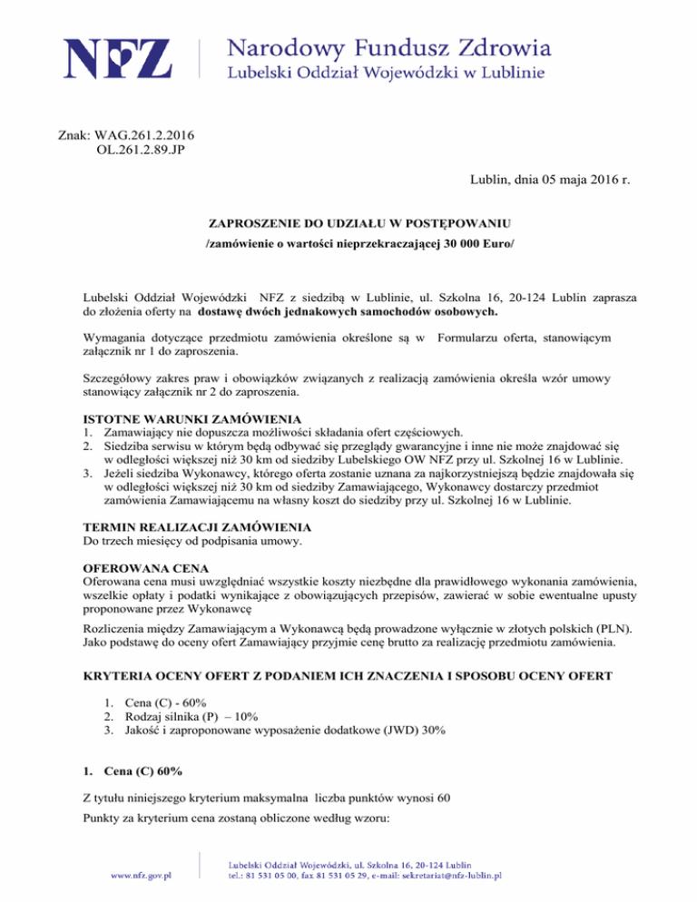 Znak: WAG.261.2.2016 OL.261.2.89.JP Lublin, dnia 05 maja 2016 r. ZAPROSZENIE DO UDZIAŁU W POSTĘPOWANIU /zamówienie o wartości nieprzekraczającej 30 000 Euro/ Lubelski Oddział Wojewódzki NFZ z siedzibą w Lublinie, ul. Szkolna 16, 20-124 Lublin zaprasza do złożenia oferty na dostawę dwóch jednakowych samochodów osobowych. Wymagania dotyczące przedmiotu zamówienia określone są w Formularzu oferta, stanowiącym załącznik nr 1 do zaproszenia. Szczegółowy zakres praw i obowiązków związanych z realizacją zamówienia określa wzór umowy stanowiący załącznik nr 2 do zaproszenia. ISTOTNE WARUNKI ZAMÓWIENIA 1. Zamawiający nie dopuszcza możliwości składania ofert częściowych. 2. Siedziba serwisu w którym będą odbywać się przeglądy gwarancyjne i inne nie może znajdować się w odległości większej niż 30 km od siedziby Lubelskiego OW NFZ przy ul. Szkolnej 16 w Lublinie. 3. Jeżeli siedziba Wykonawcy, którego oferta zostanie uznana za najkorzystniejszą będzie znajdowała się w odległości większej niż 30 km od siedziby Zamawiającego, Wykonawcy dostarczy przedmiot zamówienia Zamawiającemu na własny koszt do siedziby przy ul. Szkolnej 16 w Lublinie. TERMIN REALIZACJI ZAMÓWIENIA Do trzech miesięcy od podpisania umowy. OFEROWANA CENA Oferowana cena musi uwzględniać wszystkie koszty niezbędne dla prawidłowego wykonania zamówienia, wszelkie opłaty i podatki wynikające z obowiązujących przepisów, zawierać w sobie ewentualne upusty proponowane przez Wykonawcę Rozliczenia między Zamawiającym a Wykonawcą będą prowadzone wyłącznie w złotych polskich (PLN). Jako podstawę do oceny ofert Zamawiający przyjmie cenę brutto za realizację przedmiotu zamówienia. KRYTERIA OCENY OFERT Z PODANIEM ICH ZNACZENIA I SPOSOBU OCENY OFERT 1. Cena (C) - 60% 2. Rodzaj silnika (P) – 10% 3. Jakość i zaproponowane wyposażenie dodatkowe (JWD) 30% 1. Cena (C) 60% Z tytułu niniejszego kryterium maksymalna liczba punktów wynosi 60 Punkty za kryterium cena zostaną obliczone według wzoru: najniższa oferowana cena brutto C = ---------------------------------------------- x 60 cena brutto badanej oferty 2. Rodzaj silnika (P) – 10 % Z tytułu niniejszego kryterium maksymalna liczba punktów wynosi 10 Punkty za kryterium rodzaj silnika zostaną obliczone według wzoru: liczba punktów przyznanych ofercie rozpatrywanej P = ……………………………………………………………… x 10 najwyższa uzyskana liczba punktów Punkty w kryterium rodzaj silnika zostaną przyznane w następujący sposób: benzynowy – 3 pkt diesel - 5 pkt 3. Jakość i zaproponowane wyposażenie dodatkowe (JWD) – 30% Z tytułu niniejszego kryterium maksymalna liczba punktów wynosi 30 Punkty za kryterium jakość, zaproponowane wyposażenia dodatkowe zostaną obliczone według wzoru: ilość punktów przyznana ofercie rozpatrywanej JWD = ……………………………………………………………………… x 30 maksymalna przyznana ofertom ilość punktów Punkty w kryterium jakość i zaproponowane wyposażenie dodatkowe zostaną przyznane w następujący sposób: Lp. 1. Jakość, Wyposażenie dodatkowe Pojemność silnika cm3 2. Zużycie paliwa Liczba punktów 1400 – 1500 – 1 Powyżej 1500 – 5 3. 3 punkt za każdy litr pełny poniżej określonego dla cyklu mieszanego, nie więcej niż 9 punktów Tylny rząd siedzeń - trzy oddzielne, niezależne Identyczny wymiar trzech foteli – 6 Różnica w wymiarze foteli do 15% - 2 fotele Różnica w wymiarze foteli powyżej 15% -0 4. Rabaty na części i serwis pogwarancyjny Min. 15 % - 10 Min. 10% - 5 Poniżej 10% - 0 Za najkorzystniejszą zostanie uznana oferta, która uzyska najwyższą sumę punktów za wszystkie kryteria. TERMIN SKŁADANIA OFERT Skan formularza oferty, podpisanego przez upoważnioną osobę, zgodnego z załącznikiem nr 1 i 1.1 należy przesłać w formie elektronicznej na adres e-mail: [email protected] w terminie do dnia: 13.05.2016 r. do godz. 14:00 OSOBA UPRAWNIONA DO POROZUMIEWANIA SIĘ Z WYKONAWCAMI Do porozumiewania się z Wykonawcami upoważnionym pracownikiem Zamawiającego jest: Michał Piwoni, tel. 81 53 105 32, e-mail: [email protected] TERMIN ZWIĄZANIA OFERTĄ: 1. Bieg terminu związania ofertą rozpoczyna się z upływem terminu składania ofert. 2. Termin, do którego Wykonawcy będą związani złożoną ofertą ustala się na 30 dni licząc od dnia upływu ostatecznego terminu składania ofert. UDZIELENIE ZAMÓWIENIA Niniejsze zaproszenie do złożenia oferty nie stanowi zobowiązania Zamawiającego do udzielenia zamówienia. Zamawiający dokona wyboru oferty najkorzystniejszej na warunkach określonych w zaproszeniu. Informacja o wyborze oferty najkorzystniejszej zostanie przesłana Wykonawcom uczestniczącym w postępowaniu e-mailem na adres wskazany w ofercie. Jeżeli wartość wybranej oferty przekroczy kwotę, jaką zamawiający może przeznaczyć na realizację zamówienia zamawiający wystąpi do oferentów o złożenie ofert dodatkowych. Zaproszenie do złożenia oferty nie podlega przepisom ustawy Prawo zamówień publicznych. W załączeniu: - załącznik nr 1 - Formularz oferty - załącznik nr 2 - Wzór umowy Załącznik nr 1 FORMULARZ OFERTY Dane oferenta: Nazwa ................................................................................................................................... Siedziba .................................................................................................................................... nr telefonu .................................................................., nr faxu ............................................... e-mail ....................................................................................., REGON …………………….. I.Składając ofertę w postepowaniu prowadzonym w trybie zapytania ofertowego na zakup 2 sztuk jednakowych fabrycznie nowych (wcześniej nierejestrowanych) samo