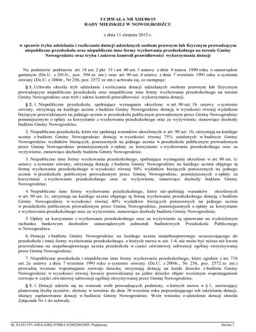 UCHWAŁA NR XIII/80/15 RADY MIEJSKIEJ W NOWOGRODŹCU z dnia 11 sierpnia 2015 r. w sprawie trybu udzielania i rozliczania dotacji udzielanych osobom prawnym lub fizycznym prowadzącym niepubliczne przedszkola oraz niepubliczne inne formy wychowania przedszkolnego na terenie Gminy Nowogrodziec oraz trybu i zakresu kontroli prawidłowości wykorzystania dotacji Na podstawie podstawie art. 18 ust. 2 pkt 15 i art. 40 ust. 1 ustawy z dnia 8 marca 1990 roku o samorządzie gminnym (Dz.U. z 2013r., poz. 594 ze zm.) oraz art. 90 ust. 4 ustawy z dnia 7 września 1991 roku o systemie oświaty (Dz.U. z 2004r., Nr 256, poz. 2572 ze zm.) uchwala się, co następuje: § 1. Uchwała określa tryb udzielania i rozliczania dotacji udzielanych osobom prawnym lub fizycznym prowadzącym niepubliczne przedszkola oraz niepubliczne inne formy wychowania przedszkolnego na terenie Gminy Nowogrodziec oraz tryb i zakres kontroli prawidłowości wykorzystania dotacji. § 2. 1. Niepubliczne przedszkola, spełniające wymagania określone w art. 90 ust. 1b ustawy o systemie oświaty, otrzymują na każdego ucznia z budżetu Gminy Nowogrodziec dotację w wysokości równej wydatkom bieżącym przewidzianym na jednego ucznia w przedszkolu publicznym prowadzonym przez Gminę Nowogrodziec pomniejszonym o opłaty za korzystanie z wychowania przedszkolnego oraz za wyżywienie, stanowiące dochody budżetu Gminy Nowogrodziec. 2. Niepubliczne przedszkola, które nie spełniają warunków określonych w art. 90 ust. 1b, otrzymują na każdego ucznia z budżetu Gminy Nowogrodziec dotację w wysokości równej 75% ustalonych w budżecie Gminy Nowogrodziec wydatków bieżących, ponoszonych na jednego ucznia w przedszkolu publicznym prowadzonym przez Gminę Nowogrodziec pomniejszonych o opłaty za korzystanie z wychowania przedszkolnego oraz za wyżywienie, stanowiące dochody budżetu Gminy Nowogrodziec. 3. Niepubliczne inne formy wychowania przedszkolnego, spełniające wymagania określone w art. 90 ust. 1c ustawy o systemie oświaty, otrzymują dotację z budżetu Gminy Nowogrodziec na każdego ucznia objętego tą formą wychowania przedszkolnego w wysokości równej 50% wydatków bieżących ponoszonych na jednego ucznia w przedszkolu publicznym prowadzonym przez Gminę Nowogrodziec, pomniejszonych o opłaty za korzystanie z wychowania przedszkolnego oraz za wyżywienie, stanowiące dochody budżetu Gminy Nowogrodziec. 4. Niepubliczne inne formy wychowania przedszkolnego, które nie spełniają warunków określonych w art. 90 ust. 1c, otrzymują na każdego ucznia objętego tą formą wychowania przedszkolnego dotację z budżetu Gminy Nowogrodziec w wysokości równej 40% wydatków bieżących ponoszonych na jednego ucznia w przedszkolu publicznym prowadzonym przez Gminę Nowogrodziec, pomniejszonych o opłaty za korzystanie z wychowania przedszkolnego oraz za wyżywienie, stanowiące dochody budżetu Gminy Nowogrodziec. 5. Opłaty za korzystanie z wychowania przedszkolnego oraz za wyżywienie są ujmowane na wydzielonym rachunku bankowym dochodów samorządowych jednostek budżetowych Przedszkola Publicznego w Nowogrodźcu. 6. Dotacja z budżetu Gminy Nowogrodziec na każdego ucznia niepełnosprawnego uczęszczającego do przedszkola i innej formy wychowania przedszkolnego, o których mowa w ust. 1-4, nie może być niższa niż kwota przewidziana na niepełnosprawnego ucznia przedszkola w części oświatowej subwencji ogólnej otrzymywanej przez Gminę Nowogrodziec. 7. Niepubliczne przedszkola i niepubliczne inne formy wychowania przedszkolnego, które zgodnie z art. 71b ust. 2a ustawy z dnia 7 września 1991 roku o systemie oświaty (Dz.U. z 2004r., Nr 256, poz. 2572 ze zm.) prowadzą wczesne wspomaganie rozwoju dziecka, otrzymują dotację na każde dziecko z budżetu Gminy Nowogrodziec w wysokości równej kwocie przewidzianej na jedno dziecko objęte wczesnym wspomaganiem rozwoju w części oświatowej subwencji ogólnej otrzymywanej przez Gminę Nowogrodziec. § 3. 1. Dotacji udziela się na wniosek osób prowadzących podmioty, o których mowa w § 1, zawierający planowaną liczbę uczniów, złożony w terminie do dnia 30 września roku poprzedzającego rok udzielania dotacji, służący zaplanowaniu dotacji w budżecie Gminy Nowogrodziec. Wzór wniosku o udzielenie dotacji określa Załącznik Nr 1 do uchwały. Id: 8A381197-A9E4-43B2-97BB-C41D02D62969. Podpisany Strona 1 2. Osoby, o których mowa w ust. 1, zgłaszają wszelkie zmiany danych zawartych we wniosku w terminie 14 dni od dnia ich wystąpienia. § 4. 1. Dotacja przekazywana jest od następnego roku budżetowego w transzach miesięcznych. 2. Osoba prowadząca dotowany podmiot składa do dziesiątego dnia miesiąca informację o liczbie uczniów ustalonej według stanu na pierwszy dzień miesiąca. Wzór informacji stanowi Załącznik Nr 2 do niniejszej uchwały. 3. Miesięczna kwota dotacji obliczana jest na podstawie informacji, o której mowa w ust. 2 i wypłacana do ostatniego dnia miesiąca na rachunek bankowy wskazany we wniosku, o którym mowa w § 3 ust. 1, z uwzględnieniem korekt, o których mowa w ust. 4. Transza dotacji za miesiąc grudzień, przekazywana jest nie później, niż do dnia 15 grudnia. 4. Osoba prowadząca dotowany podmiot zobowiązana jest do złożenia korekty informacji, o której mowa w ust. 2, zwiększającej lub zmniejszającej liczbę uczniów niezwłocznie po stwierdzeniu faktu błędnego podania liczby uczniów będącej podstawą do naliczenia dotacji. § 5. 1. W przypadku zmiany wysokości planowanych przez Gminę Nowogrodziec wydatków bieżących przewidzianych na utrzymanie ucznia w przedszkolu publicznym ulegają również zmianie kwoty dotacji należnej podmiotom, którym dotację ustala się według tych wydatków – poczynając od miesiąca następującego po miesiącu, w którym dokonano zmiany tych wydatków. 2. Do wyliczenia dotacji przyjmuje się liczbę uczniów uczęszczających do przedszkola publiczne