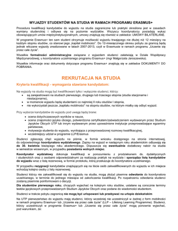 WYJAZDY STUDENTÓW NA STUDIA W RAMACH PROGRAMU ERASMUS+ Procedura kwalifikacji kandydatów do wyjazdu na studia zagraniczne lub praktyki określona jest w zasadach wymiany studenckiej i odbywa się na poziomie wydziałów. Wszyscy koordynatorzy posiadają wykaz obowiązujących umów międzyinstytucjonalnych, umowy znajdują się również w zakładce: UMOWY BILATERLANE. W programie Erasmus+ ten sam student otrzymuje możliwość wyjazdu trwającego nie dłużej niż 12 miesięcy na każdym stopniu studiów, co stanowi jego „kapitał mobilności”. Do 12-miesięcznego okresu pobytu za granicą będą jednak wliczane wyjazdy zrealizowane w latach 2007-2013, czyli w Erasmusie w ramach programu „Uczenie się przez całe życie”. Wszelkie formalności administracyjne związane z wyjazdem studenci załatwiają w Dziale Współpracy Międzynarodowej, u koordynatora uczelnianego programu Erasmus+ (mgr Małgorzata Jaroszewska). Wszelkie informacje oraz dokumenty dotyczące programu Erasmus+ znajdują się w zakładce DOKUMENTY DO POBRANIA. REKRUTACJA NA STUDIA Kryteria kwalifikacji - wymagania stawiane kandydatom: Na wyjazdy na studia mogą być kwalifikowani tylko i wyłącznie studenci, którzy: są zarejestrowani na studiach pierwszego, drugiego lub trzeciego stopnia (studia stacjonarne i niestacjonarne), w momencie wyjazdu będą studentami co najmniej II roku studiów I stopnia, nie wykorzystali jeszcze „kapitału mobilności” na stopniu studiów, na którym miałby się odbyć wyjazd. Przy wyborze kandydatów do wyjazdu pod uwagę będą brane: ocena dotychczasowych wyników w nauce, ocena znajomości języka obcego, potwierdzona certyfikatem/zaświadczeniem wydawanym przez Studium Języków Obcych UTP lub innym wydawanym przez upoważnione instytucje przeprowadzające egzaminy państwowe, motywacja studenta do wyjazdu, wynikająca z przeprowadzonej rozmowy kwalifikacyjnej, wcześniejszy udział w programie LLP/Erasmus Studenci zgłaszają chęć wyjazdu na piśmie, w formie wniosku dostępnego na stronie internetowej, do odpowiedniego koordynatora wydziałowego. Zapisy na wyjazd w następnym roku akademickim odbywają się do 30. kwietnia bieżącego roku akademickiego. Dopuszcza się ewentualnie dodatkowy nabór na studia w semestrze wiosennym, w przypadku posiadania wolnych miejsc. Koordynator wydziałowy dokonuje kwalifikacji w porozumieniu z prodziekanem ds. dydaktycznych i studenckich oraz z osobami odpowiedzialnymi za realizację praktyk na wydziale i sporządza listę kandydatów do wyjazdu wraz z listą rezerwową, w formie protokołu, którą przekazuje do koordynatora uczelnianego. W przypadku rezygnacji kandydatów znajdujących się na liście osób zakwalifikowanych do wyjazdu w ich miejsce wchodzą kolejno osoby z listy rezerwowej. Studenci którzy nie zakwalifikowali się do wyjazdu na studia, mogą złożyć pisemne odwołanie do koordynatora uczelnianego, w terminie do jednego miesiąca od zakończenia kwalifikacji. Po rozpatrzeniu odwołania studenci zostaną pisemnie poinformowani o decyzji. Dla studentów pierwszego roku, chcących wyjechać na kolejnym roku studiów, ustalane są corocznie terminy testów językowych przeprowadzanych Studium Języków Obcych oraz podane do wiadomości studentom. Studenci w trakcie pobytu zagranicą nie mogą być urlopowani lub przebywać na urlopie dziekańskim Na UTP pierwszeństwo do wyjazdu mają studenci, którzy wcześniej nie uczestniczyli w żadnej z form mobilności w ramach programu Erasmus+ lub „Uczenie się przez całe życie” (LLP – Lifelong Learning Programme). Studenci, którzy uczestniczyli w programie Erasmus+ lub „Uczenie się przez całe życie” mogą ponownie wyjechać, pod warunkiem, że: - nie będzie chętnych na wyjazd osób, które wcześniej nie wyjeżdżały w ramach programu Erasmus, - nie wykorzystali wcześniej całego „kapitału mobilności” jaki przypada na dany cykl studiów (uwzględnia się również wyjazdy bez grantu). Pobyt studenta w instytucji przyjmującej musi być rozpoczęty i zakończony w okresie pomiędzy 1. czerwca bieżącego roku a 30. września roku następnego danego roku akademickiego. Minimalny okres pobytu zagranicą nie może być krótszy niż 3 miesiące na studiach nie dłuższy niż 12 miesięcy (włączając okres praktyki będącej integralną częścią studiów) w jednym cyklu studiów. Minimalny okres pobytu w uczelni partnerskiej odnosi się tylko do okresu studiowania i nie zawiera czasu ewentualnego przygotowania językowego. Łączny pobyt studenta w kraju docelowym nie może przekroczyć 12 miesięcy (z uwzględnieniem ewentualnego przygotowania językowego oraz sesji egzaminacyjnych) w jednym cyklu studiów. Wyjazd stypendialny w programie Erasmus+ wymaga podjęcia w uczelni przyjmującej studiów stacjonarnych (full time). Dofinansowanie wyjazdu na studia Studenci wyjeżdżający na studia otrzymują stypendium, które ma charakter uzupełniający – jest przeznaczone na pokrycie dodatkowych kosztów związanych z wyjazdem i pobytem w instytucji przyjmującej (koszty podróży, ubezpieczenia, przygotowania językowego, zwiększone koszty utrzymania zagranicą). Pozostałe koszty studenci winni pokryć ze środków własnych, wykorzystując na ten cel również stypendia krajowe. Zasady rozdziału stypendium (wysokość i formy płatności) ustalane są na każdy rok akademicki w zależności od przyznanych środków z Komisji Europejskiej oraz zaleceń Narodowej Agencji Programu Erasmus+. Stawki miesięcznych stypendiów na wyjazdy na studia w roku 2015/2016: Kraje należące do danej grupy Kwota (€/miesiąc) Grupa 1 – Austria, Dania, Finlandia, Francja, Irlandia, Lichtenstein, Norwegia, Szwecja, Wielka Brytania, Włochy 500 Grupa 2 – Belgia, Chorwacja, Cypr, Czechy, Grecja, Hiszpania, Holandia, Islandia, Luksemburg, Niemcy, Portugalia, Słowenia, Turcja 400 Grupa 3 – Bułgaria, Estonia, Litwa, Łotwa, FYROM, Malta, Rumunia, Słow