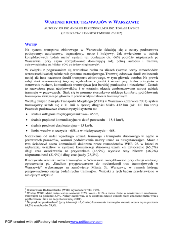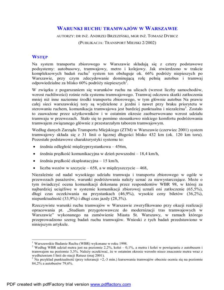 WARUNKI RUCHU TRAMWAJÓW W WARSZAWIE AUTORZY: DR INŻ. ANDRZEJ BRZEZIŃSKI, MGR INŻ. TOMASZ DYBICZ (PUBLIKACJA: TRANSPORT MIEJSKI 2/2002) WSTĘP Na system transportu zbiorowego w Warszawie składają się z cztery podstawowe podsystemy: autobusowy, tramwajowy, metro i kolejowy. Jak stwierdzono w trakcie kompleksowych badań ruchu1 system ten obsługuje ok. 66% podróży niepieszych po Warszawie, przy czym zdecydowanie dominującą rolę pełnią autobus i tramwaj odpowiedzialne za blisko 60% podróży niepieszych2. W związku z pogarszaniem się warunków ruchu na ulicach (wzrost liczby samochodów, wzrost ruchliwości) rośnie rola systemu tramwajowego. Tramwaj odczuwa skutki zatłoczenia mniej niż inne naziemne środki transportu zbiorowego, w tym głównie autobus Na prawie całej sieci warszawskiej tory są wydzielone z jezdni i nawet przy braku priorytetu w sterowaniu ruchem, komunikacja tramwajowa jest bardziej punktualna i niezależna3. Zostało to zauważone przez użytkowników i w ostatnim okresie zaobserwowano wzrost udziału tramwaju w przewozach. Stało się to pomimo stosunkowo niskiego komfortu podróżowania tramwajem związanego głównie z przestarzałym taborem tramwajowym. Według danych Zarządu Transportu Miejskiego (ZTM) w Warszawie (czerwiec 2001) system tramwajowy składa się z 31 linii o łącznej długości blisko 432 km (ok. 120 km toru). Pozostałe podstawowe charakterystyki systemu to: • średnia odległość międzyprzystankowa – 456m, • średnia prędkość komunikacyjna w dzień powszedni – 18,4 km/h, • średnia prędkość eksploatacyjna – 15 km/h, • liczba wozów w szczycie – 658, a w międzyszczycie – 468, Niezależnie od nadal wysokiego udziału tramwaju i transportu zbiorowego w ogóle w przewozach pasażerów, warunki podróżowania należy uznać za niewystarczające. Może o tym świadczyć ocena komunikacji dokonana przez respondentów WBR 98, w której za najbardziej uciążliwe w systemie komunikacji zbiorowej uznali oni zatłoczenie (65,5%), długi czas oczekiwania na przystankach (46,9%), wysokie ceny biletów (36,2%), niepunktualność (33,9%) i długi czas jazdy (28,3%). Rzeczywiste warunki ruchu tramwajów w Warszawie zweryfikowano przy okazji realizacji opracowania pt. „Studium przygotowawcze do modernizacji tras tramwajowych w Warszawie” wykonanego na zamówienie Miasta St. Warszawy, w ramach którego przeprowadzono szereg badań ruchu tramwajów. Wnioski z tych badań przedstawiono w niniejszym artykule. 1 Warszawskie Badanie Ruchu (WBR) wykonane w roku 1998. Według WBR udział metra jest na poziomie 2,2%, kolei – 0,1%, a metra i kolei w powiązaniu z autobusem i tramwajem na poziomie 3,3%. Należy oczekiwać, że w ostatnim okresie wzrosło nieco znaczenie metra wraz z wydłużeniem I linii do stacji Ratusz (maj 2001). 3 Na przykład punktualność (przy tolerancji +2,-3 min.) kursowania tramwajów obecnie ocenia się na poziomie 84,2% a autobusów 79,6%. 2 PDF created with pdfFactory trial version www.pdffactory.com ZAKRES BADAŃ RUCHU TRAMWAJÓW Badania ruchu tramwajów przeprowadzono w okresie 6-18 września 2001 i objęto nimi 5 tras tramwajowych: - Rondo Starzyńskiego-Most Gdański-Okopowa-Towarowa-Pl. Zawiszy, - Potocka-Jana Pawła II-Rakowiecka, - Piaski-Broniewskiego, - Gocławek-Rondo Wiatraczna-Most Poniatowskiego-Al. Jerozolimskie-Banacha i - Cm. Wolski-Al. Solidarności-Most Śląsko-Dąbrowski-Dworzec Wileński. Badania prowadzono w dni powszednie, w godzinach ruchu szczytowego – porannego (w okresie 7.30-9.00) i popołudniowego (w okresie 15.30-17.30). Notowano m.in. następujące parametry ruchu tramwaju: - czas zatrzymania tramwaju na przystanku, - czas zakończenia wymiany pasażerów, - czas ruszenia tramwaju z przystanku, - czas wjazdu i zjazdu tramwaju ze skrzyżowania, - czas tracony przez tramwaj w innych punktach kolizyjnych (przejścia dla pieszych, przejazdy). Dla każdej z tras wykonano 4 przejazdy pomiarowe w obu kierunkach. Łącznie dla wszystkich tras wykonano 80 jazd pomiarowych (rano i popołudniu, tam i z powrotem). PRĘDKOŚCI KOMUNIKACYJNE Wyniki przeprowadzonych badań ruchu wykazały dość duże zróżnicowanie średnich prędkości komunikacyjnych uzyskiwanych przez tramwaje na poszczególnych trasach. Najwyższe prędkości zarejestrowano na trasie Pętla Banacha-Pętla Gocławek (max. 18,6 km/h), a najniższe na trasie Pl. Zawiszy-Rondo Starzyńskiego (max. 13,8 km/h). Jednak uwzględniając wszystkie jazdy pomiarowych wykonanych w trakcie badań (80 jazd o łącznej długości prawie 600 km) uzyskano zbliżone wartości średnich prędkości komunikacyjnych w szczycie porannym (ok. 16,6 km/h) i popołudniowym (ok. 16,9 km/h). Niższe prędkości uzyskane w szczycie porannym wynikały na ogół z dłuższego czasu wymiany pasażerów na przystankach i niższych prędkości jazdy uzyskiwanych na odcinkach międzyprzystankowych. Z kolei mała różnica wynikała z faktu iż w szczycie popołudniowym tramwaj odnotowywał większe straty czasu w punktach kolizyjnych (na skrzyżowaniach). Prędkości uzyskane podczas badań były jednak znacząco niższe od komunikacyjnych podawanych przez ZTM w Warszawie (18,4 km/h). Szczegółowe zestawienie prędkości tramwaju poszczególnych trasach przedstawiono w tab. 1 PDF created with pdfFactory trial version www.pdffactory.com w Warszawie prędkości uzyskiwanych na Tabela 1. Zestawienie średnich prędkości komunikacyjnych tramwaju na trasach L.p. Nazwa odcinka pomiarowego Długość odc. Prędkość komunikacyjna w pomiarowego szczycie (uzyskana z badań) porannym popołudniowym [km] [km/h] [km/h] 1 Pętla Gocławek-Pętla Banacha 11,6 17,1 17,8 2 Pętla Banacha-Pętla Gocławek 11,7 17,3 18,6 3 Rondo Starzyńskiego-Pl. Zawiszy 5,8 14,6 15,4 4 Pl. Zawiszy – Rondo Starzyńskiego 5,8 16,2 13,8 5 Pętla Potocka-Pętla Rakowiecka 7,9 16,4 16,8 6 Pętla Rakowiecka-Pętla Potocka 7,9 16,1 15,4 7 Pętla Piaski-Pl. Grunwaldzki 2,