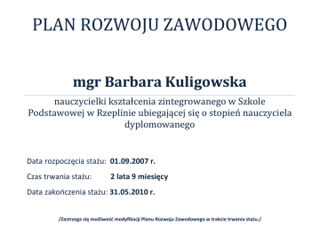 PLAN ROZWOJU ZAWODOWEGO mgr Barbara Kuligowska nauczycielki kształcenia zintegrowanego w Szkole Podstawowej w Rzeplinie ubiegającej się o stopień nauczyciela dyplomowanego Data rozpoczęcia stażu: 01.09.2007 r. Czas trwania stażu: 2 lata 9 miesięcy Data zakończenia stażu: 31.05.2010 r. /Zastrzega się możliwość modyfikacji Planu Rozwoju Zawodowego w trakcie trwania stażu./ &8 ust.2pkt1 „uzyskanie pozytywnych efektów pracy dydaktycznej, wychowawczej lub opiekuńczej na skutek wdroŜenia działań, mających na celu doskonalenie pracy własnej i podniesienie jakości pracy szkoły” FORMY REALIZACJI TERMIN REALIZACJI SPOSÓB ZADANIA DO REALIZACJI DOKUMENTOWANIA VIII 2007r. *Analiza dokumentów 1. Poznanie procedury prawnych, śledzenie strony awansu zawodowego i internetowej MENiS. przygotowanie planu Plan rozwoju zatwierdzony do Ostateczny termin *Sporządzenie planu rozwojowego. realizacji przez dyrektora 14.09.2007r. rozwoju zawodowego. 2. Aktywne uczestnictwo w pracach związanych z podnoszeniem efektywności procesu kształcenia szkoły. 3. Poszerzenie wiedzy i umiejętności poprzez uczestnictwo w róŜnych formach doskonalenia. *Analiza dokumentów szkoły Okres staŜu *Uczestnictwo w pracach nad opracowaniem Planu Rozwoju Szkoły dla kl. IIII. Okres staŜu Protokół ze spotkań *Opracowanie ankiet dla rodziców, uczniów i pracowników szkoły, oraz ich analiza i podsumowanie. Okres staŜu Opracowanie ankiet i wniosków *Udział w konferencjach i Okres staŜu warsztatach metodycznych, kursach, szkoleniach. *Studiowanie literatury Okres staŜu Potwierdzenie uczestnictwa fachowej i czasopism dla nauczycieli. 4. Pielęgnowanie uzdolnień i zamiłowań dzieci, pobudzanie do twórczej ekspresji. 5. ZałoŜenie i redagowanie gazetki uczniowskiej „Nowinki rzeplińskie”. *Udział w szkoleniach w ramach WDN. Okres staŜu *Udział w otwartych lekcjach innych nauczycieli. Okres staŜu Potwierdzenie uczestnictwa Prowadzenie społecznie szkolnego kółka plastycznego dla klas I-III „Mali artyści”. Okres staŜu Potwierdzenie dyrektora 2007/2008r. Zaświadczenie o ukończeniu szkolenia, wzór gazetki, potwierdzenie dyrektora • . Udział w szkoleniu „Praca nad redagowaniem gazetki”. • Powołanie zespołu redakcyjnego • Wydawanie gazetki. 6. Zorganizowanie Przygotowanie zaproszeń, cyklicznego festynu sporządzenie scenariusza sportowo- rodzinnego pod imprezy. hasłem „Mamo, tato baw się ze mną”. 2007r./wrzesień/ Okres staŜu Okres staŜu /czerwiec/ Potwierdzenie dyrektora, publikacja w prasie 7. Organizacja cyklicznych konkursów, olimpiad dla klas I-III z terenu gminy Dolic. 8. Współpraca przy organizacji cyklicznych imprez środowiskowych. 9. Aktywna i systematyczna współpraca z rodzicami na płaszczyźnie dydaktycznej i wychowawczej. 10.Prowadzenie kroniki szkolnej. • Quiz literackoortograficzny „Szkolne potyczki”. • Olimpiada sportowa pod hasłem „Zdrowym byćzdrowo Ŝyć”. Scenariusze konkursów i olimpiad Okres staŜu Okres staŜu Potwierdzenie dyrektora • Podnoszenie kultury pedagogicznej rodziców /pogadanki, referaty/. Okres staŜu Scenariusze spotkań • Współdziałanie w organizacji imprez klasowych i wycieczek. Okres staŜu Pomoc w organizacji -Festynu doŜynkowego -Memoriału im. Jana Blinkiewicza . Gromadzenie informacji, zdjęć, systematyczna praca kronikarska. Potwierdzenie dyrektora Okres staŜu 11.Stworzenie dzieciom szansy codziennego kontaktu ze słowem pisanym. 12.WdroŜenie gminnego programu wyrównywania szans edukacyjnych dzieci i młodzieŜy pod nazwą „Mały KsiąŜę”. Udział w ogólnopolskim programie edukacji czytelniczej „Czytająca szkoła”. • Czytanie uczniom fragmentów ksiąŜki • Wykonanie prac plastycznych • Pomoc w przygotowaniu inscenizacji • Przygotowanie uczniów do pisemnej części programu Okres staŜu Potwierdzenie dyrektora Wrzesień- grudzień 2007r. Potwierdzenie dyrektora &8 ust.2 pkt.2 „wykorzystanie w pracy technologii informacyjnej i komunikacyjnej” 1. Stosowanie technologii *Opracowanie róŜnorodnych Okres staŜu Przykładowe dokumenty i pomoce dydaktyczne wykonane komputerowej w dokumentów szkolnych z opracowywaniu wykorzystaniem techniki technologią komputerową dokumentacji, narzędzi komputerowej. badawczych oraz róŜnorodnych materiałów dla uczniów i rodziców. *BieŜące śledzenie publikacji w Internecie związanych z zagadnieniami dotyczącymi awansu zawodowego oraz nauczania zintegrowanego. Okres staŜu *Systematyczne umieszczanie krótkich sprawozdań z przebiegu szkolnych wydarzeń z udziałem uczniów klas I-III w szkolnym portalu internetowym. Okres staŜu Publikacje w internecie *Przeprowadzenie zajęć kółka plastycznego z wykorzystaniem programu Paint. 2008/2009r. Wytwory dziecięce *Drukowanie gazetki szkolnej techniką komputerową. Okres staŜu Wzór gazetki *Umieszczenie gazetki szkolnej w szkolnym portalu internetowym. &8 ust.2 pkt.3 „umiejętności dzielenia się wiedzą i doświadczeniami z innymi nauczycielami, w tym przez prowadzenie otwartych zajęć, w szczególności dla nauczycieli staŜystów i nauczycieli kontraktowych, prowadzenie zajęć dla nauczycieli w ramach wewnątrzszkolnego doskonalenia zawodowego lub innych zajęć” 1. Praca na rzecz innych Prowadzenie zajęć otwartych Okres staŜu Scenariusze, referaty nauczycieli. dla nauczycieli. Udział w szkoleniu, 2. Przygotowanie rady szkoleniowej na temat wygłoszenie referatu, pokaz technik. „Wspomaganie rozwoju dziecka w kształceniu zintegrowanym przez róŜne formy i techniki” 3. Publikacje w szkolnym portalu internetowym. 4. Praca w zespole samokształceniowym nauczycieli kształcenia zintegrowanego. • Przygotowanie planu rozwoju zawodowego i przesłanie na stronę internetową SP w Rzeplinie. • Umieszczenie w Internecie scenariuszy quizów, uroczystości szkolnych, konspektów zajęć. Opracowanie narzędzi badawczych dla uczniów klas I-III, planowani