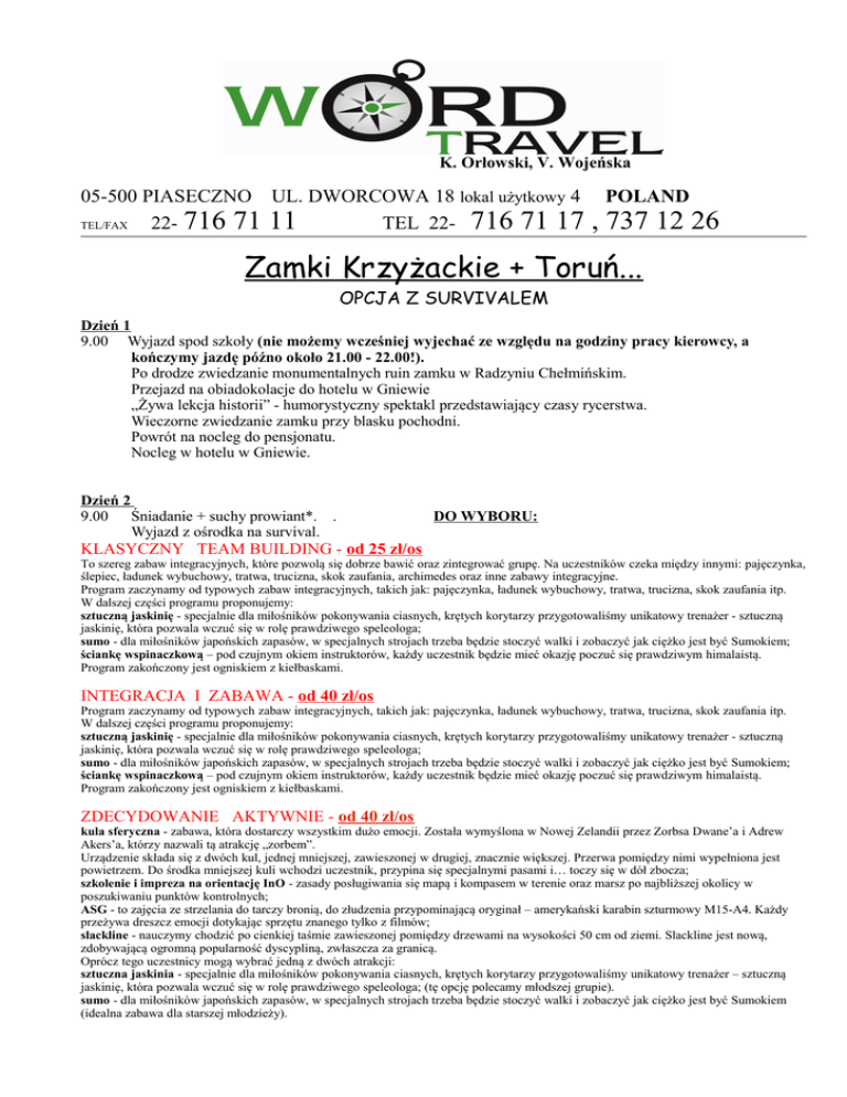 K. Orłowski, V. Wojeńska 05-500 PIASECZNO UL. DWORCOWA 18 lokal użytkowy 4 TEL/FAX 22- 716 71 11 TEL 22- 716 71 17 POLAND , 737 12 26 Zamki Krzyżackie + Toruń... OPCJA Z SURVIVALEM Dzień 1 9.00 Wyjazd spod szkoły (nie możemy wcześniej wyjechać ze względu na godziny pracy kierowcy, a kończymy jazdę późno około 21.00 - 22.00!). Po drodze zwiedzanie monumentalnych ruin zamku w Radzyniu Chełmińskim. Przejazd na obiadokolacje do hotelu w Gniewie „Żywa lekcja historii” - humorystyczny spektakl przedstawiający czasy rycerstwa. Wieczorne zwiedzanie zamku przy blasku pochodni. Powrót na nocleg do pensjonatu. Nocleg w hotelu w Gniewie. Dzień 2 9.00 Śniadanie + suchy prowiant*. . Wyjazd z ośrodka na survival. DO WYBORU: KLASYCZNY TEAM BUILDING - od 25 zł/os To szereg zabaw integracyjnych, które pozwolą się dobrze bawić oraz zintegrować grupę. Na uczestników czeka między innymi: pajęczynka, ślepiec, ładunek wybuchowy, tratwa, trucizna, skok zaufania, archimedes oraz inne zabawy integracyjne. Program zaczynamy od typowych zabaw integracyjnych, takich jak: pajęczynka, ładunek wybuchowy, tratwa, trucizna, skok zaufania itp. W dalszej części programu proponujemy: sztuczną jaskinię - specjalnie dla miłośników pokonywania ciasnych, krętych korytarzy przygotowaliśmy unikatowy trenażer - sztuczną jaskinię, która pozwala wczuć się w rolę prawdziwego speleologa; sumo - dla miłośników japońskich zapasów, w specjalnych strojach trzeba będzie stoczyć walki i zobaczyć jak ciężko jest być Sumokiem; ściankę wspinaczkową – pod czujnym okiem instruktorów, każdy uczestnik będzie mieć okazję poczuć się prawdziwym himalaistą. Program zakończony jest ogniskiem z kiełbaskami. INTEGRACJA I ZABAWA - od 40 zł/os Program zaczynamy od typowych zabaw integracyjnych, takich jak: pajęczynka, ładunek wybuchowy, tratwa, trucizna, skok zaufania itp. W dalszej części programu proponujemy: sztuczną jaskinię - specjalnie dla miłośników pokonywania ciasnych, krętych korytarzy przygotowaliśmy unikatowy trenażer - sztuczną jaskinię, która pozwala wczuć się w rolę prawdziwego speleologa; sumo - dla miłośników japońskich zapasów, w specjalnych strojach trzeba będzie stoczyć walki i zobaczyć jak ciężko jest być Sumokiem; ściankę wspinaczkową – pod czujnym okiem instruktorów, każdy uczestnik będzie mieć okazję poczuć się prawdziwym himalaistą. Program zakończony jest ogniskiem z kiełbaskami. ZDECYDOWANIE AKTYWNIE - od 40 zł/os kula sferyczna - zabawa, która dostarczy wszystkim dużo emocji. Została wymyślona w Nowej Zelandii przez Zorbsa Dwane’a i Adrew Akers’a, którzy nazwali tą atrakcję „zorbem”. Urządzenie składa się z dwóch kul, jednej mniejszej, zawieszonej w drugiej, znacznie większej. Przerwa pomiędzy nimi wypełniona jest powietrzem. Do środka mniejszej kuli wchodzi uczestnik, przypina się specjalnymi pasami i… toczy się w dół zbocza; szkolenie i impreza na orientację InO - zasady posługiwania się mapą i kompasem w terenie oraz marsz po najbliższej okolicy w poszukiwaniu punktów kontrolnych; ASG - to zajęcia ze strzelania do tarczy bronią, do złudzenia przypominającą oryginał – amerykański karabin szturmowy M15-A4. Każdy przeżywa dreszcz emocji dotykając sprzętu znanego tylko z filmów; slackline - nauczymy chodzić po cienkiej taśmie zawieszonej pomiędzy drzewami na wysokości 50 cm od ziemi. Slackline jest nową, zdobywającą ogromną popularność dyscypliną, zwłaszcza za granicą. Oprócz tego uczestnicy mogą wybrać jedną z dwóch atrakcji: sztuczna jaskinia - specjalnie dla miłośników pokonywania ciasnych, krętych korytarzy przygotowaliśmy unikatowy trenażer – sztuczną jaskinię, która pozwala wczuć się w rolę prawdziwego speleologa; (tę opcję polecamy młodszej grupie). sumo - dla miłośników japońskich zapasów, w specjalnych strojach trzeba będzie stoczyć walki i zobaczyć jak ciężko jest być Sumokiem (idealna zabawa dla starszej młodzieży). EXTREMALNY DZIEŃ - od 60 zł/os kula sferyczna - zabawa, która dostarczy wszystkim dużo emocji. Została wymyślona w Nowej Zelandii przez Zorbsa Dwane’a i Adrew Akers’a, którzy nazwali tę atrakcję „zorbem”. Urządzenie składa się z dwóch kul, jednej mniejszej, zawieszonej w drugiej, znacznie większej. Do środka mniejszej kuli wchodzi uczestnik, przypina się specjalnymi pasami i… toczy się w dół zbocza; paintball - to niesamowicie wciągająca gra, ucząca maskowania, podchodów, współdziałania w grupie, a także szybkiego podejmowania samodzielnych decyzji. Uczestnicy podczas zajęć wyposażeni będą w specjalne ubranie, maski ochronne oraz markery na kulki z farbą. Każdy będzie miał do wystrzelenia 150 kulek; ASG – to zajęcia ze strzelania do tarczy bronią, do złudzenia przypominającą oryginał – amerykański karabin szturmowy M15-A4. Każdy przeżywa dreszcz emocji dotykając sprzętu znanego tylko z filmów; sztuczna jaskinia – specjalnie dla miłośników pokonywania ciasnych, krętych korytarzy przygotowaliśmy unikatowy trenażer – sztuczną jaskinię, która pozwala wczuć się w rolę prawdziwego speleologa; slackline - nauczymy chodzić po cienkiej taśmie zawieszonej pomiędzy drzewami na wysokości 50 cm od ziemi. Slackline jest nową, zdobywającą ogromną popularność dyscypliną, zwłaszcza za granicą; szkolenie i Impreza na Orientację - zasady posługiwania się mapą i kompasem w terenie oraz marsz po najbliższej okolicy (terenie obiektu) w poszukiwaniu punktów kontrolnych. BMP: ZAGADKI KRYMINALNE DRZEWINY - 40 zł/os Zagadka kryminalna czeka na rozwiązanie! Niestety i tej małej, kaszubskiej wioski nie ominęło zło kryminalnego przestępstwa. Na miejscu znaleziono tylko kilka kropel czerwonej cieczy, odciski palców, butów oraz opon samochodu. Tylko jak zabezpieczyć teren przestępstwa, na co zwrócić szczeg