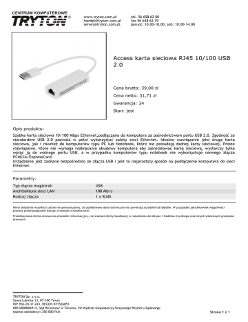 www.tryton.com.pl [email protected] [email protected] tel. 56 658 62 00 fax 56 658 62 19 pon-pt: 10.00-18.00, sob: 10.00-14.00 Access karta sieciowa RJ45 10/100 USB 2.0 Cena brutto: 39,00 zł Cena netto: 31,71 zł Gwarancja: 24 Stan: jest Opis produktu: Szybka karta sieciowa 10/100 Mbps Ethernet,podłączana do komputera za pośrednictwem portu USB 2.0. Zgodność ze standardem USB 2.0 pozwala w pełni wykorzystać zalety sieci Ethernet. Idealne rozwiązanie jako druga karta sieciowa, jak i również do komputerów typu PC lub Notebook, które nie posiadają żadnej karty sieciowej. Proste rozwiązanie, które nie wymaga rozkręcania obudowy komputera aby zainstalować kartę sieciową, wystarczy tylko wpiąć ją do wolnego portu USB, a w przypadku komputerów typu notebook nie wykorzystuje cennego złącza PCMCIA/ExpressCard. Urządzenie jest zasilane bezpośrednio ze złącza USB i jest to najprostszy sposób na podłączenie komputera do sieci Ethernet. Parametry: Typ złącza magistrali Architektura sieci LAN Rodzaj zlącza USB 100 Mb/s 1 x RJ45 Mimo dołożenia wszelkich starań nie gwarantujemy, że publikowane dane techniczne nie zawierają uchybień lub błędów. W przypadku jakichkolwiek wątpliwości prosimy przed podjęciem decyzji o kontakt z handlowcem. Przedstawiona oferta cenowa ma charakter informacyjny, nie stanowi oferty handlowej w rozumieniu Art.66 par.1 Kodeksu Cywilnego oraz innych właściwych przepisów prawnych. TRYTON Sp. z o.o. Szosa Lubicka 13, 87-100 Toruń NIP 956-20-37-243, REGON 871526851 KRS 0000006913, Sąd Rejonowy w Toruniu, VII Wydział Gospodarczy Krajowego Rejestru Sądowego kapitał zakładowy: 250 000 PLN Strona 1 z 1