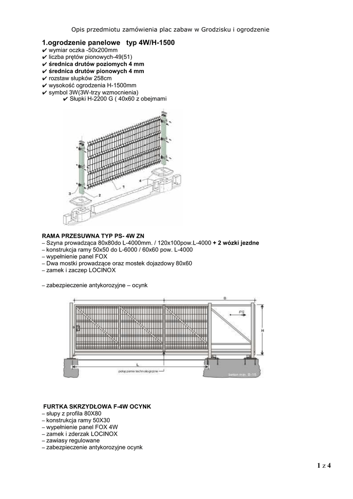 Opis przedmiotu zamówienia plac zabaw w Grodzisku i ogrodzenie 1.ogrodzenie panelowe typ 4W/H-1500 ✔ wymiar oczka -50x200mm ✔ liczba prętów pionowych-49(51) ✔ średnica drutów poziomych 4 mm ✔ średnica drutów pionowych 4 mm ✔ rozstaw słupków 258cm ✔ wysokość ogrodzenia H-1500mm ✔ symbol 3W(3W-trzy wzmocnienia) ✔ Słupki H-2200 G ( 40x60 z obejmami RAMA PRZESUWNA TYP PS- 4W ZN – Szyna prowadząca 80x80do L-4000mm. / 120x100pow.L-4000 + 2 wózki jezdne – konstrukcja ramy 50x50 do L-6000 / 60x60 pow. L-4000 – wypełnienie panel FOX – Dwa mostki prowadzące oraz mostek dojazdowy 80x60 – zamek i zaczep LOCINOX – zabezpieczenie antykorozyjne – ocynk FURTKA SKRZYDŁOWA F-4W OCYNK – słupy z profila 80X80 – konstrukcja ramy 50X30 – wypełnienie panel FOX 4W – zamek i zderzak LOCINOX – zawiasy regulowane – zabezpieczenie antykorozyjne ocynk 1z4 Grodzisk Zestaw 1 – ścianka gimnastyczna i zjeżdżalni • WYMIARY: wysokość: 2,30 m długość: 3,80 m Zestaw 2- piaskownica 00 • • Piaskownica z bali WYMIARY: długość: 3,00 m szerokość: 3,00 m wysokość: 0,30 m Zestaw 3 bujak jednomiejscowy – szt 2 Konik Kategoria: Bujaki sprężynowe WYMIARY: długość: 1,20 m szerokość: 0,30 m wysokość: 1,20 m 2z4 Sprężynowiec ze stelażem ze sklejki wodoodpornej z filmem melaminowym gr.18 mm wykonanym z wyciętych kształtowo formatek z namalowanymi rysami konika. Formatki połączone ocynkowanymi elementami złącznymi osłoniętymi plastikowymi korkami z zaślepkami i przykręcone do stalowego mocowania sprężyny zabezpieczonego przed warunkami atmosferycznymi poprzez lakierowanie proszkowe farbami poliestrowymi. Rączki (podnóżki) plastikowe, duże, zapobiegające przed urazami oka. Stalowa sprężyna bujaka wykonana ze stali jakościowej (również lakierowana proszkowo) połączona z mocowaniem sprężynowca oraz betonowym bloczkiem fundamentowym lub stalową podstawą do posadowienia w gruncie. Sprężynowiec posadowiony na głębokości 0,45 m. Zestaw 4 -zjeżdżalnia z piaskownicą i ścianką wspinaczkowa Wymiary: 2m x 4,3m x h3m (platforma o wysokości 145cm) Zawartość zestawu • zwymiarowane i przygotowane do montażu (według instrukcji) drewno • dach z materiału lub drewna • zjeżdżalnia Classic 3-metrowa dostępna w 4 kolorach – żółtym, czerwonym, zielonym lub niebieskim • ścianka wspinaczkowa • drabinka 1 • piaskownica z siatką zabezpieczającą Cat Stop™ • nieprzemakalny dach z płótna w kolorze niebieskim • instrukcja montażu, kompletny zestaw akcesoriów montażowych, wiertła i końcówki do wkrętarki Zestaw 5- huśtawka z podestem 3z4 Wymiary: Wymiar: 2,5m x 2,2m x h2,1m Wymiary z uwzględnieniem stref bezpieczeństwa: 6,5m x 6,2m x h2,1m Zestaw 6 – pomost ruchomy Pomost wiszący-ruchomy WYMIARY: długość: 2,00 m szerokość: 1,00 m wysokość: 1,60 m 4z4
