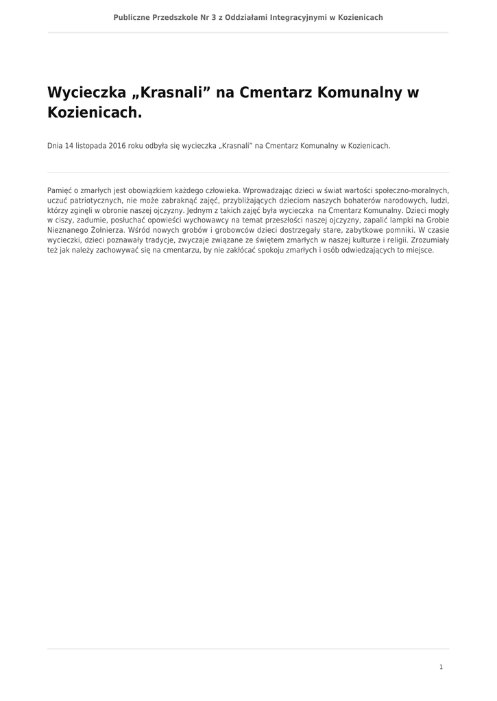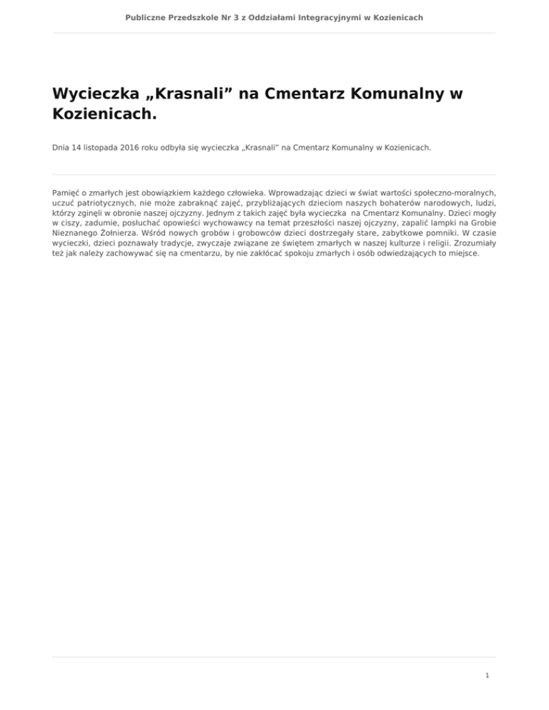 Publiczne Przedszkole Nr 3 z Oddziałami Integracyjnymi w Kozienicach Wycieczka „Krasnali” na Cmentarz Komunalny w Kozienicach. Dnia 14 listopada 2016 roku odbyła się wycieczka „Krasnali” na Cmentarz Komunalny w Kozienicach. Pamięć o zmarłych jest obowiązkiem każdego człowieka. Wprowadzając dzieci w świat wartości społeczno-moralnych, uczuć patriotycznych, nie może zabraknąć zajęć, przybliżających dzieciom naszych bohaterów narodowych, ludzi, którzy zginęli w obronie naszej ojczyzny. Jednym z takich zajęć była wycieczka na Cmentarz Komunalny. Dzieci mogły w ciszy, zadumie, posłuchać opowieści wychowawcy na temat przeszłości naszej ojczyzny, zapalić lampki na Grobie Nieznanego Żołnierza. Wśród nowych grobów i grobowców dzieci dostrzegały stare, zabytkowe pomniki. W czasie wycieczki, dzieci poznawały tradycje, zwyczaje związane ze świętem zmarłych w naszej kulturze i religii. Zrozumiały też jak należy zachowywać się na cmentarzu, by nie zakłócać spokoju zmarłych i osób odwiedzających to miejsce. 1