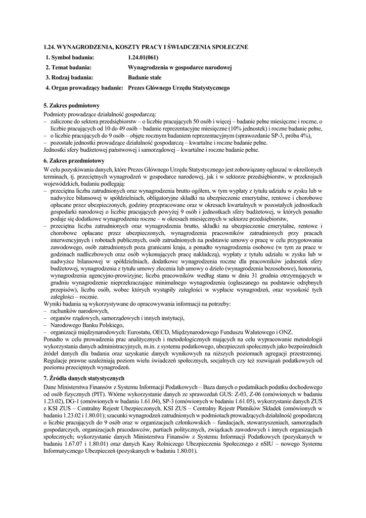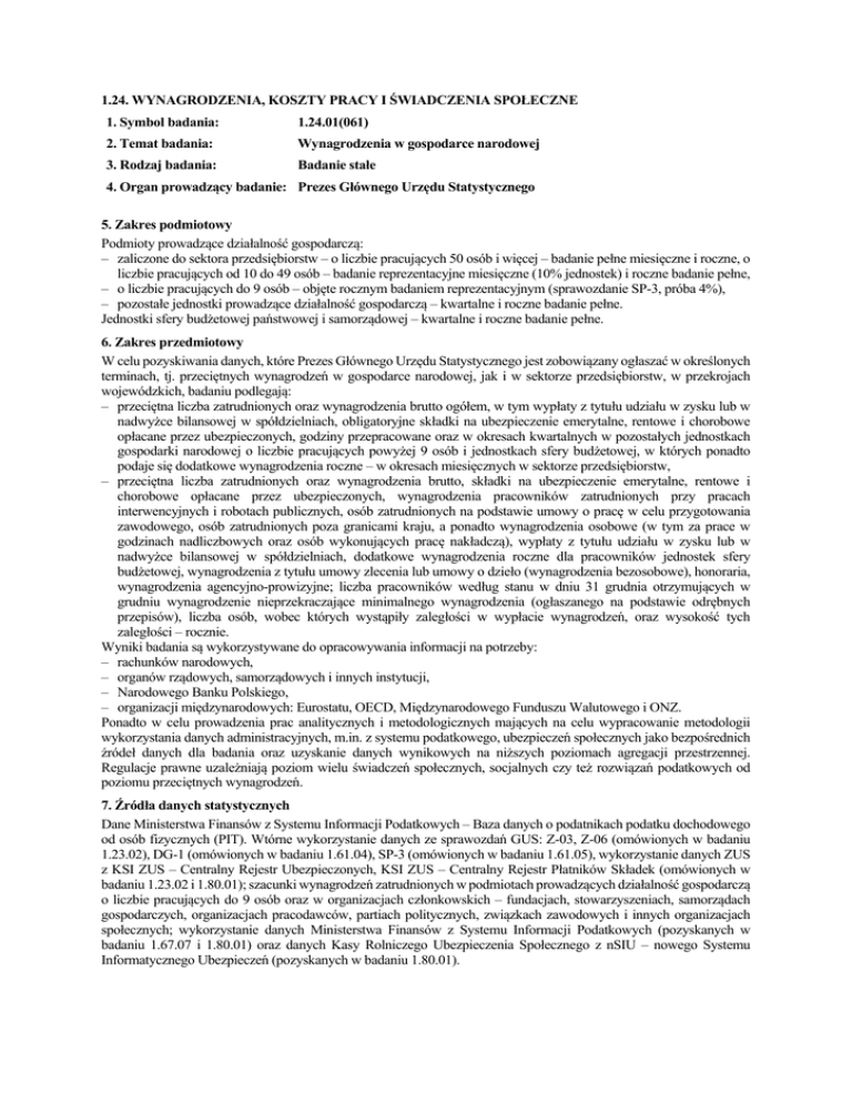 1.24. WYNAGRODZENIA, KOSZTY PRACY I ŚWIADCZENIA SPOŁECZNE 1. Symbol badania: 1.24.01(061) 2. Temat badania: Wynagrodzenia w gospodarce narodowej 3. Rodzaj badania: Badanie stałe 4. Organ prowadzący badanie: Prezes Głównego Urzędu Statystycznego 5. Zakres podmiotowy Podmioty prowadzące działalność gospodarczą: – zaliczone do sektora przedsiębiorstw – o liczbie pracujących 50 osób i więcej – badanie pełne miesięczne i roczne, o liczbie pracujących od 10 do 49 osób – badanie reprezentacyjne miesięczne (10% jednostek) i roczne badanie pełne, – o liczbie pracujących do 9 osób – objęte rocznym badaniem reprezentacyjnym (sprawozdanie SP-3, próba 4%), – pozostałe jednostki prowadzące działalność gospodarczą – kwartalne i roczne badanie pełne. Jednostki sfery budżetowej państwowej i samorządowej – kwartalne i roczne badanie pełne. 6. Zakres przedmiotowy W celu pozyskiwania danych, które Prezes Głównego Urzędu Statystycznego jest zobowiązany ogłaszać w określonych terminach, tj. przeciętnych wynagrodzeń w gospodarce narodowej, jak i w sektorze przedsiębiorstw, w przekrojach wojewódzkich, badaniu podlegają: – przeciętna liczba zatrudnionych oraz wynagrodzenia brutto ogółem, w tym wypłaty z tytułu udziału w zysku lub w nadwyżce bilansowej w spółdzielniach, obligatoryjne składki na ubezpieczenie emerytalne, rentowe i chorobowe opłacane przez ubezpieczonych, godziny przepracowane oraz w okresach kwartalnych w pozostałych jednostkach gospodarki narodowej o liczbie pracujących powyżej 9 osób i jednostkach sfery budżetowej, w których ponadto podaje się dodatkowe wynagrodzenia roczne – w okresach miesięcznych w sektorze przedsiębiorstw, – przeciętna liczba zatrudnionych oraz wynagrodzenia brutto, składki na ubezpieczenie emerytalne, rentowe i chorobowe opłacane przez ubezpieczonych, wynagrodzenia pracowników zatrudnionych przy pracach interwencyjnych i robotach publicznych, osób zatrudnionych na podstawie umowy o pracę w celu przygotowania zawodowego, osób zatrudnionych poza granicami kraju, a ponadto wynagrodzenia osobowe (w tym za prace w godzinach nadliczbowych oraz osób wykonujących pracę nakładczą), wypłaty z tytułu udziału w zysku lub w nadwyżce bilansowej w spółdzielniach, dodatkowe wynagrodzenia roczne dla pracowników jednostek sfery budżetowej, wynagrodzenia z tytułu umowy zlecenia lub umowy o dzieło (wynagrodzenia bezosobowe), honoraria, wynagrodzenia agencyjno-prowizyjne; liczba pracowników według stanu w dniu 31 grudnia otrzymujących w grudniu wynagrodzenie nieprzekraczające minimalnego wynagrodzenia (ogłaszanego na podstawie odrębnych przepisów), liczba osób, wobec których wystąpiły zaległości w wypłacie wynagrodzeń, oraz wysokość tych zaległości – rocznie. Wyniki badania są wykorzystywane do opracowywania informacji na potrzeby: – rachunków narodowych, – organów rządowych, samorządowych i innych instytucji, – Narodowego Banku Polskiego, – organizacji międzynarodowych: Eurostatu, OECD, Międzynarodowego Funduszu Walutowego i ONZ. Ponadto w celu prowadzenia prac analitycznych i metodologicznych mających na celu wypracowanie metodologii wykorzystania danych administracyjnych, m.in. z systemu podatkowego, ubezpieczeń społecznych jako bezpośrednich źródeł danych dla badania oraz uzyskanie danych wynikowych na niższych poziomach agregacji przestrzennej. Regulacje prawne uzależniają poziom wielu świadczeń społecznych, socjalnych czy też rozwiązań podatkowych od poziomu przeciętnych wynagrodzeń. 7. Źródła danych statystycznych Dane Ministerstwa Finansów z Systemu Informacji Podatkowych – Baza danych o podatnikach podatku dochodowego od osób fizycznych (PIT). Wtórne wykorzystanie danych ze sprawozdań GUS: Z-03, Z-06 (omówionych w badaniu 1.23.02), DG-1 (omówionych w badaniu 1.61.04), SP-3 (omówionych w badaniu 1.61.05), wykorzystanie danych ZUS z KSI ZUS – Centralny Rejestr Ubezpieczonych, KSI ZUS – Centralny Rejestr Płatników Składek (omówionych w badaniu 1.23.02 i 1.80.01); szacunki wynagrodzeń zatrudnionych w podmiotach prowadzących działalność gospodarczą o liczbie pracujących do 9 osób oraz w organizacjach członkowskich – fundacjach, stowarzyszeniach, samorządach gospodarczych, organizacjach pracodawców, partiach politycznych, związkach zawodowych i innych organizacjach społecznych; wykorzystanie danych Ministerstwa Finansów z Systemu Informacji Podatkowych (pozyskanych w badaniu 1.67.07 i 1.80.01) oraz danych Kasy Rolniczego Ubezpieczenia Społecznego z nSIU – nowego Systemu Informatycznego Ubezpieczeń (pozyskanych w badaniu 1.80.01). Lp. Podmioty przekazujące dane statystyczne Forma przekazania danych 7.0 7.1 1 Ministerstwo Finansów 7.2 System Informacji Podatkowych – Baza danych o podatnikach podatku dochodowego od osób fizycznych (PIT); dane jednostkowe o płatnikach podatku dochodowego od osób fizycznych nieprowadzących samodzielnie działalności gospodarczej wykazanych w lp. 2 w zakresie: NIP płatnika, rodzaj płatnika, adres siedziby lub zamieszkania płatnika: kod kraju, kod województwa, kod powiatu, kod gminy, miejscowość, ulica, numer domu, kod pocztowy, poczta; w formie elektronicznej 2 Ministerstwo Finansów System Informacji Podatkowych – Baza danych o podatnikach podatku dochodowego od osób fizycznych (PIT); dane jednostkowe (PIT-11, PIT-40) dotyczące podatników podatku dochodowego od osób fizycznych nieprowadzących samodzielnie działalności gospodarczej w zakresie: NIP płatnika, dane dotyczące podatnika: miejsce zamieszkania (kod województwa, kod powiatu, kod gminy), numer PESEL, płeć, koszty uzyskania przychodu, przychód, dochód, dochód zwolniony z podatku, zaliczka pobrana przez płatnika według tytułów: – należności ze stosunku: pracy, służbowego, spółdzielczego i z pracy nakładczej, a także zasiłki pieniężne z ubezpieczenia spo