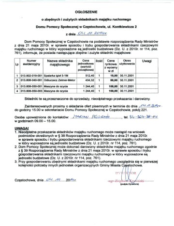 OGŁOSZENIE o zbędnych i zużytych składnikach majątku ruchomego Domu Pomocy Społecznej w Częstochowie, ul. Kontkiewicza 2 z dnia ..£'^L.<ff„£'^f.f/:K Dom Pomocy Społecznej w Częstochowie na podstawie rozporządzenia Rady Ministrów z dnia 21 maja 201 Or. w sprawie sposobu i trybu gospodarowania sl<ładnil^ami rzeczowymi majątku ruchomego w który wyposażone są jednostki budżetowe (Dz. U. z 201 Or. nr 114, poz. 761), infomiuje, że posiada następujące zbędne i zużyte składniki majątkowe: Lp Numer ewidencyjny Nazwa składnika majątkowego 1 013.802-019-001 Spalarka igieł 3-1M Cena jednostkowa (wartość początkowa) Ilość Okres Cena rynkowa użytkowania z wyceny wzł 512,40 1 10,00 30.11.2001 434,32 1 50,00 30.11.2001 3 013.808-050-001 Maszyna do szycia 1 244,40 1 100,00 30.11.2001 4 013.808-050-003 Maszyna do szycia 1 244,40 1 100,00 2 013.808-040-001 Odkurzacz Zelmer-Metor Uwagi 30.11.2001 Składniki te są przeznaczone do sprzedaży, nieodpłatnego przekazania i darowizny Zainteresowanych prosimy o składanie ofert pisemnych w terminie do dnia ./^^.-.'fl:^.^'^ do godziny 15.00 w sekretariacie Domu Pomocy Społecznej w Częstochowie, pokój 221. Osoba upoważniona do kontaktów: w godzinach 09.00 -15.00. .J^!^M^'iJ....2QQ.!?-.C^ tel. l.k.7.%k:M'A'::i.. UWAGAI 1. Nieodpłatne przekazanie składników majątku mchomego może nastąpić na wniosek podmiotów określonych w § 38 Rozporządzenia Rady Ministrów z dnia 21 maja 201 Or. w sprawie sposobu i trybu gospodarowania składnikami rzeczowymi majątku ruchomego w który wyposażone są jednostki budżetowe (Dz. U. z 201 Or. nr 114, poz. 761). 2. Dom Pomocy Społecznej może dokonać darowizny składników majątku ruchomego zgodnie z § 39 Rozporządzenia Rady Ministrów z dnia 21 maja 201 Or. w sprawie sposobu i trybu gospodarowania składnikami rzeczowymi majątku ruchomego w który wyposażone są jednostki budżetowe (Dz. U. z 201 Or. nr 114, poz. 761). 3. Przy gospodarowaniu zbędnymi składnikami majątku ruchomego uwzględnia się w pierwszej kolejności potrzeby innych jednostek organizacyjnych Gminy Miasta Częstochowa. Częstochowa, dnia ..C?.^.,..<^a 20rff/.r. (podpis Dyrektora)