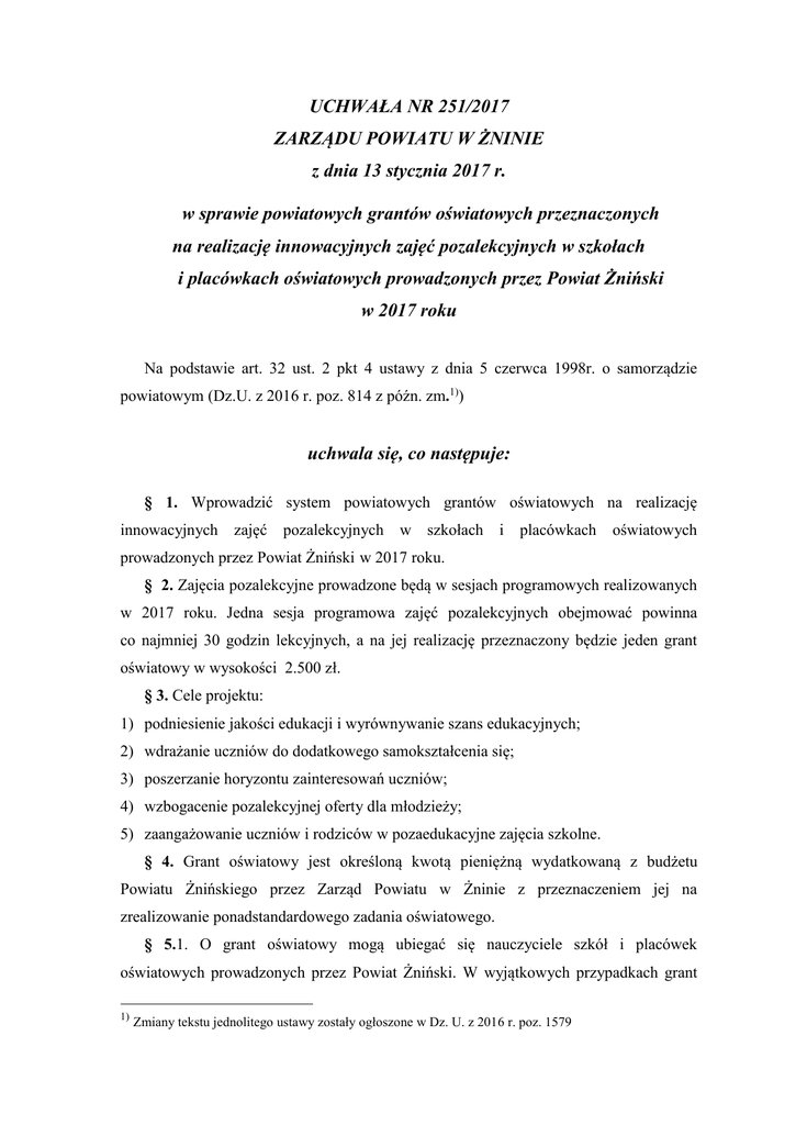 UCHWAŁA NR 251/2017 ZARZĄDU POWIATU W ŻNINIE z dnia 13 stycznia 2017 r. w sprawie powiatowych grantów oświatowych przeznaczonych na realizację innowacyjnych zajęć pozalekcyjnych w szkołach i placówkach oświatowych prowadzonych przez Powiat Żniński w 2017 roku Na podstawie art. 32 ust. 2 pkt 4 ustawy z dnia 5 czerwca 1998r. o samorządzie powiatowym (Dz.U. z 2016 r. poz. 814 z późn. zm.1)) uchwala się, co następuje: § 1. Wprowadzić system powiatowych grantów oświatowych na realizację innowacyjnych zajęć pozalekcyjnych w szkołach i placówkach oświatowych prowadzonych przez Powiat Żniński w 2017 roku. § 2. Zajęcia pozalekcyjne prowadzone będą w sesjach programowych realizowanych w 2017 roku. Jedna sesja programowa zajęć pozalekcyjnych obejmować powinna co najmniej 30 godzin lekcyjnych, a na jej realizację przeznaczony będzie jeden grant oświatowy w wysokości 2.500 zł. § 3. Cele projektu: 1) podniesienie jakości edukacji i wyrównywanie szans edukacyjnych; 2) wdrażanie uczniów do dodatkowego samokształcenia się; 3) poszerzanie horyzontu zainteresowań uczniów; 4) wzbogacenie pozalekcyjnej oferty dla młodzieży; 5) zaangażowanie uczniów i rodziców w pozaedukacyjne zajęcia szkolne. § 4. Grant oświatowy jest określoną kwotą pieniężną wydatkowaną z budżetu Powiatu Żnińskiego przez Zarząd Powiatu w Żninie z przeznaczeniem jej na zrealizowanie ponadstandardowego zadania oświatowego. § 5.1. O grant oświatowy mogą ubiegać się nauczyciele szkół i placówek oświatowych prowadzonych przez Powiat Żniński. W wyjątkowych przypadkach grant 1) Zmiany tekstu jednolitego ustawy zostały ogłoszone w Dz. U. z 2016 r. poz. 1579 oświatowy może być przyznany nauczycielom zatrudnionym w innych szkołach i placówkach, którzy aktywnie działają na rzecz szkół prowadzonych przez Powiat Żniński. 2. Jeden grant może być realizowany przez nie więcej niż dwóch nauczycieli. 3. Jeden nauczyciel może ubiegać się o przyznanie jednego grantu w danym roku. § 6. Grant oświatowy przeznaczony może być na realizację projektów dotyczących działań dydaktycznych, wychowawczych, rekreacyjno-sportowych lub artystycznych, integrujących dzieci i młodzież poprzez realizację pozalekcyjnych zajęć dydaktycznowychowawczych wykraczających poza program szkolny, stanowiących atrakcyjną propozycję kształtowania zainteresowań, propozycję intelektualną – wychodzącą naprzeciw zainteresowaniom młodzieży szkolnej. § 7. Wniosek o przyznanie grantu oświatowego składa się na formularzu stanowiącym załącznik nr 1 do niniejszej uchwały. § 8. Wnioski należy wypełnić komputerowo. § 9. Wnioski przyjmowane są w Powiatowym Zespole Oświaty w Żninie przy ul. Sienkiewicza 1, w terminie do 3 lutego 2017 roku. § 10. Wnioski niekompletne, wypełnione odręcznie, a także złożone po terminie nie będą rozpatrywane. § 11. 1. Oceny wniosków dokonuje komisja opiniująca projekty zajęć pozalekcyjnych, którą powołuje Zarząd Powiatu. 2. Zadaniem komisji jest zaopiniowanie jakości zgłoszonych projektów i wytypowanie spośród nich projektów proponowanych do przyznania dofinansowania. § 12. W skład komisji wchodzą: 1) Przedstawiciel Zarządu Powiatu w Żninie – jako Przewodniczący Komisji; 2) Dyrektor Powiatowego Zespołu Oświaty w Żninie; 3) Przewodniczący Komisji Oświaty, Kultury i Sportu Rady Powiatu w Żninie; 4) Przedstawiciel Międzyzakładowej Organizacji Związkowej Pracowników Oświaty NSZZ „Solidarność” w Żninie; 5) Przedstawiciel Związku Nauczycielstwa Polskiego w Żninie. § 13. Członkowie komisji zobowiązani są do zapoznania się z wnioskami pod kątem spełniania kryteriów określonych w § 14 uchwały. § 14. Komisja oceniać będzie wnioski według następujących kryteriów: 1) proponowany zakres tematyczny merytorycznym i dydaktycznym; zajęć pozalekcyjnych pod względem 2) wprowadzone innowacyjne rozwiązania pedagogiczne i interesujące formy edukacji; 3) ilość proponowanych godzin lekcyjnych; 4) liczbę uczniów objętych programem; 5) poprawność budżetu projektu; 6) dotychczasowe osiągnięcia pedagogiczne nauczyciela prowadzącego; 7) trafność proponowanej oferty; 8) możliwość pełnej kontroli realizacji programu, na który ma być przyznany grant; 9) zawarcie w projekcie sposobu dokonania pomiaru efektywności realizacji projektu. § 15. Rozpatrzenie wniosków następuje w ciągu 30 dni po upływie terminu określonego w § 9. Termin realizacji każdego grantu powinien rozpoczynać się nie wcześniej niż od 13 marca 2017 r. i trwać nie dłużej niż do 30 listopada 2017 r. § 16. Decyzję o przyznaniu grantu oświatowego podejmuje Zarząd Powiatu po otrzymaniu opinii komisji powołanej do oceny zgłaszanych projektów. § 17. Granty realizowane będą na podstawie zawartej umowy, której wzór stanowi załącznik nr 2 do niniejszej uchwały. § 18. Realizatorzy grantów mogą przeznaczyć nie więcej niż 50% wszystkich środków przewidzianych na realizację programu na wynagrodzenia prowadzących. Pozostałe środki w wysokości nie mniejszej niż 50% należy przeznaczyć na zakup materiałów i usług. § 19. 1. Nauczyciele, którym przyznano grant obowiązani są do prowadzenia dziennika zajęć oraz złożenia ww. dziennika wraz ze sprawozdaniem z realizacji projektu nie później niż 7 dni po jego zakończeniu. 2. Sprawozdanie końcowe z realizacji powinno zawierać następujące informacje: 1) nazwa szkoły lub placówki oświatowej, nazwiska realizujących zadanie; 2) opis realizacji zadania, w tym terminy zajęć, liczbę uczestników, zrealizowane zagadnienia i osiągnięte efekty; 3) nazwiska, imiona i podpisy osób sporządzających sprawozdanie; 4) podpis dyrektora szkoły lub placówki akceptującego sprawozdanie i dziennik zajęć. § 20. Wzór sprawozdania końcowego z realizacji grantu oświatowego przyznanego na realizację zajęć pozalekcyj