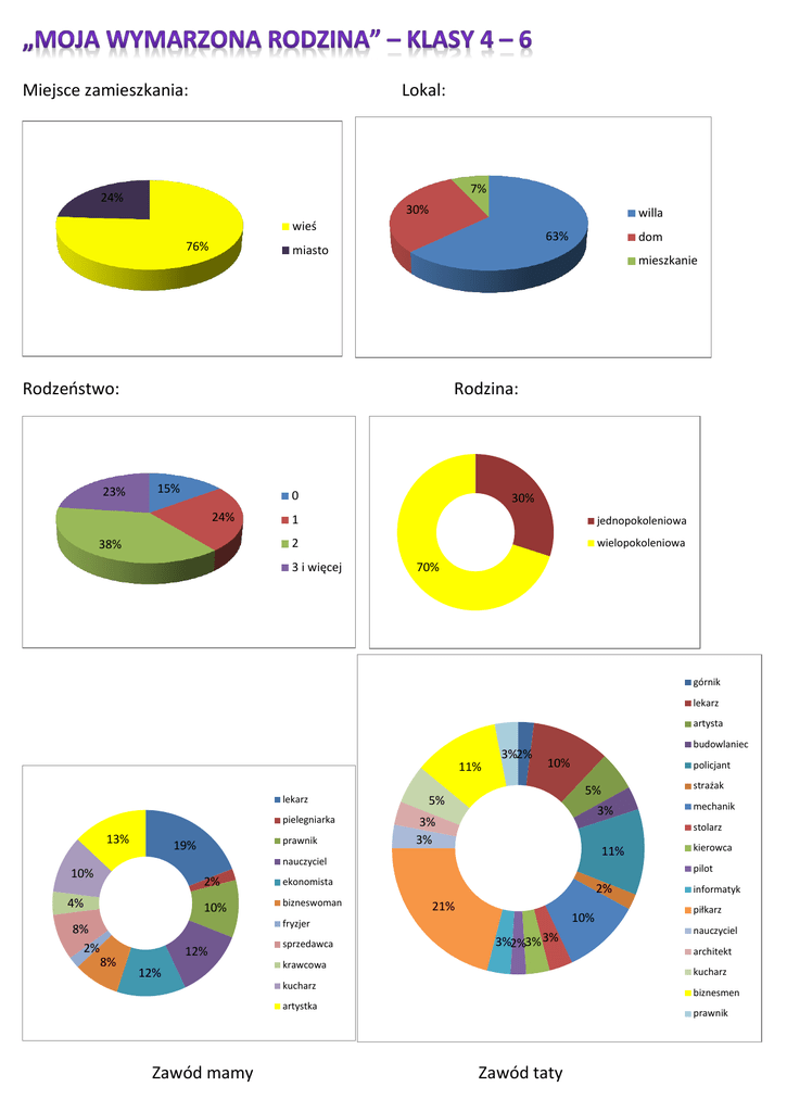Miejsce zamieszkania: Lokal: 7% 24% 30% willa wieś 76% 63% mieszkanie Rodzeństwo: 23% dom miasto Rodzina: 15% 0 24% 38% 30% 1 jednopokoleniowa 2 wielopokoleniowa 3 i więcej 70% górnik lekarz artysta 11% lekarz pielegniarka 13% prawnik 19% 3%2% budowlaniec 10% policjant 3% 3% 3% 4% 2% ekonomista 10% bizneswoman 11% 8% 12% 12% sprzedawca 2% 21% 10% 3%2%3% 3% krawcowa informatyk piłkarz nauczyciel architekt kucharz kucharz biznesmen artystka Zawód mamy kierowca pilot fryzjer 8% 2% mechanik stolarz nauczyciel 10% strażak 5% 5% prawnik Zawód taty Zwierzątko: 2% pies 20% 23% 55% kot inne bez zwierząt Wymarzona (statystyczna) rodzina uczniów klas 4 – 6 mieszka… ( i tu duża zmiana w porównaniu z młodszymi kolegami) na wsi (może to być Zalas) w dużej willi z basenem (chociaż co trzeciemu uczniowi wystarczy dom średni lub mały). W kwestii wyposażenia można odnotować duży telewizor (koniecznie plazma), zmywarkę,2 komputery, boisko, samochody (raczej sportowe zamiast limuzyny) oraz rower. Pojawia się potrzeba posiadania ładnego, pełnego kwiatów ogrodu, dużego tarasu. Rodzina jest wielopokoleniowa (babcia, dziadek, wujkowie, ciocie), dzieci jest już mniej (3), pojawia się służąca jako wsparcie w utrzymaniu porządku w dużym domu. Zwierzęta są konieczne. Najważniejszy jest pies. Dopełniają towarzystwa - kot, pająki, węże, kameleon, rybki, chomik, świnka morska, papugi, królik. Wspierani przez służbę niezbędny do szczęścia luksus zapewnią: mama lekarka lub artystka (aktorka, modelka, piosenkarka) i tata: piłkarz, policjant lub biznesmen. Mamo, tato naszych uczniów z klas 4 – 6 nie martwcie się, możecie zostać w Zalasiu. Wystarczy powiększyć działkę o kilka hektarów, powiększyć dom (od 6 do 100 pokoików), wyposażyć w basen (rower i samochód na ogół stoi w garażu), zostać artystką i piłkarzem, a dziecko będzie szczęśliwe (jego dwójka rodzeństwa również). PS. Klasy 4, 5 preferują rodzinę wielopokoleniową, a klasa 6 chce mieszkać tylko z rodzicami. Obraz statystycznej rodziny klas 4 – 6 wykona klasa 4a.