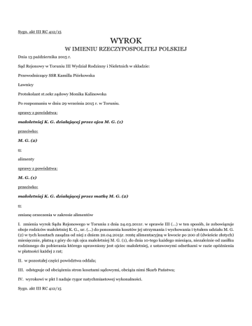 Sygn. akt III RC 412/15 WYROK W IMIENIU RZECZYPOSPOLITEJ POLSKIEJ Dnia 13 października 2015 r. Sąd Rejonowy w Toruniu III Wydział Rodzinny i Nieletnich w składzie: Przewodniczący SSR Kamilla Piórkowska Ławnicy Protokolant st.sekr.sądowy Monika Kalinowska Po rozpoznaniu w dniu 29 września 2015 r. w Toruniu. sprawy z powództwa: małoletniej K. G. działającej przez ojca M. G. (1) przeciwko: M. G. (2) o: alimenty sprawy z powództwa: M. G. (1) przeciwko: małoletniej K. G. działającej przez matkę M. G. (2) o: zmianę orzeczenia w zakresie alimentów I. zmienia wyrok Sądu Rejonowego w Toruniu z dnia 24.03.2011r. w sprawie III (...) w ten sposób, że zobowiązuje oboje rodziców małoletniej K. G., ur. (...) do ponoszenia kosztów jej utrzymania i wychowania i tytułem udziału M. G. (2) w tych kosztach zasądza od niej z dniem 20.04.2015r. rentę alimentacyjną w kwocie po 200 zł (dwieście złotych) miesięcznie, płatną z góry do rąk ojca małoletniej M. G. (1), do dnia 10-tego każdego miesiąca, niezależnie od zasiłku rodzinnego do pobierania którego uprawniony jest ojciec małoletniej, z ustawowymi odsetkami w razie opóźnienia w płatności każdej z rat; II. w pozostałej części powództwa oddala; III. odstępuje od obciążenia stron kosztami sądowymi, obciąża nimi Skarb Państwa; IV. wyrokowi w pkt I nadaje rygor natychmiastowej wykonalności. Sygn. akt III RC 412/15 UZASADNIENIE M. G. (1) działający na rzecz małoletniej powódki K. G. w pozwie wniesionym do tut. Sądu w dniu 20 kwietnia 2015 r. przeciwko M. G. (2) domagał się zasądzenia renty alimentacyjnej w kwocie po 700 zł miesięcznie na rzecz małoletniej, poczynając od wniesienia pozwu, do dnia 10-tego każdego miesiąca. W uzasadnieniu pozwu podkreślił , że na mocy postanowienia Sądu Rejonowego w Toruniu z dnia 11.12.2014r. w sprawie IIINsm (...), został zmieniony wyrok rozwodowy w przedmiocie władzy rodzicielskiej i miejsce zamieszkania małoletniej zostało ustalone przy ojcu. Potrzeby małoletniej i jej koszt utrzymania są wysokie i wynoszą ok. 1400 zł. miesięcznie. M. G. (1) w pozwie wniesionym do tut. Sądu w dniu 20 kwietnia 2015 r. przeciwko małoletniej pozwanej K. G. działającej przez matkę M. G. (2) domagał się uchylenia obowiązku alimentacyjnego nałożonego na niego wyrokiem Sądu Okręgowego w Toruniu z dnia 7.10.2002r. w sprawie IC (...) syg. akt (...). W uzasadnieniu pozwu podkreślił , że na mocy postanowienia Sądu Rejonowego w Toruniu z dnia 11.12.2014r. w sprawie IIINsm (...), został zmieniony wyrok rozwodowy w przedmiocie władzy rodzicielskiej i miejsce zamieszkania małoletniej zostało ustalone przy ojcu. On wiec ponosi wszystkie koszty związane z utrzymaniem i wychowaniem małoletniej. Na mocy postanowienia Sądu Rejonowego w Toruniu z dnia 22.04.2015r. w niniejszej sprawie połączył obie sprawy do wspólnego rozpoznania i rozstrzygnięcia. Pozwana M. G. (2) w odpowiedzi na pozew z dnia 17.06.2015r. wniosła o oddalenie powództwa o zasądzenie od niej alimentów i uznała żądanie o uchylenie obowiązku alimentacyjnego M. G. (1) na rzecz małoletniej K. G.. Oświadczyła, że od lutego 2015r. jest osobą bezrobotną, pobiera zasiłek rehabilitacyjny, nie jest w stanie podjąć pracy. Na rozprawie w dniu 20.08.2015r. oświadczyła, że może na rzecz córki płacić alimenty w kwocie po 100 zł. miesięcznie. S a d u s t a l i ł, c o n a s t ę p u j e: Małoletnia powódka K. G. pochodzi ze związku małżeńskiego M. G. (2) i M. G. (1). Wyrokiem Sądu Okręgowego w Toruniu z dnia 7.10.2002r., sygn. akt I C 797/02, rozwiązano małżeństwo rodziców małoletniej tj. M. G. (2) i M. G. (1), przez rozwód bez orzekania o winie. Wykonywanie władzy rodzicielskiej nad małoletnią zostało powierzona obojgu rodzicom, z tym że miejsce zamieszkania dziecka ustalono przy matce. Wówczas obowiązek utrzymania i wychowania małoletniej został nałożony na obie strony, a tytułem udziału M. G. (1) w tych kosztach zasądzono od niego na rzecz małoletniej kwotę po 170 zł miesięcznie płatne do rąk M. G. (2), począwszy od prawomocności wyroku do dnia 15 każdego miesiąca z góry z ustawowymi odsetkami w razie opóźnienia w płatności każdej z rat, niezależnie od zasiłku rodzinnego do pobierania którego uprawniona jest matka dziecka. Następnie Wyrokiem Sądu Rejonowego w Toruniu z dnia 24.03.2011r. w sprawie (...), renta alimentacyjna na rzecz małoletniej została podwyższona do kwoty po 400 zł. miesięcznie, płatne do rąk M. G. (2), począwszy od 13.10.2010r. do dnia 15 każdego miesiąca z góry z ustawowymi odsetkami w razie opóźnienia w płatności każdej z rat, niezależnie od zasiłku rodzinnego do pobierania którego uprawniona jest matka dziecka. Wówczas małoletnia miała 11 lata, uczęszczała do klasy V szkoły podstawowej. Uczestniczyła w dodatkowych zajęciach sportowych, co wiązało się z zakupem odzieży i obuwia sportowego. Brała udział w obozie sportowym, który kosztował 150 zł. Jadła obiady w szkole finansowane przez (...). Ogólnie była zdrowa. Matka małoletniej nigdzie nie pracowała. Była zarejestrowana jako bezrobotna, bez prawa do zasiłku. Otrzymywała zasiłek rodzinny na córkę 91 zł. miesięcznie. Mieszkała z córką i z konkubentem, który pracował i zarabiał ok. 3000 zł. Pomagała jej też mama. Opłata za czynsz wynosiła 39 zł., za prąd 110 zł. za dwa miesiące, za gaz 54 zł. miesięcznie, za wodę 50 zł. co 3 miesiące, musiała kupować węgiel na zimę – 2 tony węgla i drewno. M. G. (1) pracował jako strażak. Miesięcznie zarabiał ok. 2512 zł. Ponadto 1 lub 2 razy w roku otrzymywał nagrody uznaniowe w kwotach od 50 do 200 zł., otrzymywał 13 –tą pensję, dofinansowanie do urlopu na siebie i na córkę – ok. 600 zł. oraz tzw. „mundurówkę” ok. 2000 zł. rocznie. Pomagał też bratu przy montażu anten , jednak dochody z tego tytułu były nieregularne.