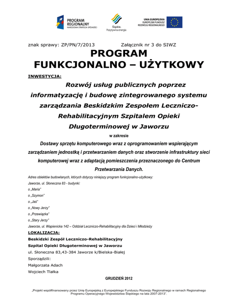 znak sprawy: ZP/PN/7/2013 Załącznik nr 3 do SIWZ PROGRAM FUNKCJONALNO – UŻYTKOWY INWESTYCJA: Rozwój usług publicznych poprzez informatyzację i budowę zintegrowanego systemu zarządzania Beskidzkim Zespołem LeczniczoRehabilitacyjnym Szpitalem Opieki Długoterminowej w Jaworzu w zakresie Dostawy sprzętu komputerowego wraz z oprogramowaniem wspierającym zarządzaniem jednostką i przetwarzaniem danych oraz stworzenie infrastruktury sieci komputerowej wraz z adaptacją pomieszczenia przeznaczonego do Centrum Przetwarzania Danych. Adres obiektów budowlanych, których dotyczy niniejszy program funkcjonalno-użytkowy: Jaworze, ul. Słoneczna 83 - budynki: o „Maria” o „Szymon” o „Jaś” o „Nowy Jerzy” o „Przewiązka” o „Stary Jerzy” Jaworze, ul. Wapienicka 142 – Oddział Leczniczo-Rehabilitacyjny dla Dzieci i Młodzieży LOKALIZACJA: Beskidzki Zespół Leczniczo-Rehabilitacyjny Szpital Opieki Długoterminowej w Jaworzu ul. Słoneczna 83,43-384 Jaworze k/Bielska-Białej Sporządzili: Małgorzata Adach Wojciech Tlałka GRUDZIEŃ 2012 „Projekt współfinansowany przez Unię Europejską z Europejskiego Funduszu Rozwoju Regionalnego w ramach Regionalnego Programu Operacyjnego Województwa Śląskiego na lata 2007-2013”. ZAWARTOŚĆ OPRACOWANIA: Strona tytułowa Zawartość opracowania Klasyfikacja wg słownika CPV Definicje i skróty Część opisowa Część informacyjna _________________________________________________________________________________ „Projekt współfinansowany przez Unię Europejską z Europejskiego Funduszu Rozwoju Regionalnego w ramach Regionalnego Programu Operacyjnego Województwa Śląskiego na lata 2007-2013”. 2 Klasyfikacja wg słownika CPV: KLASYFIKACJA USŁUG PROJEKTOWYCH WG SŁOWNIKA CPV 71000000-8 Usługi architektoniczne, budowlane, inżynieryjne i kontrolne 71200000-0 Usługi architektoniczne i podobne 71220000-6 Usługi projektowania architektonicznego 71221000-3 Usługi architektoniczne w zakresie obiektów budowlanych 71320000-7 Usługi inżynieryjne w zakresie projektowania 71322000-1 Usługi inżynierii projektowej w zakresie inżynierii lądowej i wodnej KLASYFIKACJA ROBÓT BUDOWLANYCH WG SŁOWNIKA CPV 45000000-7 Roboty budowlane 45210000-2 Roboty budowlane w zakresie budynków 45215140-0 Roboty budowlane w zakresie obiektów szpitalnych 45223000-6 Roboty budowlane w zakresie konstrukcji 45300000-0 Roboty instalacyjne w budynkach 45310000-3 Roboty instalacyjne elektryczne 45311200-2 Roboty w zakresie instalacji elektrycznych 45315600-4 Instalacje niskiego napięcia 45317300-5 Elektryczne elektrycznych urządzeń rozdzielczych 45320000-6 Roboty izolacyjne 45343000-3 Roboty instalacyjne przeciwpożarowe 45400000-1 Roboty wykończeniowe w zakresie obiektów budowlanych 45410000-4 Tynkowanie 45421131-1 Instalowanie drzwi 45430000-0 Pokrywanie podłóg i ścian 45432121-8 Roboty w zakresie podłóg w pomieszczeniach komputerowych 45440000-3 Roboty malarskie i szklarskie 45442100-8 Roboty malarskie 45442180-2 Powtórne malowanie _________________________________________________________________________________ „Projekt współfinansowany przez Unię Europejską z Europejskiego Funduszu Rozwoju Regionalnego w ramach Regionalnego Programu Operacyjnego Województwa Śląskiego na lata 2007-2013”. 3 Definicje i skróty Ilekroć w dokumencie jest mowa o: „Serwerowni” - oznacza to „Pomieszczenie serwerowni BZLR w Jaworzu” „CPD” - oznacza to Centralny Punkt Dystrybucyjny sieci strukturalnej LAN – w serwerowni BLZR „PEL” - oznacza to elektryczno-logiczny końcowy punkt dostępowy sieci strukturalnej, składający się z zestawu gniazd logicznych RJ45 oraz zestawu gniazd wtykowych 230/V/16A z bolcem uziemiającym i blokadą – czerwonych – typu DATA” „Tablicy rozdzielczej komputerowa – TK” - oznacza to tablicę rozdzielczą 2230/400V instalacji elektrycznej dedykowanej dla potrzeb sieci LAN „WLZ” – oznacza to wewnętrzną linię zasilającą z budynkowej rozdzielni niskiego napięcia do tablicy rozdzielczej komputerowej TK „Inwestycji” - oznacza to realizację zamówienia pn. „Rozwój usług publicznych poprzez informatyzację i budowę zintegrowanego systemu zarządzania Beskidzkim Zespołem Leczniczo-Rehabilitacyjnym Szpitalem Opieki Długoterminowej w Jaworzu” „Inwestorze” lub „Zamawiającym” - oznacza to Beskidzki Zespół Leczniczo-Rehabilitacyjny Szpital Opieki Długoterminowej w Jaworzu. „Rozporządzeniu” - oznacza to Rozporządzenie Ministra Infrastruktury z dnia 2 września 2004 r. w sprawie szczegółowego zakresu i formy dokumentacji projektowej, specyfikacji technicznych wykonania i odbioru robót budowlanych oraz programu funkcjonalno-użytkowego (Dz. U. z 2004r. Nr 202 , poz. 2072). „PZP” - oznacza to Ustawę z dnia 29 stycznia 2004 r. Prawo zamówień publicznych (Dz. U. z 2007 r. Nr 233, poz. 1655 z późn. zmian.). „Programie” lub „PFU” - oznacza to poniższy Program Funkcjonalno-Użytkowy _________________________________________________________________________________ „Projekt współfinansowany przez Unię Europejską z Europejskiego Funduszu Rozwoju Regionalnego w ramach Regionalnego Programu Operacyjnego Województwa Śląskiego na lata 2007-2013”. 4 SPIS TREŚCI 1 CZĘŚĆ OPISOWA ................................................................................................................................. 7 1.1 WSTĘP .................................................................................................................................................. 7 1.1.1 Przedmiot opracowania ........................................................................................................... 7 1.1.2 Zakres opracowania ................................................................................................................ 7 1.1.3 Podstawy opracowania........................................................................