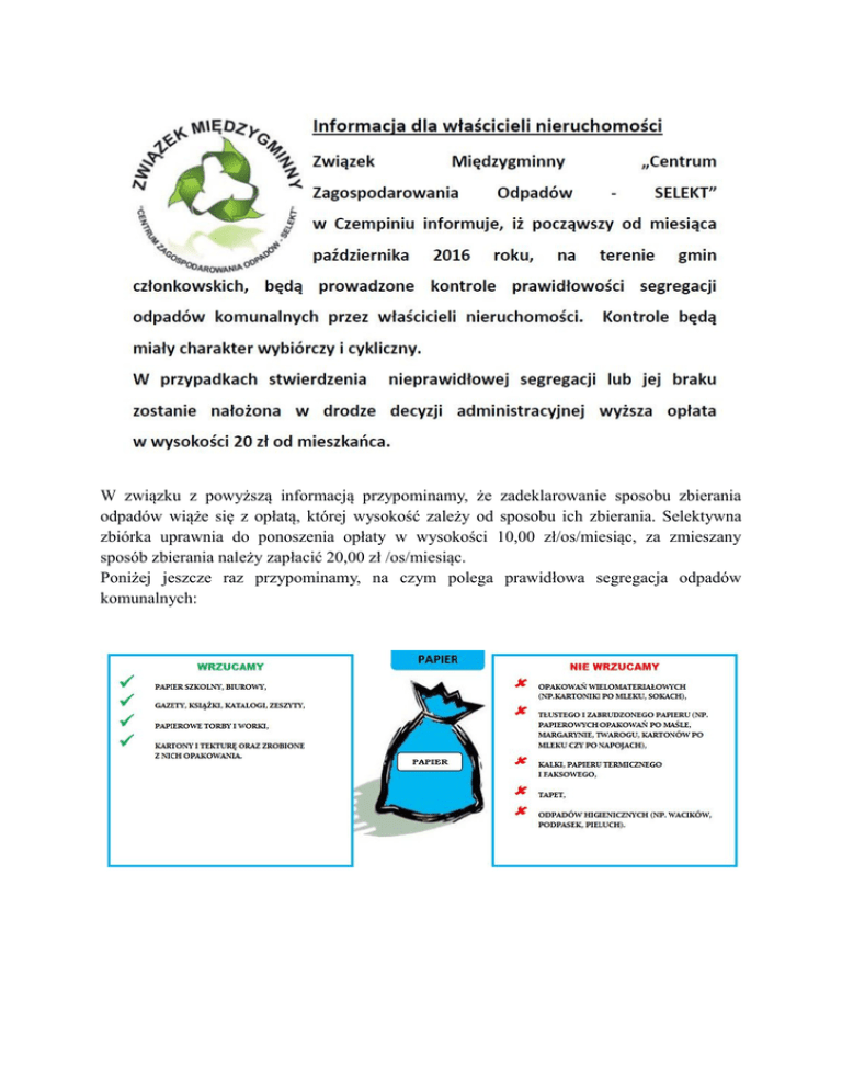 W związku z powyższą informacją przypominamy, że zadeklarowanie sposobu zbierania odpadów wiąże się z opłatą, której wysokość zależy od sposobu ich zbierania. Selektywna zbiórka uprawnia do ponoszenia opłaty w wysokości 10,00 zł/os/miesiąc, za zmieszany sposób zbierania należy zapłacić 20,00 zł /os/miesiąc. Poniżej jeszcze raz przypominamy, na czym polega prawidłowa segregacja odpadów komunalnych: