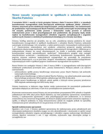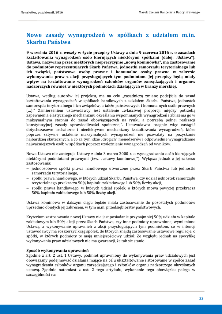 Newsletter, październik 2016 Marek Czernis Kancelaria Radcy Prawnego Nowe zasady wynagrodzeń w spółkach z udziałem m.in. Skarbu Państwa 9 września 2016 r. weszły w życie przepisy Ustawy z dnia 9 czerwca 2016 r. o zasadach kształtowania wynagrodzeń osób kierujących niektórymi spółkami (dalej: „Ustawa”). Ustawa, nazywana przez niektórych nieprecyzyjnie „nową kominówką”, ma zastosowanie do podmiotów reprezentujących Skarb Państwa, jednostki samorządu terytorialnego lub ich związki, państwowe osoby prawne i komunalne osoby prawne w zakresie wykonywania praw z akcji przysługujących tym podmiotom. Jej przepisy będą miały wpływ na kształtowanie wynagrodzeń członków organów zarządzających i organów nadzorczych również w niektórych podmiotach działających w branży morskiej. Ustawa, według autorów jej projektu, ma na celu „zasadniczą zmianę podejścia do zasad kształtowania wynagrodzeń w spółkach handlowych z udziałem Skarbu Państwa, jednostek samorządu terytorialnego i ich związków, a także państwowych i komunalnych osób prawnych (…).” Zamierzeniem ustawodawcy jest ustalenie „właściwej proporcji między potrzebą zapewnienia elastycznego mechanizmu określania wspomnianych wynagrodzeń i zbliżenia go w maksymalnym stopniu do zasad obowiązujących na rynku a potrzebą pełnej realizacji konstytucyjnej zasady sprawiedliwości społecznej”. Ustawodawca pragnie więc zastąpić dotychczasowe archaiczne i nieefektywne mechanizmy kształtowania wynagrodzeń, które poprzez sztywne ustalenie maksymalnych wynagrodzeń nie pozwalały na pozyskanie najbardziej skutecznych, a co za tym idzie „drogich” menedżerów i odpowiednie wynagradzanie najważniejszych osób w spółkach poprzez uzależnienie wynagrodzeń od wyników. Nowa Ustawa nie zastępuje Ustawy z dnia 3 marca 2000 r. o wynagradzaniu osób kierujących niektórymi podmiotami prawnymi (tzw. „ustawy kominowej”). Wyłącza jednak z jej zakresu zastosowania: jednoosobowe spółki prawa handlowego utworzone przez Skarb Państwa lub jednostki samorządu terytorialnego, spółki prawa handlowego, w których udział Skarbu Państwa, czy udział jednostek samorządu terytorialnego przekracza 50% kapitału zakładowego lub 50% liczby akcji, spółki prawa handlowego, w których udział spółek, o których mowa powyżej przekracza 50% kapitału zakładowego lub 50% liczby akcji. Ustawa kominowa w dalszym ciągu będzie miała zastosowanie do pozostałych podmiotów uprzednio objętych jej zakresem, w tym m.in. przedsiębiorstw państwowych. Kryterium zastosowania nowej Ustawy nie jest posiadanie przynajmniej 50% udziału w kapitale zakładowym lub 50% akcji przez Skarb Państwa, czy inne podmioty uprawnione, wymienione Ustawą, a wykonywanie uprawnień z akcji przysługujących tym podmiotom, co w intencji ustawodawcy ma rozszerzyć krąg spółek, do których znajdą zastosowanie ustawowe regulacje, o spółki, w których podmioty te mają mniejszościowy udział. Ze względu jednak na specyfikę wykonywania praw udziałowych nie ma gwarancji, że tak się stanie. Sposób wykonywania uprawnień Zgodnie z art. 2 ust. 1 Ustawy, podmiot uprawniony do wykonywania praw udziałowych jest obowiązany podejmować działania mające na celu ukształtowanie i stosowanie w spółce zasad wynagradzania członków organu zarządzającego i członków organu nadzorczego określonych ustawą. Zgodnie natomiast z ust. 2 tego artykułu, wykonanie tego obowiązku polega w szczególności na: 22 Newsletter, październik 2016 Marek Czernis Kancelaria Radcy Prawnego 1. doprowadzeniu do głosowania przez walne zgromadzenie spółki projektów uchwał w sprawie zasad kształtowania wynagrodzeń członków organu zarządzającego i członków organu nadzorczego spółki zgodnie z ustawą oraz oddaniu głosów za ich uchwaleniem, 2. odebraniu od kandydata na członka organu nadzorczego wskazanego przez podmiot uprawniony do wykonywania praw udziałowych oświadczenia o przyjęciu obowiązku kształtowania w spółce wynagrodzeń członków organu zarządzającego zgodnie z ustawą (art. 3 ust. 1). W przypadku niepodjęcia przez walne zgromadzenie uchwały w sprawie zasad kształtowania wynagrodzeń członków organu zarządzającego, pomimo doprowadzenia do głosowania nad projektami uchwał, o których mowa powyżej, podmiot uprawniony do wykonywania praw udziałowych przekazuje członkom organu nadzorczego wskazanym przez podmiot uprawniony do wykonywania praw udziałowych informację o konieczności wykonania obowiązku kształtowania w spółce wynagrodzeń członków organu zarządzającego poprzez wykonywanie uprawnień wynikających z przepisów prawa oraz postanowień statutu dotyczących organu nadzorczego, w szczególności przy podejmowaniu uchwał (art. 2 ust. 3 w zw. z art. 3 ust. 2 Ustawy). Należy zauważyć, że nie ma ustawowego mechanizmu, który zmusiłby spółki z mniejszościowym udziałem Skarbu Państwa lub innych wskazanych ustawą podmiotów uprawnionych do podjęcia uchwał w sprawie zasad kształtowania wynagrodzeń. Zasadnicze znaczenie Ustawa ma dla spółek, w których udział Skarbu Państwa, jednostek samorządu terytorialnego lub ich związków, państwowych osób prawnych czy komunalnych osób prawnych przekracza 50% udziałów w kapitale zakładowym lub 50% akcji. W przypadku tych spółek ustawowe postanowienia dotyczące treści projektów uchwał w sprawie zasad kształtowania wynagrodzeń będą najważniejsze. Obowiązkową i fakultatywną treść tych uchwał określa Ustawa. Uchwały w sprawie wynagrodzeń 1. Uchwały dotyczące członków organu zarządzającego. Projekt uchwały w sprawie zasad kształtowania wynagrodzeń członków organu zarządzającego oraz projekt uchwały w sprawie kształtowania wynagrodzeń członków organu zarządzającego, przewidują, że wynagrodzenie całkowite członka organu zarządzającego składa się z (i) c