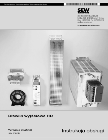 Technika napędowa \ Automatyka napędowa \ Integracja systemów \ Serwisy SEW-EURODRIVE GmbH & Co KG P.O. Box 3023 · D-76642 Bruchsal / Germany Phone +49 7251 75-0 · Fax +49 7251 75-1970 [email protected] www.sew-eurodrive.com Dławiki wyjściowe HD Wydanie 03/2008 1664 5758 / PL Instrukcja obsługi Opcja z dławikiem wyjściowym HD Instalacja dławika wyjściowego HD 1 1 1.1 Opcja z dławikiem wyjściowym HD • Niniejszy dodatek do instrukcji nie zastąpi pełnej instrukcji obsługi! • Prace przy instalacji i uruchamianiu urządzenia mogą być wykonywane tylko przez wykwalifikowanych elektryków przy zachowaniu obowiązujących przepisów w zakresie zapobiegania wypadkom oraz stosowaniu się do instrukcji obsługi! Instalacja dławika wyjściowego HD • Dławik wyjściowy należy zamontować w pobliżu falownika poza strefą minimalnej wolnej przestrzeni. • Przez dławik należy zawsze prowadzić wszystkie 3 fazy kabla silnika [1] (bez PE!). • W przypadku kabla ekranowanego nie wolno prowadzić ekranu przez dławik wyjściowy wraz z innymi kablami. U V W 4 5 6 n=5 HD PE U V W [1] W przypadku dławika wyjściowego HD należy przeprowadzić kabel 5 x przez dławik. W przypadku kabli o dużej średnicy: 2 • 4 nawinięcia z 2 podłączonymi szeregowo dławikami wyjściowymi • 3 nawinięcia z 3 podłączonymi szeregowo dławikami wyjściowymi Instrukcja obsługi – Dławiki wyjściowe HD Opcja z dławikiem wyjściowym HD Dane techniczne dławików wyjściowych HD 1.1.1 1 Instalacja dławika wyjściowego HD012 Zamontować dławik wyjściowy obok właściwego falownika. Poniżej i powyżej dławika wyjściowego należy zachować 100 mm (3.94 in) wolnej przestrzeni. Należy także zapewnić po 10 mm (0.39 cala) wolnej przestrzeni z boku. Do podłączenia przewodu ochronnego oferowane są 3 oznaczone alternatywne możliwości przyłączeniowe. Przewód PE kabla silnikowego można bezpośrednio podłączyć do przetwornicy częstotliwości. 1.1.2 Instalacja dławika wyjściowego HD100 / HD101 Dławik wyjściowy HD100 / HD101 należy zamontować za pomocą dostarczonych śrub razem z przetwornicą częstotliwości MOVITRAC® B na zapewniającej przewodność powierzchni w szafie rozdzielczej. Przyłącza U / V / W posiadają nadrukowane oznaczenie U / V / W i należy je odpowiednio podłączyć. PE L1 L2 L3 PE MOVITRAC® B HD100 / HD101 U V W PE U V W PE M 3 1.2 ~ Dane techniczne dławików wyjściowych HD Za pomocą dławika wyjściowego można zredukować emisję zakłóceń nieekranowanego kabla silnika. Dławik wyjściowy typ Numer katalogowy Maks. strata mocy PVmaks Masa Dla przekrojów kabli Prąd znamionowy Dławik wyjściowy typ Numer katalogowy Maks. strata mocy PVmaks Masa Dla przekrojów kabli Obrotowy moment dociągający Stopień ochrony Instrukcja obsługi – Dławiki wyjściowe HD HD001 HD002 HD003 HD012 813 325 5 813 557 6 813 558 4 1821 217 4 15 W 8W 30 W 11 W 0,5 kg (1 lb) 0,2 kg (0,4 lb) 1,1 kg (2,4 lb) 0,55 kg (1,2 lb) 1,5 – 16 mm2 AWG16 – 6 Â 1,5 mm2 Â AWG16 Ã 16 mm2 Ã AWG6 Â 4 mm2 Â AWG12 – 12 A AC HD004 (dla MOVIDRIVE® wielkość 6) 816 885 7 100 W 12,5 kg (27,6 lb) Trzpień przyłączeniowy M12 20 Nm (180 in-lb) IP20 3 1 Opcja z dławikiem wyjściowym HD Dane techniczne dławików wyjściowych HD Dławik wyjściowy typ Numer katalogowy HD100 HD101 829 837 8 829 838 6 Prąd znamionowy 12 A AC Strata mocy (dla prądu znamionowego) 20 W Temperatura otoczenia –10 °C – +60 °C (+14 – 140 °F) Redukcja 3 % IN przy 40 °C – 60 °C (113 – 140 °F) Stopień ochrony Podłączenie sieci i silnika Podłączenie falownika Masa Możliwość zabudowy spodniej dla wielkości dla MOVITRAC® B ..-5A3 ® dla MOVITRAC B ..-2A3 4 IP20 Zaciski gwintowane 4 mm2 (AWG 10) Przewody z końcówkami izolacyjnymi żył 0,40 kg (0,88 lb) 0,48 kg (1,1 lb) 0S 0L 0005 / 0008 / 0011 / 0015 0022 / 0030 / 0040 0005 / 0008 0011 / 0015 / 0022 Instrukcja obsługi – Dławiki wyjściowe HD Opcja z dławikiem wyjściowym HD Dane techniczne dławików wyjściowych HD 1.2.1 1 Rysunek wymiarowy HD001 / HD002 / HD003 Wymiary w [mm (in)]: Dławik wyjściowy typ HD001 Wymiary główne Wymiary montażowe Średnica wewnętrzna Wymiary otworów A B C a b d e 121 (4,76) 64 (2,5) 131 (5,16) 80 (3,1) 50 (2,0) 50 (2,0) 5,8 (0,23) HD002 66 (2,6) 49 (1,9) 73 (2,9) 44 (1,7) 38 (1,5) 23 (0,91) 5.8 (0,23) HD003 170 (6,69) 64 (2,5) 185 (7,28) 120 (4,72) 50 (2,0) 88 (3,5) 7,0 (0,28) Instrukcja obsługi – Dławiki wyjściowe HD 5 Opcja z dławikiem wyjściowym HD Dane techniczne dławików wyjściowych HD 196 (7.72) Rysunek wymiarowy HD004 Wymiary w [mm (in)]: 359 (14.1) 1.2.2 92 (3.6) 1 120 (4.72) 370 (14.6) 150 (5.91) 400 (15.7) MOVITRAC® B / MOVIDRIVE® B HD004 M ~ 6 Instrukcja obsługi – Dławiki wyjściowe HD Opcja z dławikiem wyjściowym HD Dane techniczne dławików wyjściowych HD Rysunek wymiarowy HD012 Wymiary w [mm (in)]: 130 (5.12) 24 (0.94) 158 (6.22) [1] 178 (7.01) 5 (0.2) 1.2.3 1 5 (0.2) 80 (3.1) 45 (1.8) [1] Długość = 100 mm (3,94 in) Instrukcja obsługi – Dławiki wyjściowe HD 7 Opcja z dławikiem wyjściowym HD Dane techniczne dławików wyjściowych HD 1 1.2.4 Rysunek wymiarowy HD100 / HD101 Wymiary w [mm (in)]: 208.5 (8.209) 80 (3.1) 8 e b d e M5 45 (1.8) Dławik wyjściowy typ MOVITRAC® B b d e HD100 Wielkość 0S 226 (8,90) 248 (9,76) 196 (7,72) HD101 Wielkość 0L 314,5 (12,38) 336,5 (13,25) 284,5 (11,20) Instrukcja obsługi – Dławiki wyjściowe HD