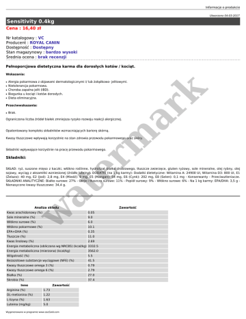 Informacje o produkcie Utworzono 04-03-2017 Sensitivity 0.4kg Cena : 16,40 zł Nr katalogowy : VC Producent : ROYAL CANIN Dostępność : Dostępny Stan magazynowy : bardzo wysoki Średnia ocena : brak recenzji Pełnoporcjowa dietetyczna karma dla dorosłych kotów / kociąt. Wskazania: ● ● ● ● Alergia pokarmowa z objawami dermatologicznymi i/ lub żołądkowo- jelitowymi. Nietolerancja pokarmowa. Choroba zapalna jelit (IBD). Biegunka u kociąt i kotów dorosłych. Dieta eliminacyjna. er m ar k ● Przeciwwskazania: ● Brak. Ograniczona liczba źródeł białek zmniejsza ryzyko rozwoju reakcji alergicznej. Opatentowany kompleks składników wzmacniających barierę skórną. Kwasy tłuszczowe wpływają korzystnie na stan zdrowia przewodu pokarmowego oraz skóry. Składniki wpływające korzystnie na pracę przewodu pokarmowego. Składniki: at SKŁAD: ryż, suszone mięso z kaczki, włókno roślinne, hydrolizat białka drobiowego, tłuszcze zwierzęce, gluten ryżowy, sole mineralne, olej rybny, olej sojowy, wyciąg z aksamitki wzniesionej (źródło luteiny). DODATKI (na 1 kg karmy): Dodatki dietetyczne: Witamina A: 24900 UI, Witamina D3: 800 UI, E1 (Żelazo): 40 mg, E2 (Jod): 2,8 mg, E4 (Miedź): 9 mg, E5 (Mangan): 54 mg, E6 (Cynk): 202 mg, E8 (Selen): 0,1 mg - Konserwanty - Przeciwutleniacze. SKŁADNIKI ANALITYCZNE: Białko surowe: 27% - Oleje i tłuszcze surowe: 11% - Popiół surowy: 9% - Włókno surowe: 6% - Na 1 kg karmy: EPA/DHA: 3,5 g Nienasycone kwasy tłuszczowe: 34,4 g. w Analiza składu Kwas arachidonowy (%) 0.05 Sole mineralne (%) 9.0 Włókno surowe (%) 6.0 Włókno pokarmowe (%) 10.1 EPA+DHA (%) 0.35 Tłuszcze (%) 11.0 Kwas linolowy (%) 2.69 Energia metaboliczna (obliczona wg NRC85) (kcal/kg) 3332.5 Energia metaboliczna (mierzona) (kcal/kg) 3562.0 Wilgotność (%) 5.5 Bezazotowe substancje wyciągowe (NFE) (%) 41.5 Kwasy tłuszczowe omega 3 (%) 0.79 Kwasy tłuszczowe omega 6 (%) 2.79 Białka (%) 27.0 Skrobia (%) 37.4 Inne Zawartość Arginina (%) 1.73 DL-metionina (%) 1.22 L-lizyna (%) 1.63 Luteina (mg/kg) 5.0 Wygenerowano w programie www.oscGold.com Zawartość Metionina - cystyna (%) 1.6 Tauryna (mg/kg) 2900.0 Witaminy Zawartość Biotyna (mg/kg) 3.1 Cholina (mg/kg) 2500.0 Kwas foliowy (mg/kg) 13.8 Witamina A (UI/kg) 27000.0 Witamina B1 (tiamina) (mg/kg) 27.3 Witamina B12 (kobalamina) (mg/kg) 0.14 Witamina B2 (ryboflawina) (mg/kg) 49.1 Witamina B3 (niacyna) (mg/kg) 490.0 Witamina B5 (kwas pantotenowy) (mg/kg) 146.5 76.4 Witamina C (mg/kg) 200.0 Witamina D3 (UI/kg) 800.0 Witamina E (mg/kg) 600.0 Sole mineralne Zawartość Wapń (%) 1.62 Chlor (%) 1.29 Miedź (mg/kg) 15.0 Jod (mg/kg) 3.3 Żelazo (mg/kg) 174.0 Magnez (%) 0.06 Mangan (mg/kg) 64.0 1.17 Potas (%) 0.8 Selen (mg/kg) 0.27 Sód (%) 0.8 Cynk (mg/kg) 242.0 w at Fosfor (%) er m ar k Witamina B6 (pirydoksyna) (mg/kg)