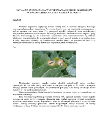 AKTUALNA SYGNALIZACJA WYSTĘPOWANIA CHORÓB I SZKODNIKÓW W UPRAWACH ROLNICZYCH NA DZIEŃ 16.10.2014r. RZEPAK Warunki pogodowe odgrywają bardzo ważną rolę w rozwoju patogena, będącego sprawcą suchej zgnilizny kapustnych. Na rozwój choroby wpływa wilgotność powietrza, ilość i rozkład opadów oraz temperatura. Przy panującej wysokiej wilgotności oraz umiarkowanej temperaturze powietrza bardzo szybko dojrzewają owocniki z zarodnikami workowymi. Opady deszczu przyczyniają się do kiełkowania zarodników oraz rozprzestrzeniania się infekcji. Minimalny czas niezbędny do wystąpienia infekcji wynosi około 8 godzin, a optymalny około 4 doby. Objawami choroby są jasnobrązowe, owalne plamy na powierzchni liści. Przy obecnych warunkach nie należy zapomnieć o systematycznej lustracji pola. Fot. Monitorując plantacje rzepaku można określić szkodliwość suchej zgnilizny kapustnych. W tym celu należy analizować w 4-6 punktach pola po 25 roślin, a następnie obliczyć procent roślin porażonych. Na plantacjach powyżej 2 ha należy zwiększyć liczbę punktów o 1 na każdy następny hektar. Objawy porażenia na liściach mogą być mylone z objawami czerni krzyżowych, czy też mączniaka rzekomego. Przy wysokiej wilgotności powietrza powyżej 95%, opadach deszczu rośliny rzepaku porażane są przez grzyby z rodzaju Alternaria spp. Infekcji sprzyjają również uszkodzenia wywołane żerowaniem mszycy kapuścianej, która na niektórych plantacjach występuje dość licznie. Zabieg ochronny przeciwko czerni krzyżowych należy wykonać na rośliny występujące w fazie 4-8 liści, po zaobserwowaniu 20-30% liści z objawami choroby. Fot. Opady deszczu, wysoka wilgotność powietrza oraz temperatura nieco powyżej 10oC sprzyjają rozwojowi szarej pleśni. Największe szkody patogen wyrządza w czasie wilgotnej i chłodnej pogody, gdyż w takich warunkach infekcja zachodzi w ciągu kilku godzin. Objawem porażenia jest szarobrązowy nalot na blaszkach liściowych, na których rozpoczyna się proces gnilny. Ciepła jesień z niewielką ilością opadów sprzyja licznemu występowaniu mszycy kapuścianej. Jednakże w przypadku wystąpienia opadów deszczu rozwój tych szkodników może ulec zahamowaniu, co wpłynie na ograniczenie populacji mszyc. Żerowanie mszyc na roślinach rzepaku nie tylko prowadzi do zahamowania ich wzrostu, ale zwiększa podatność roślin na infekcje grzybowe. Podczas monitoringu można zaobserwować pojedyncze formy uskrzydlone oraz liczniej występujące formy bezskrzydłe, których ciało pokryte jest szarobiałym nalotem. Obserwacje należy prowadzić od wschodów rzepaku. Zabieg należy wykonać przede wszystkim w pasie brzegowym plantacji po stwierdzeniu 2 kolonii mszyc na 1m 2 rzepaku w fazie 4-9 liści (BBCH 14-19). Fot. Ze złożonych przez samice miniarki kapuścianki jaj rozwijają się larwy. Larwy miniarki uszkadzają blaszkę liściową, co prowadzi do jej więdnięcia. Na skutek wygryzienia przez larwy tkanki miękiszowej pod skórką widoczne są miny po obu stronach blaszki liściowej. Początkowo przebiegają one wzdłuż nerwu liścia, a następnie wnikają do niego. Często chodniki powstałe na skutek żerowania form larwalnych tego szkodnika przybierają nieregularne kształty. Ocenę szkodliwości tego szkodnika przeprowadza się jesienią na rzepaku ozimym, kiedy rośliny znajdują się w fazie 5-9 liści. Należy analizować po 25 roślin, wybranych losowo z różnych części pola, a następnie obliczyć liczbę i procent uszkodzonych roślin. Fot. Bielinek rzepnik jest motylem niewiele mniejszym od bielinka kapustnika. Skrzydła o barwie białej, z czarną plamą przy wierzchołku. Na wierzchu skrzydła jedna czarna (u samca) lub dwie czarne plamki (u samicy). Spód tylnego skrzydła żółty. Gąsienice drugiego pokolenia żerują również w październiku. Zabieg ochronny należy przeprowadzić jesienią w fazie 3 - 6 liści, po stwierdzeniu 1 gąsienicy na 1mb rzędu. Aby określić szkody wywołane żerowaniem gąsienic należy analizować po 25 roślin rzepaku w fazie 3-6 liści w losowo wybranych punktach pola, a następnie na podstawie uzyskanych danych obliczyć procent uszkodzonych roślin. Utrzymująca się ostatnio wysoka wilgotność powietrza, opady deszczu oraz pochmurne dni sprzyjają intensywnemu żerowaniu ślimaków nagich. W przypadku wystąpienia przez dłuższy okres warunków pogodowych sprzyjających żerowaniu szkodników, można spodziewać się wysokiej liczeby ślimaków, która utrzyma się do końca miesiąca. W celu ustalenia liczebności szkodnika należy w 10 punktach pola określić średnią liczbę ślimaków na 1m2 powierzchni. Obserwacje można przeprowadzać w pochmurne dni lub późnym popołudniem. Inną metodą monitoringu ślimaków jest stosowanie pułapek, które umieszcza się losowo na plantacji, zwłaszcza z uwzględnieniem wilgotnych obszarów. W rzepaku zabieg należy wykonać w fazie 2-5 liści oraz w fazach późniejszych, po stwierdzeniu obecności średnio 4 i więcej ślimaków na pułapkę. Ocenę szkodliwości ślimaków należy rozpocząć zaraz po zaobserwowaniu pierwszych objawów żerowania. W tym celu zaleca się obserwować w 10-15 miejscach plantacji wzdłuż losowo wybranego rzędu po 10 roślin w fazie 2 lub więcej liści. Następnie w każdym wyznaczonym miejscu należy obliczyć średni procent uszkodzonych roślin. Fot. Infekcjom i rozprzestrzenianiu się choroby jaką jest mączniak rzekomy sprzyja umiarkowana temperatura, wysoka wilgotność . Na górnej stronie porażonej blaszki liściowej widoczne są żółte plamy z ciemnymi obwódkami, natomiast na dolnej stronie widoczny jest szarobiały nalot. Ocenę szkodliwości mączniaka rzekomego kapustnych przeprowadza się analizując po 25 roślin w 4-6 losowo wybranych miejscach pola, a następnie określa się procent porażonych roślin. Fot. ZBOŻA OZIME Również na plantacjach zbóż ozimych