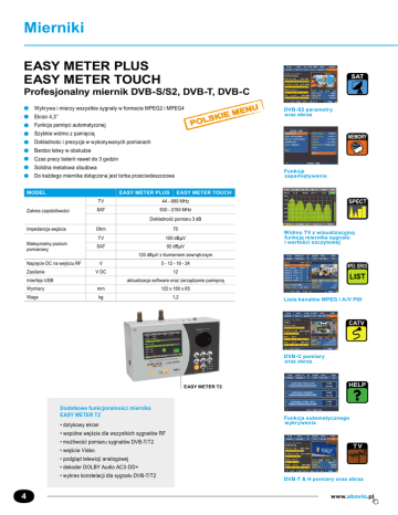 Mierniki EASY METER PLUS EASY METER TOUCH Profesjonalny miernik DVB-S/S2, DVB-T, DVB-C Wykrywa i mierzy wszystkie sygnały w formacie MPEG2 i MPEG4 Ekran 4,3’’ DVB-S2 parametry oraz obraz Funkcja pamięci automatycznej Szybkie widmo z pamięcią Dokładnośc i precyzja w wykonywanych pomiarach Bardzo łatwy w obsłudze Czas pracy baterii nawet do 3 godzin Solidna metalowa obudowa Funkcje zapamiętywania Do każdego miernika dołączona jest torba przeciwdeszczowa MODEL EASY METER PLUS Zakres częstotliwości EASY METER TOUCH TV 44 - 880 MHz SAT 930 - 2150 MHz Dokładność pomiaru 3 dB Impedancja wejścia Maksymalny poziom pomiarowy Ohm 75 TV 100 dBµV SAT 92 dBµV Widmo TV z wizualizacyjną funkcją miernika sygnału i wartości szczytowej 120 dBµV z tłumieniem zewnętrznym Napięcie DC na wejściu RF Zasilanie V 5 - 12 - 18 - 24 V DC 12 Interfejs USB aktualizacja software oraz zarządzanie pamięcią Wymiary mm 120 x 180 x 65 Waga kg 1,2 Lista kanałów MPEG i A/V PID DVB-C pomiary oraz obraz EASY METER T2 Dodatkowe funkcjonalności miernika EASY METER T2 • dotykowy ekran Funkcja automatycznego wykrywania • wspólne wejście dla wszystkich sygnałów RF • możliwość pomiaru sygnałów DVB-T/T2 • wejście Video TV • podgląd telewizji analogowej • dekoder DOLBY Audio AC3-DD+ • wykres konstelacji dla sygnału DVB-T/T2 4 DVB-T & H pomiary oraz obraz www.abovio.pl